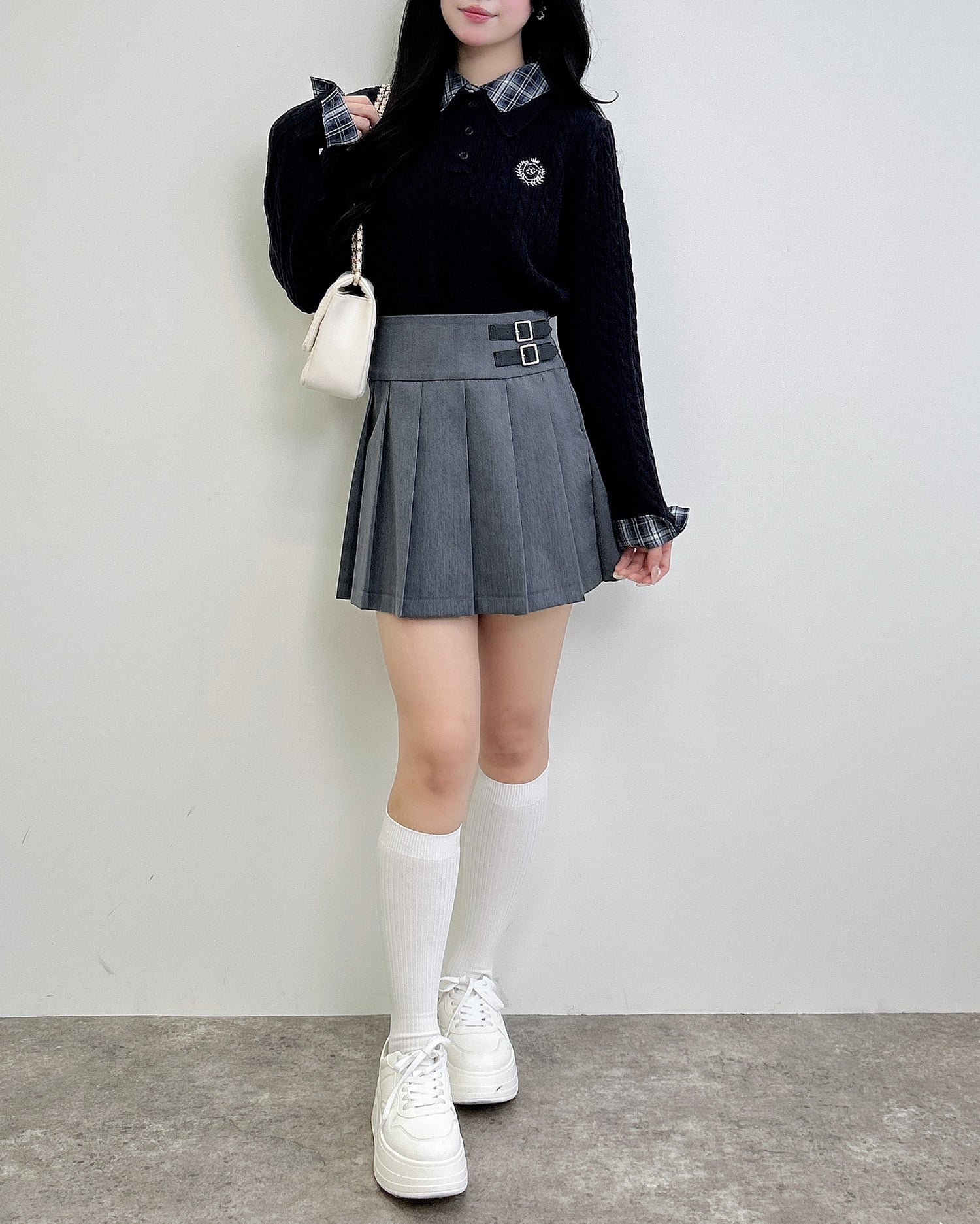 プリーツスカートと合わせるのが定番トレンドコーデ。