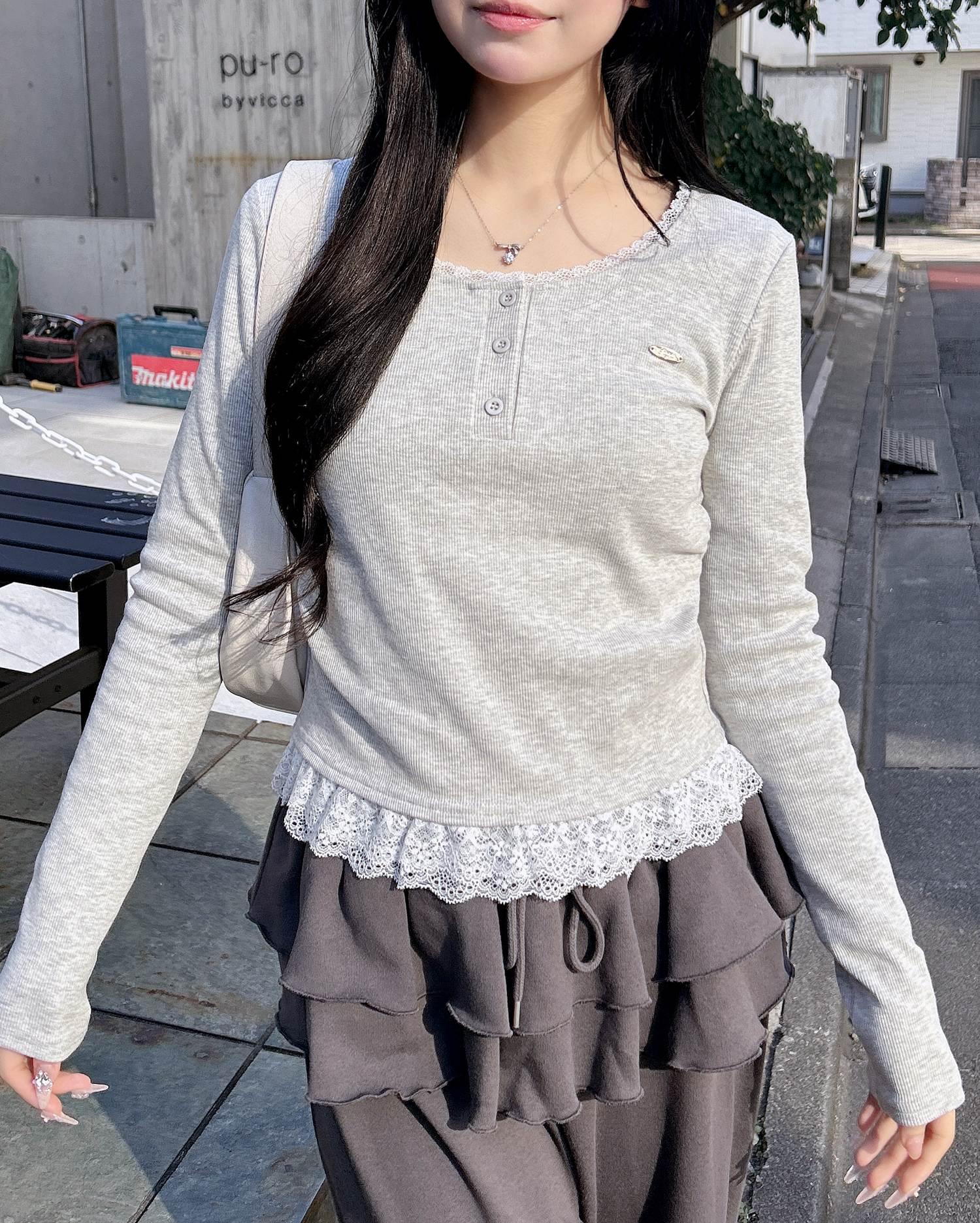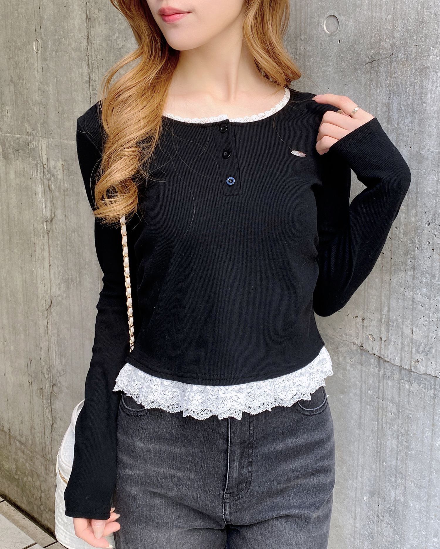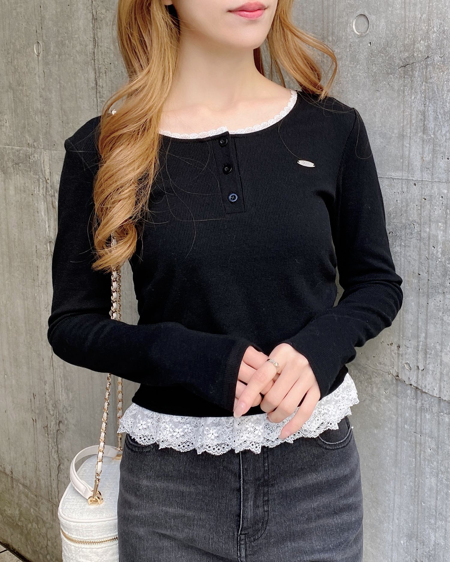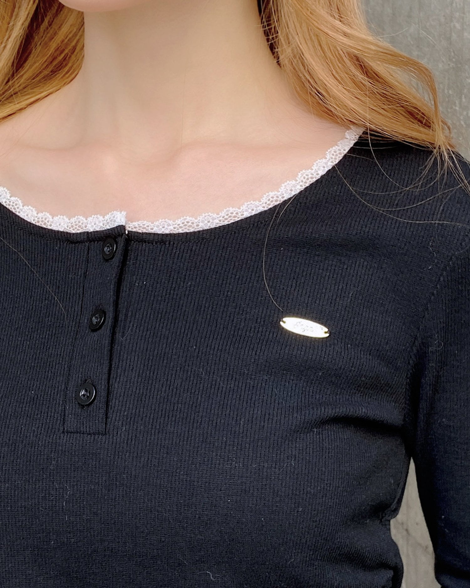 【すっきりと開いたヘンリーネックにレースをあしらったカジュアルガーリーなトップス】
