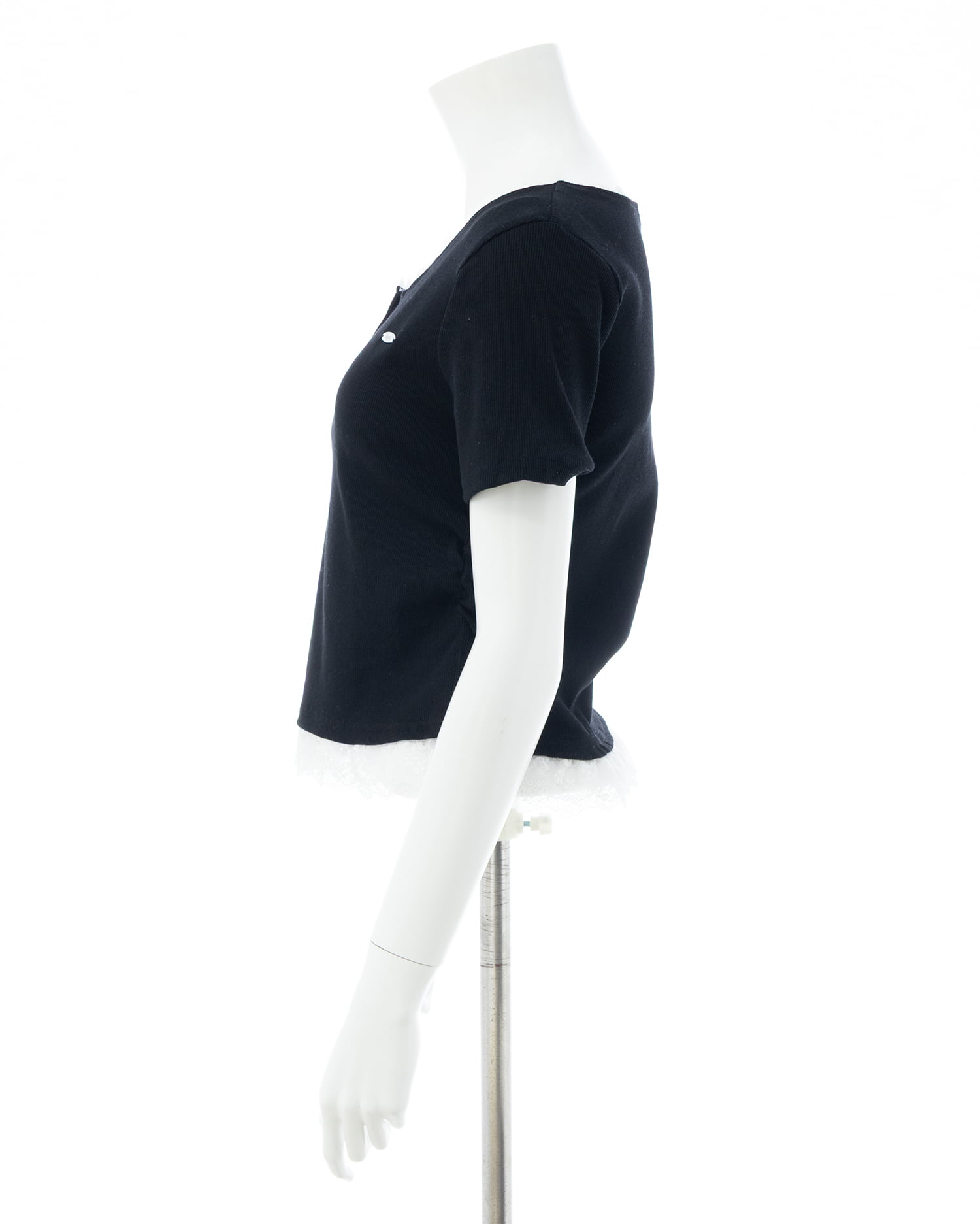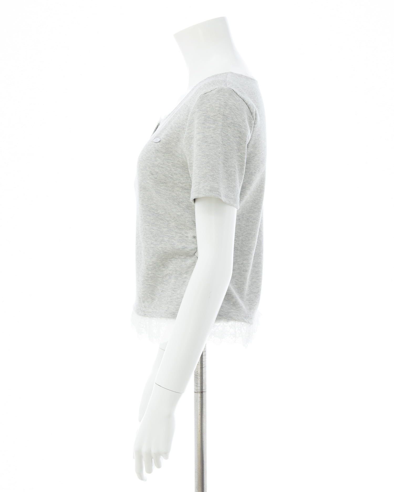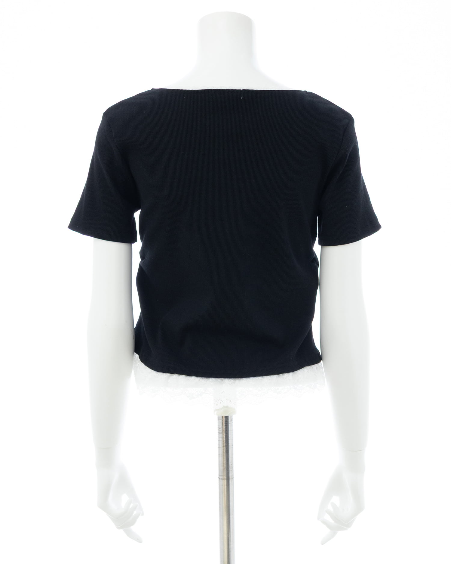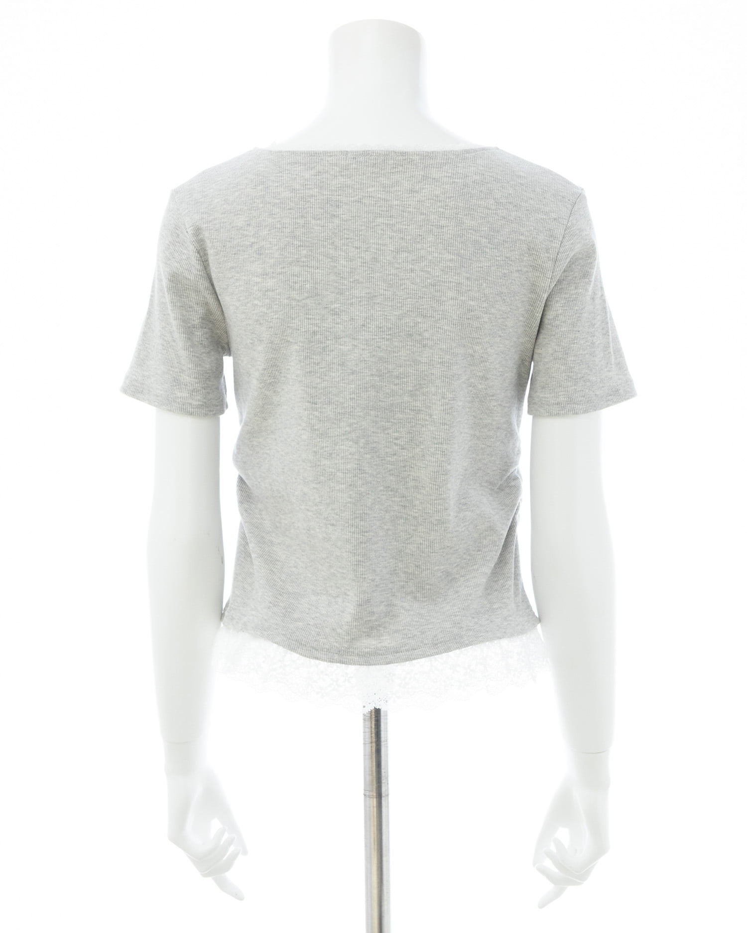 ネックラインや裾部分に繊細なレースをあしらったリブトップス。