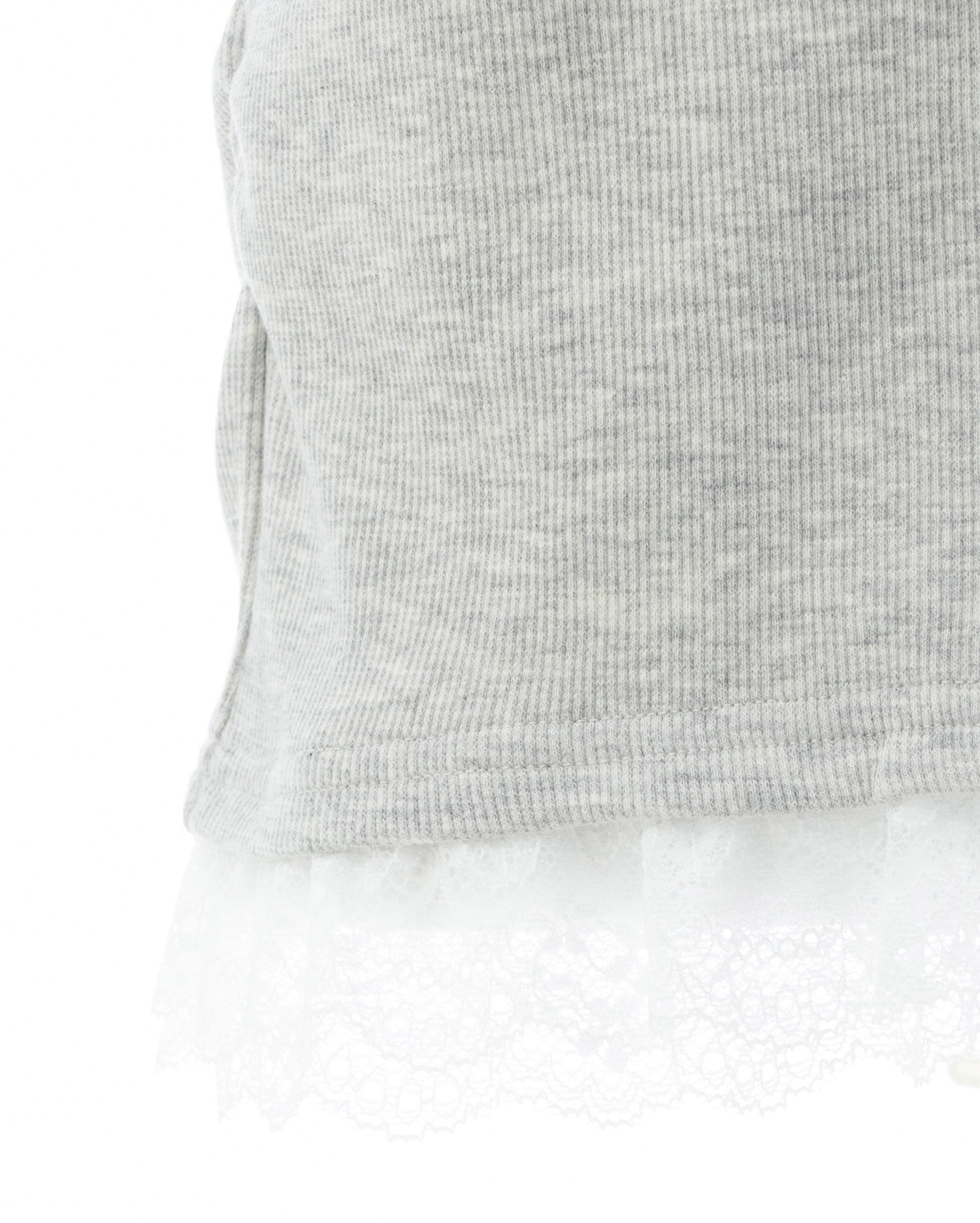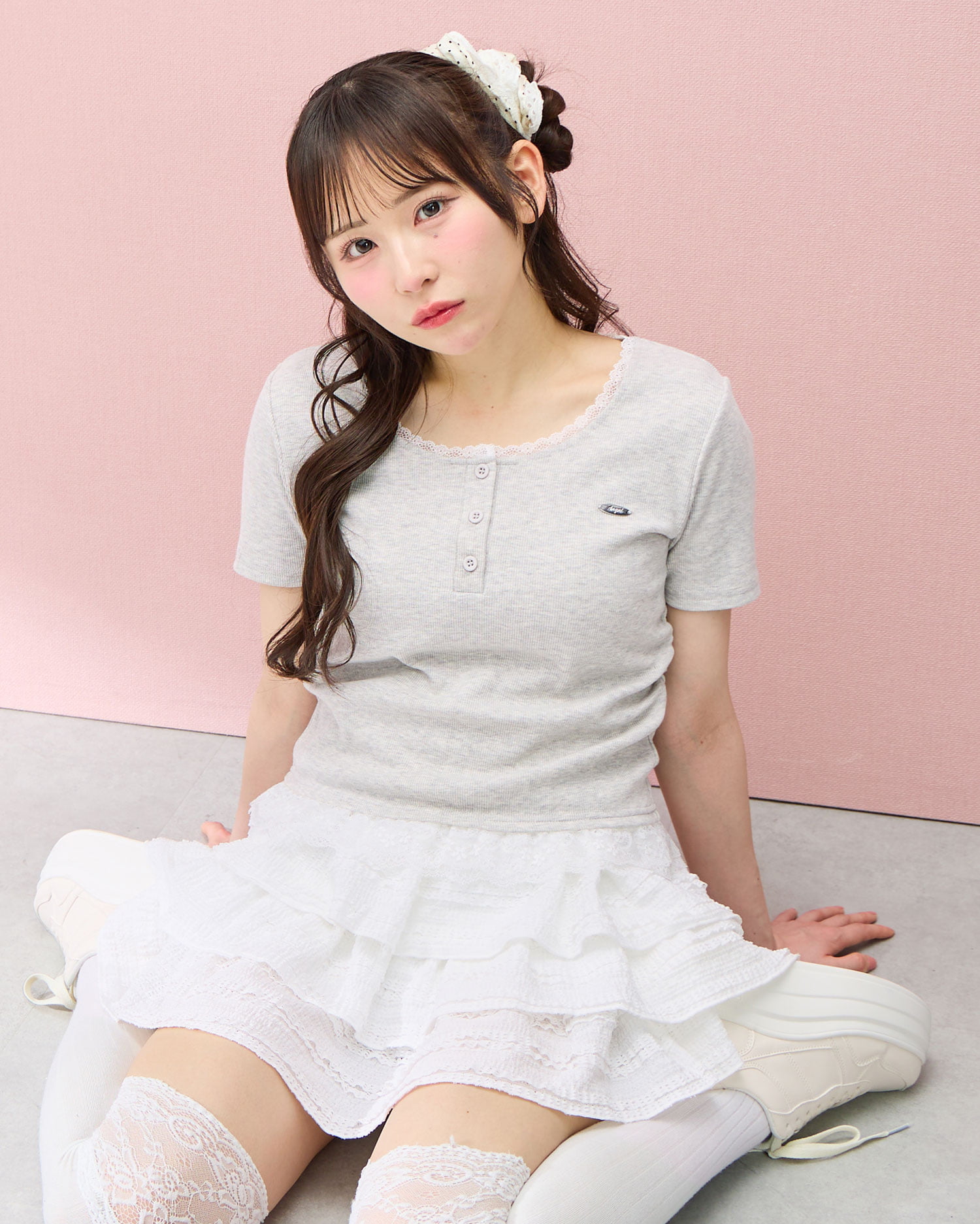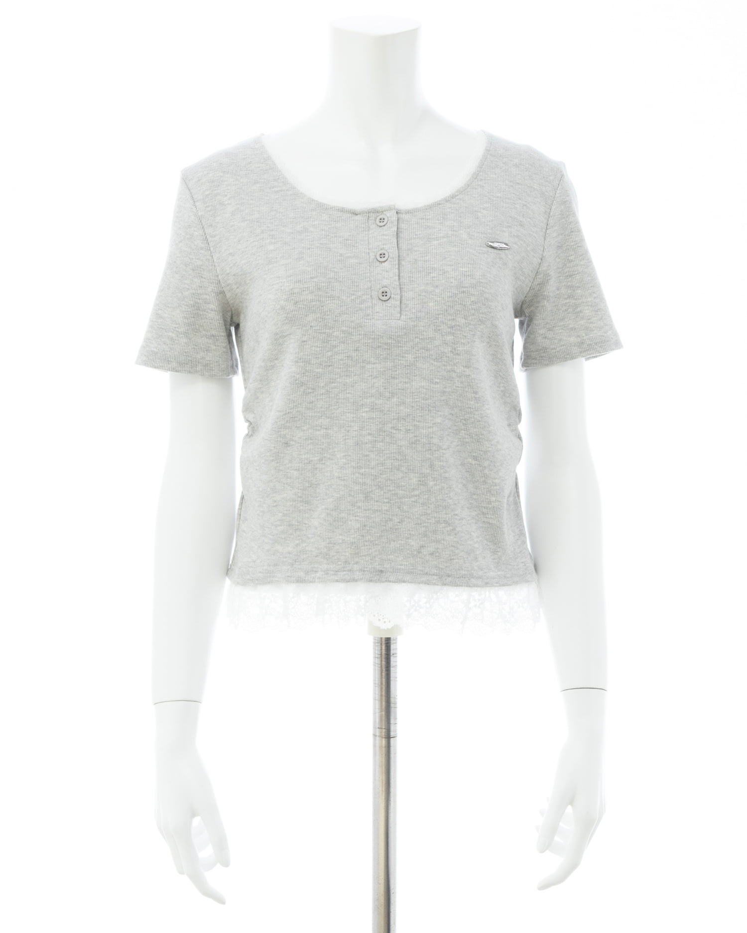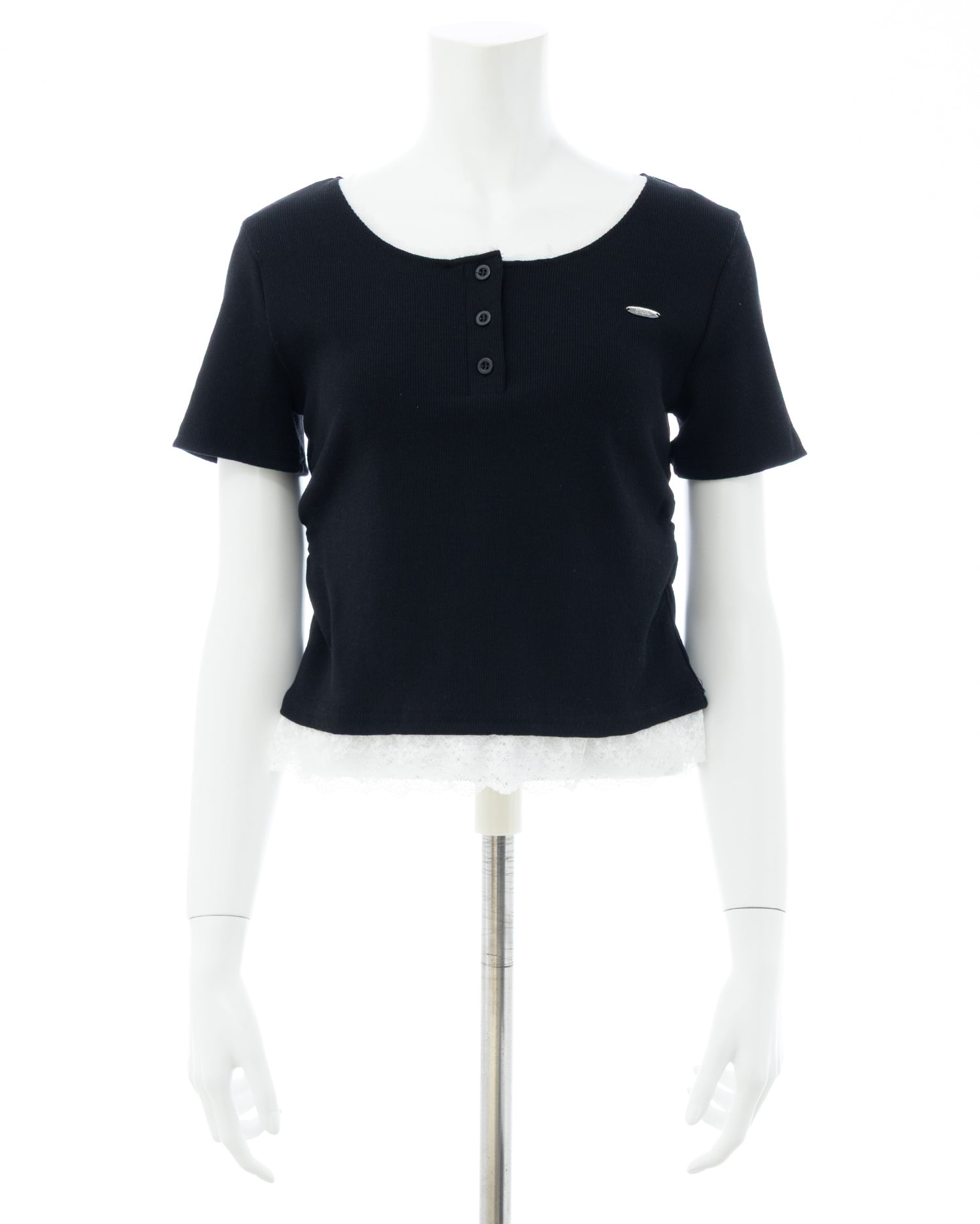 ネックラインや裾部分に繊細なレースをあしらったリブトップス。