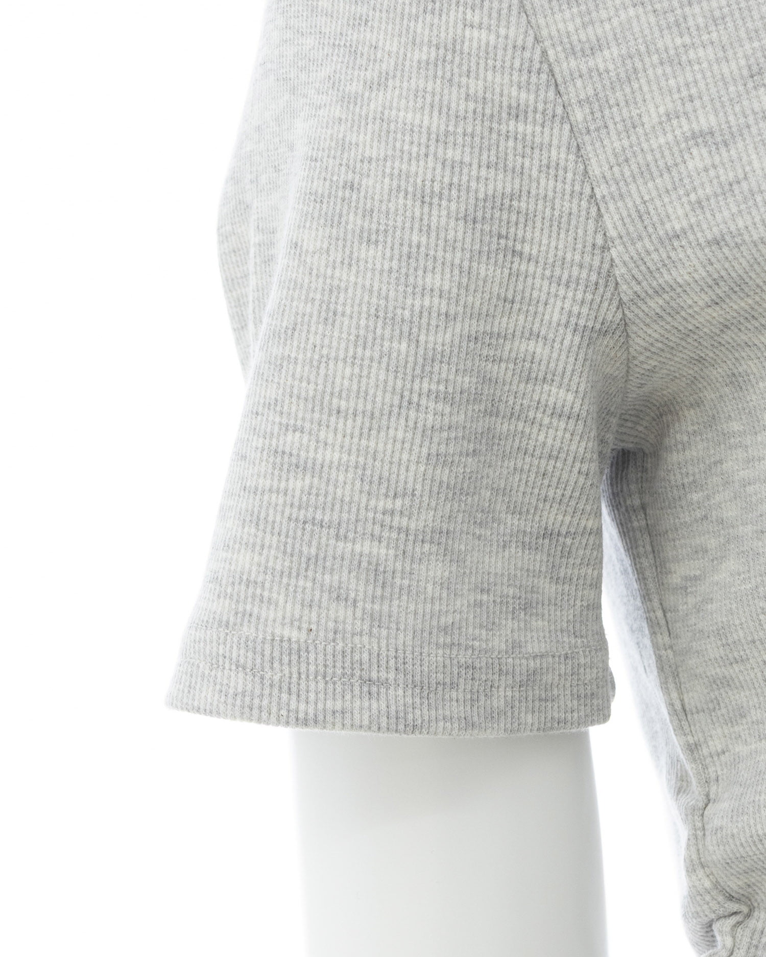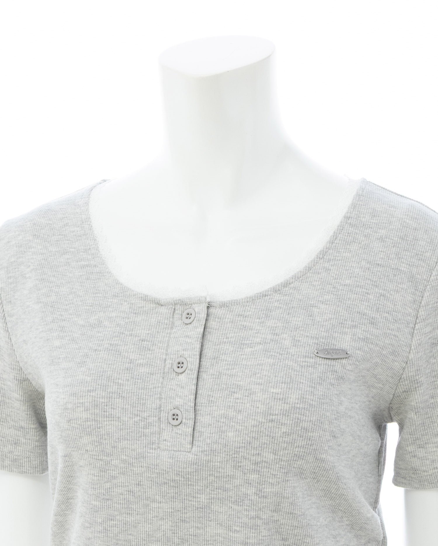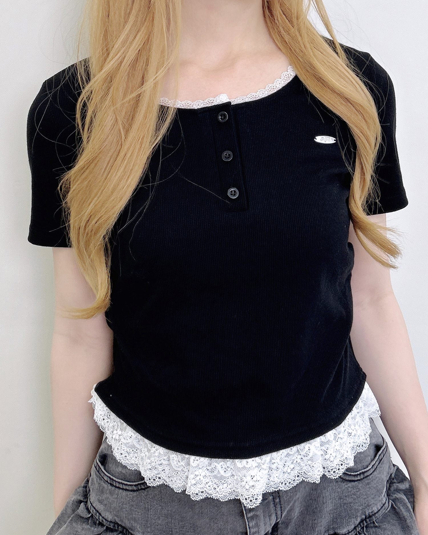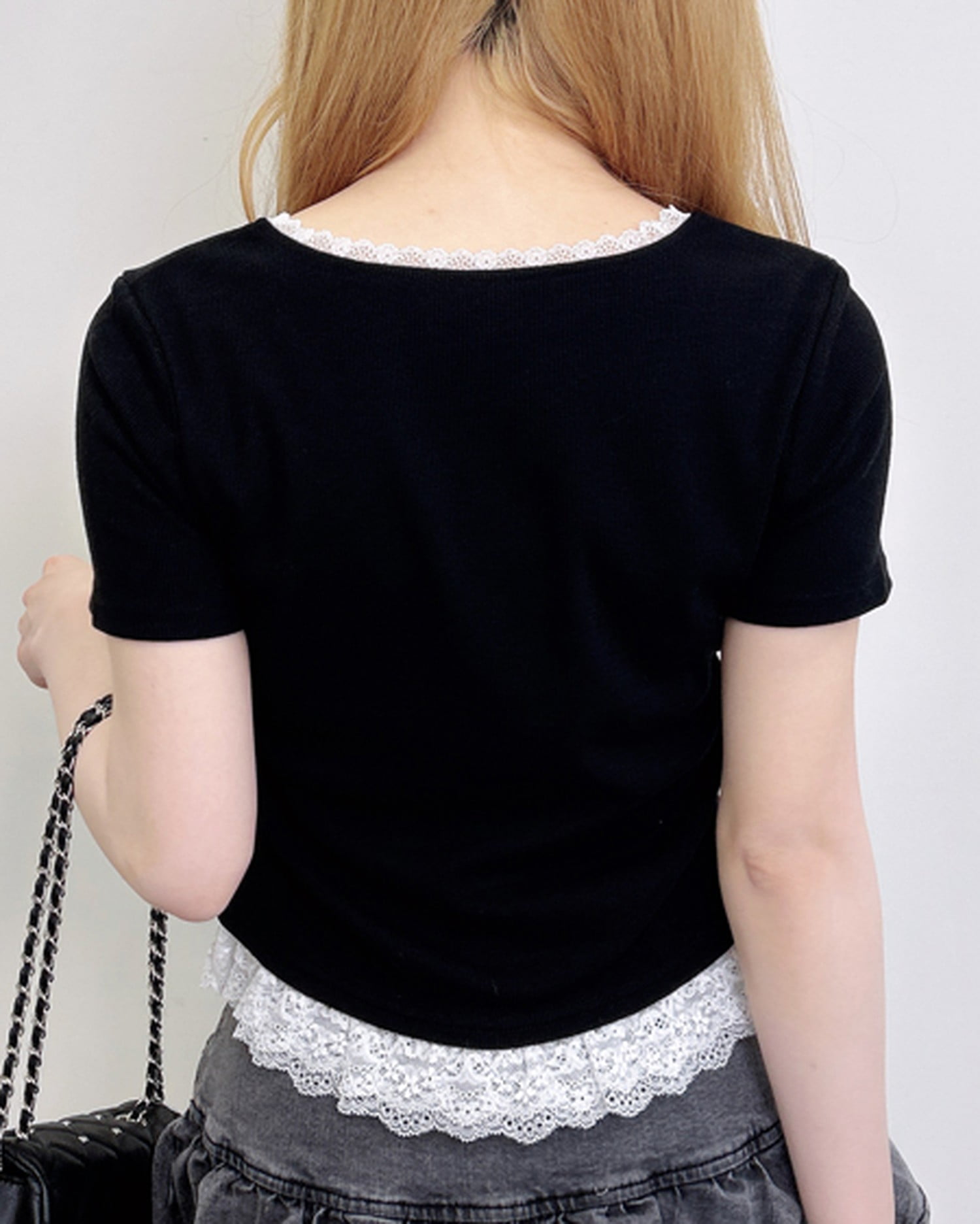 ネックラインや裾部分に繊細なレースをあしらったリブトップス。