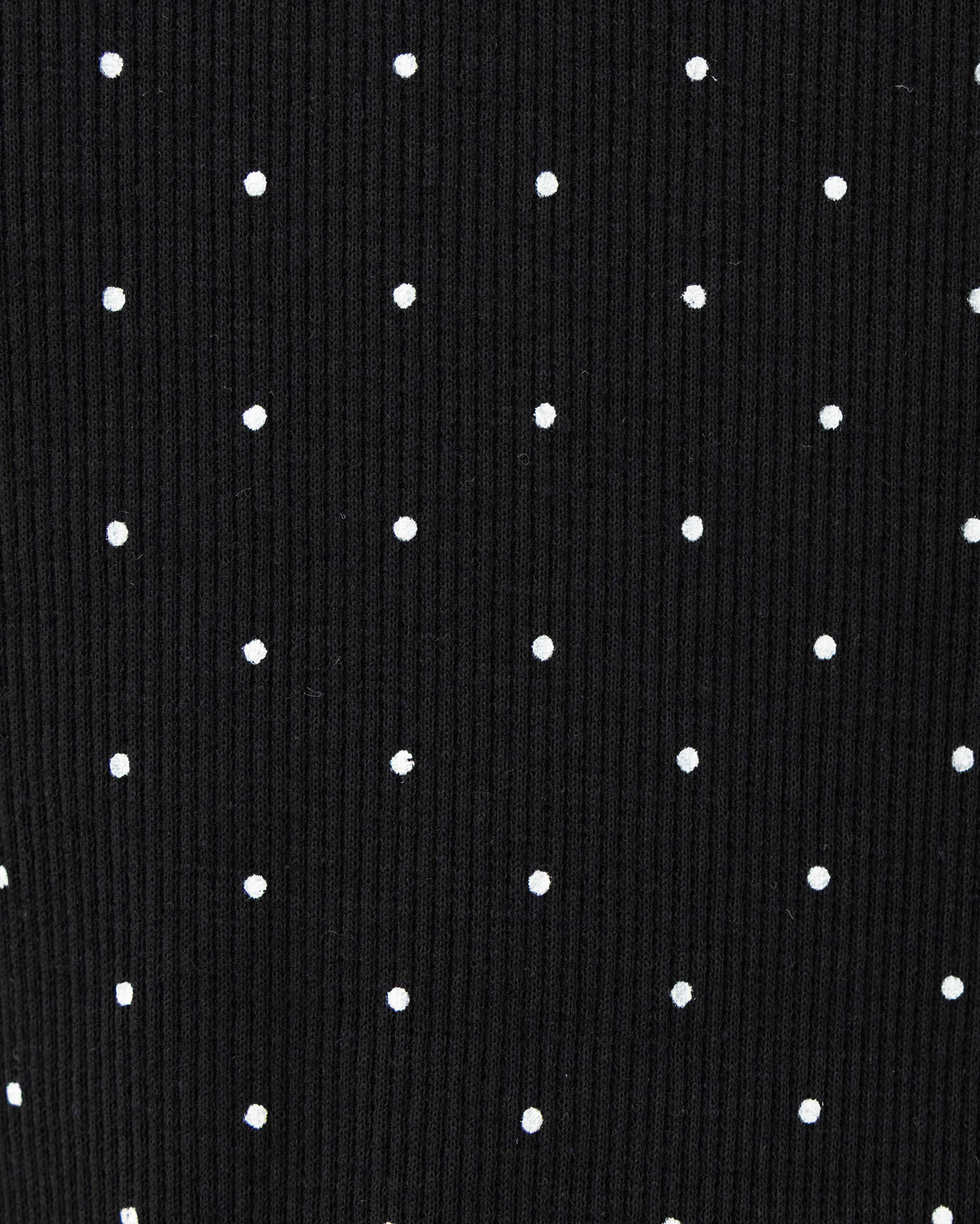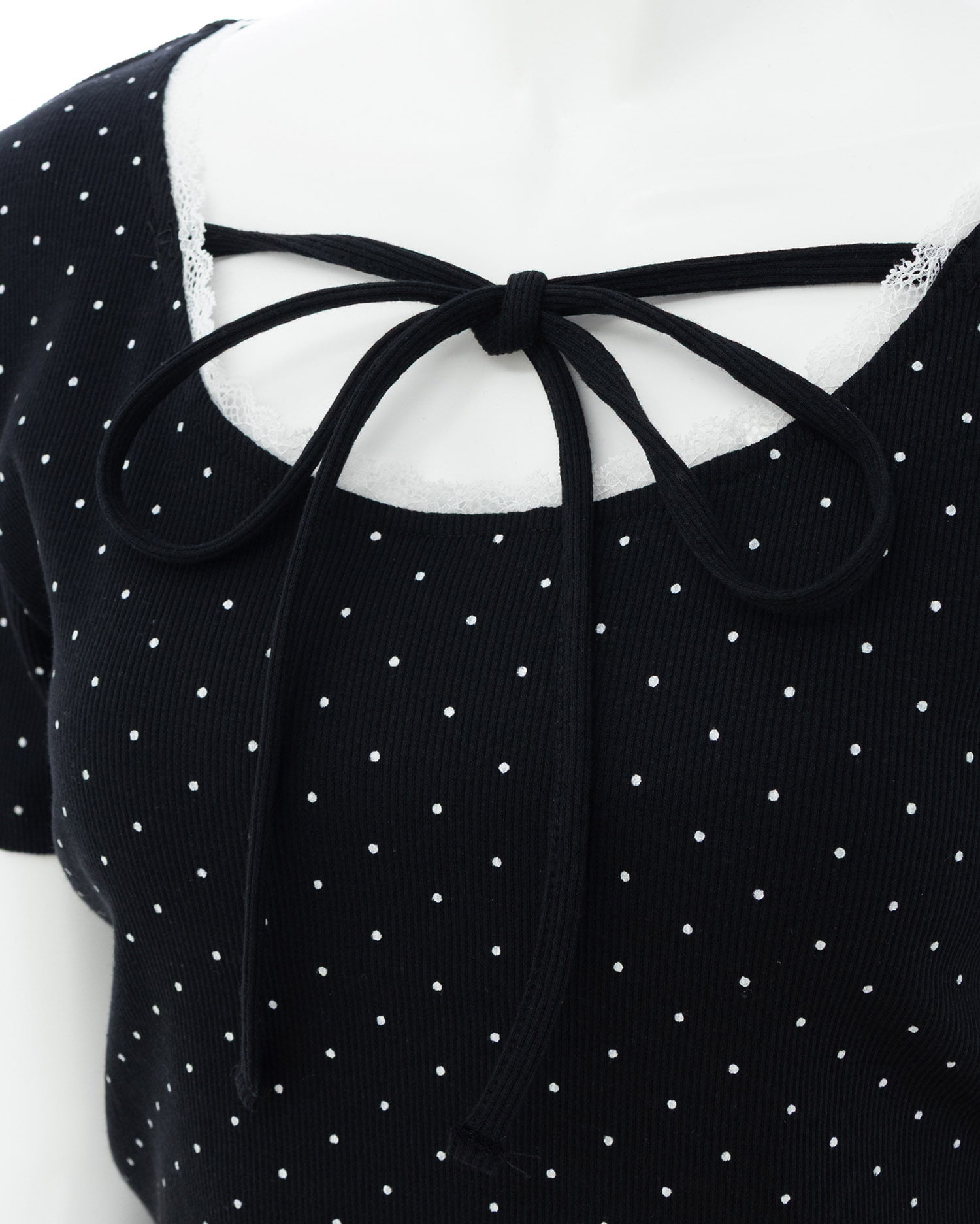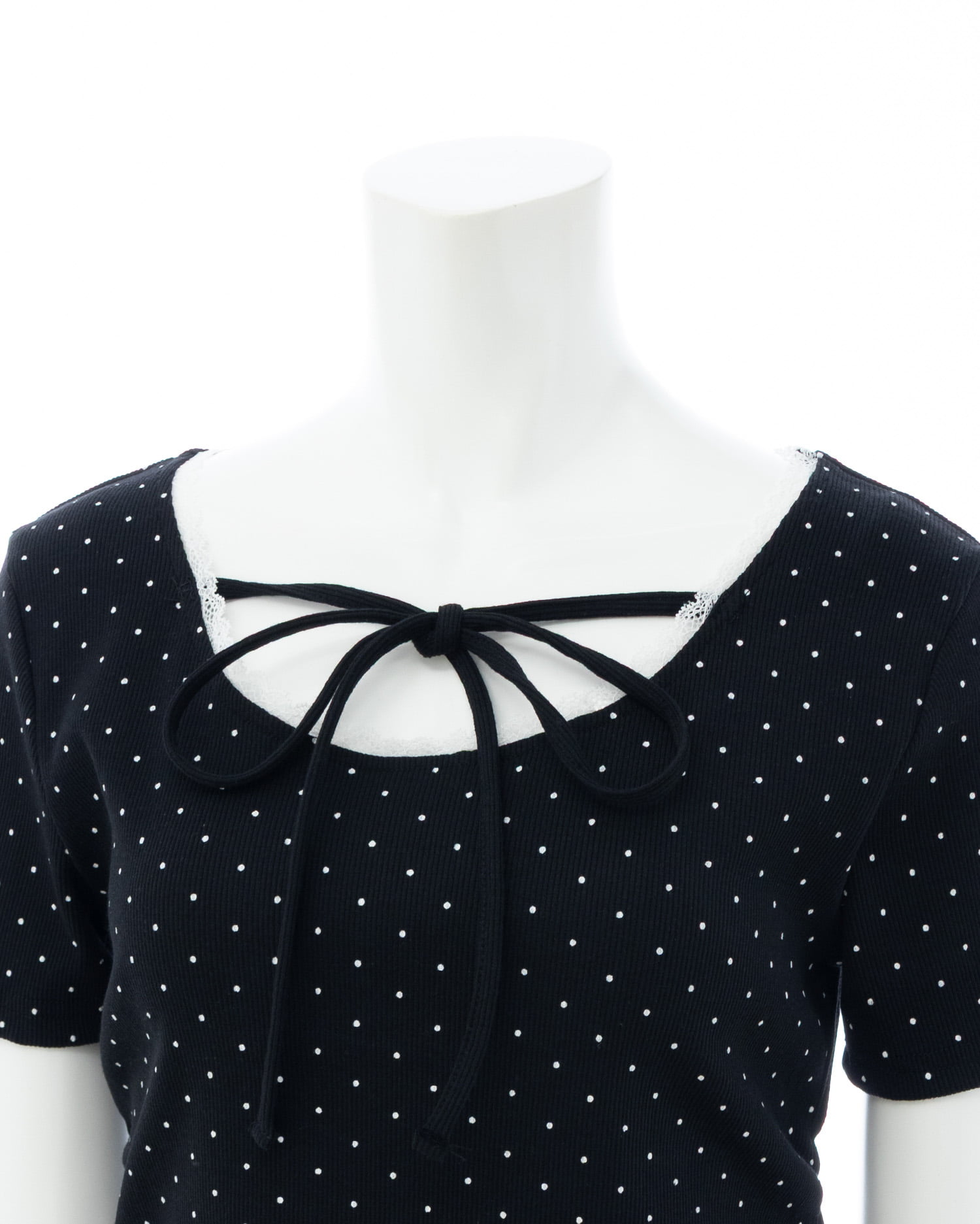広めに開いたネックラインにはデコルテ部分で結ぶリボンをオン。