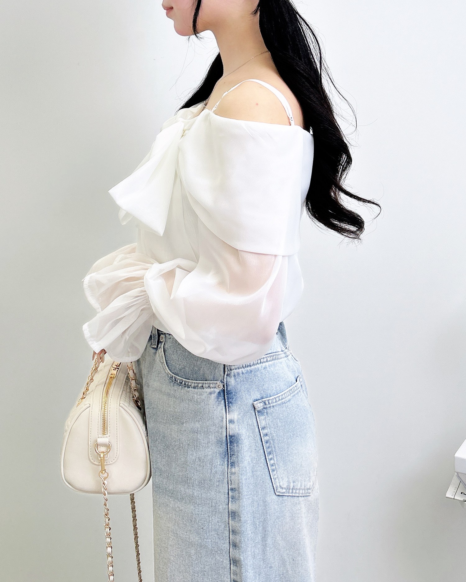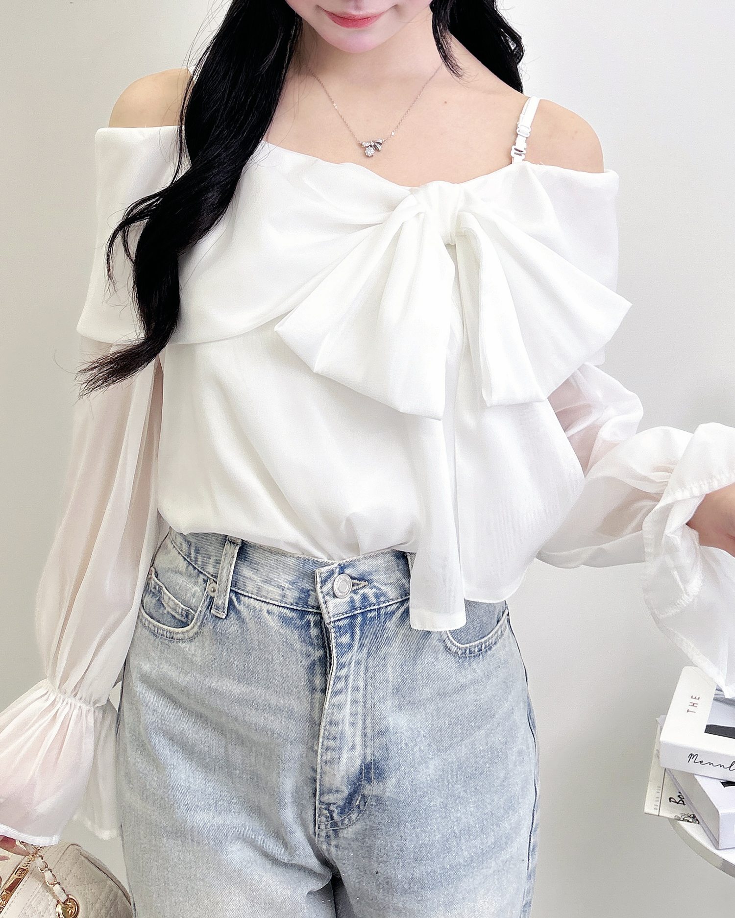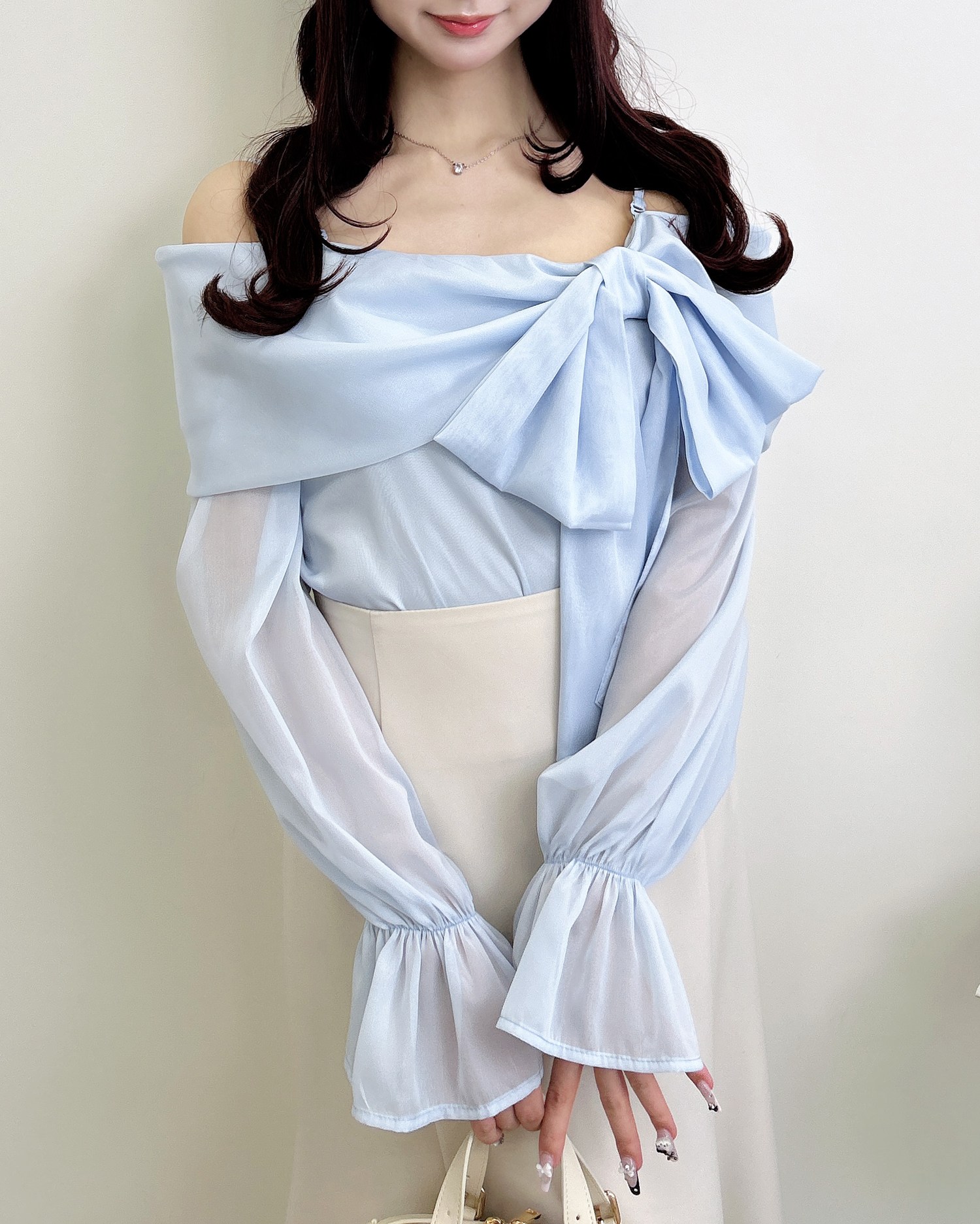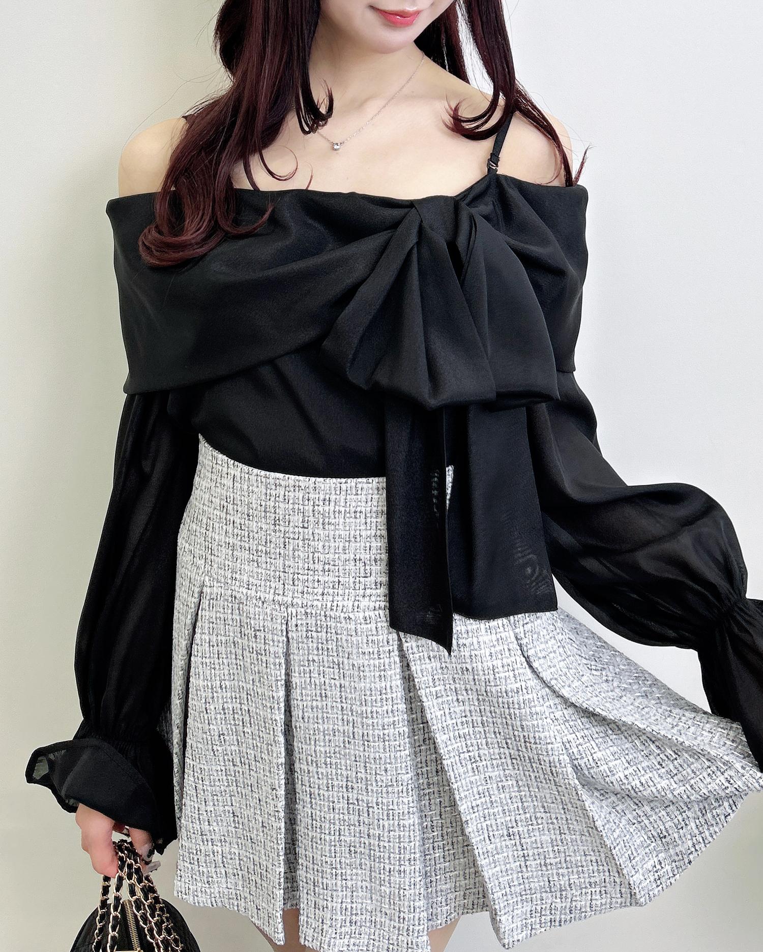 【シアー素材とリボンがかわいらしいオフショルブラウス】