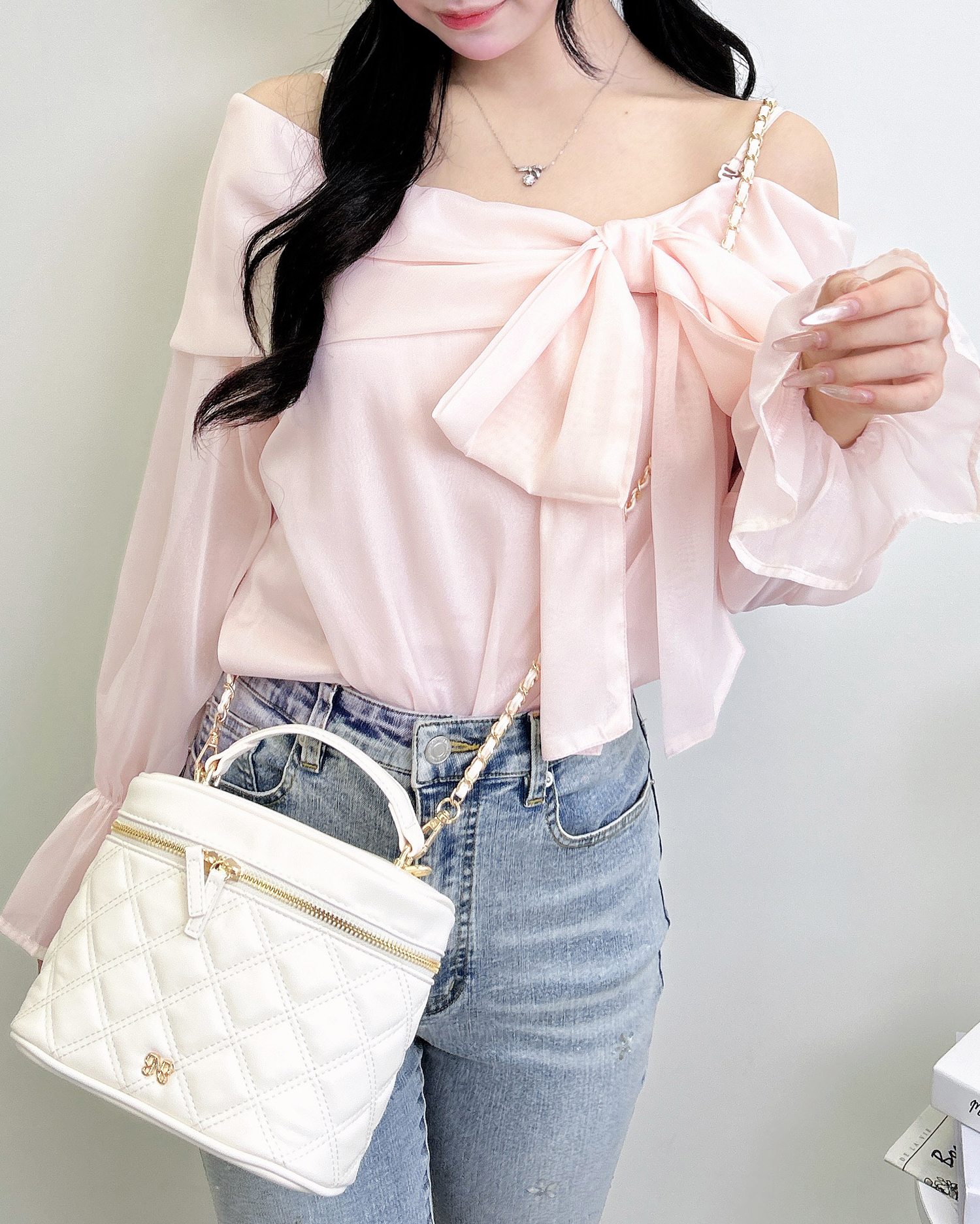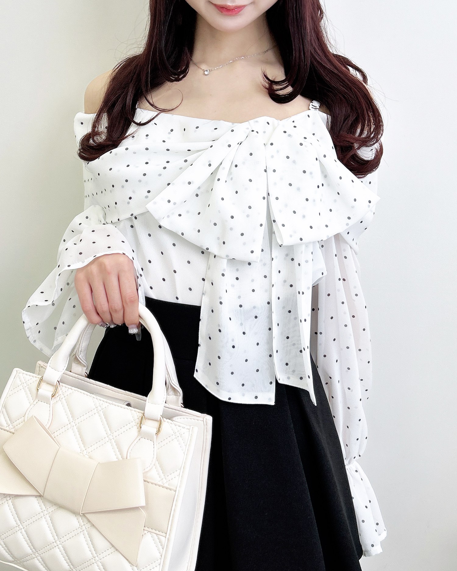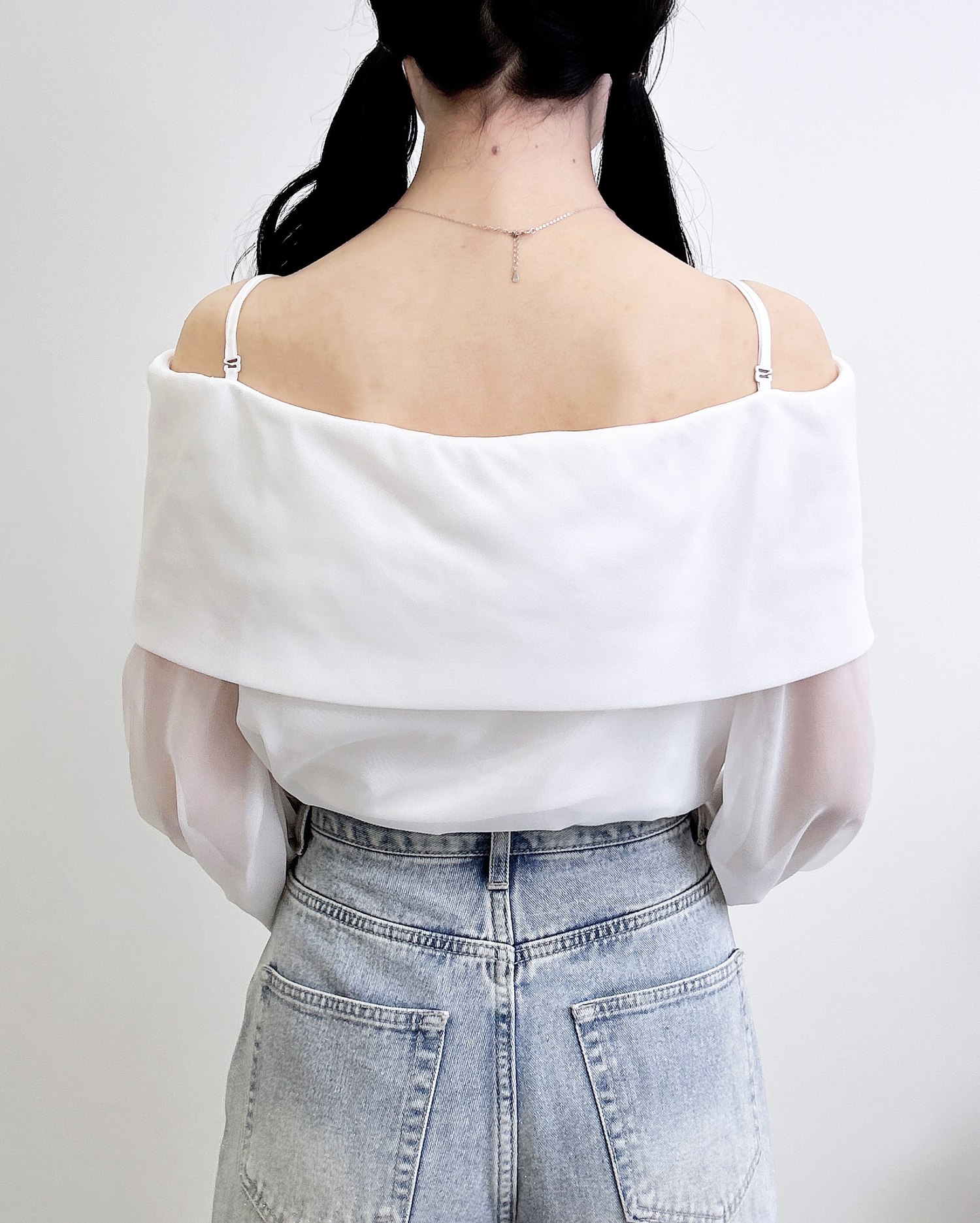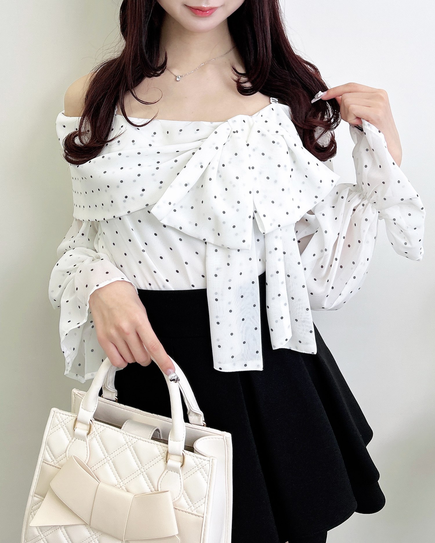【シアー素材とリボンがかわいらしいオフショルブラウス】