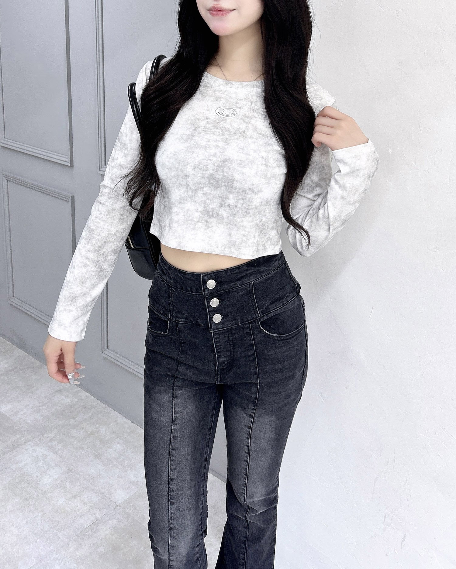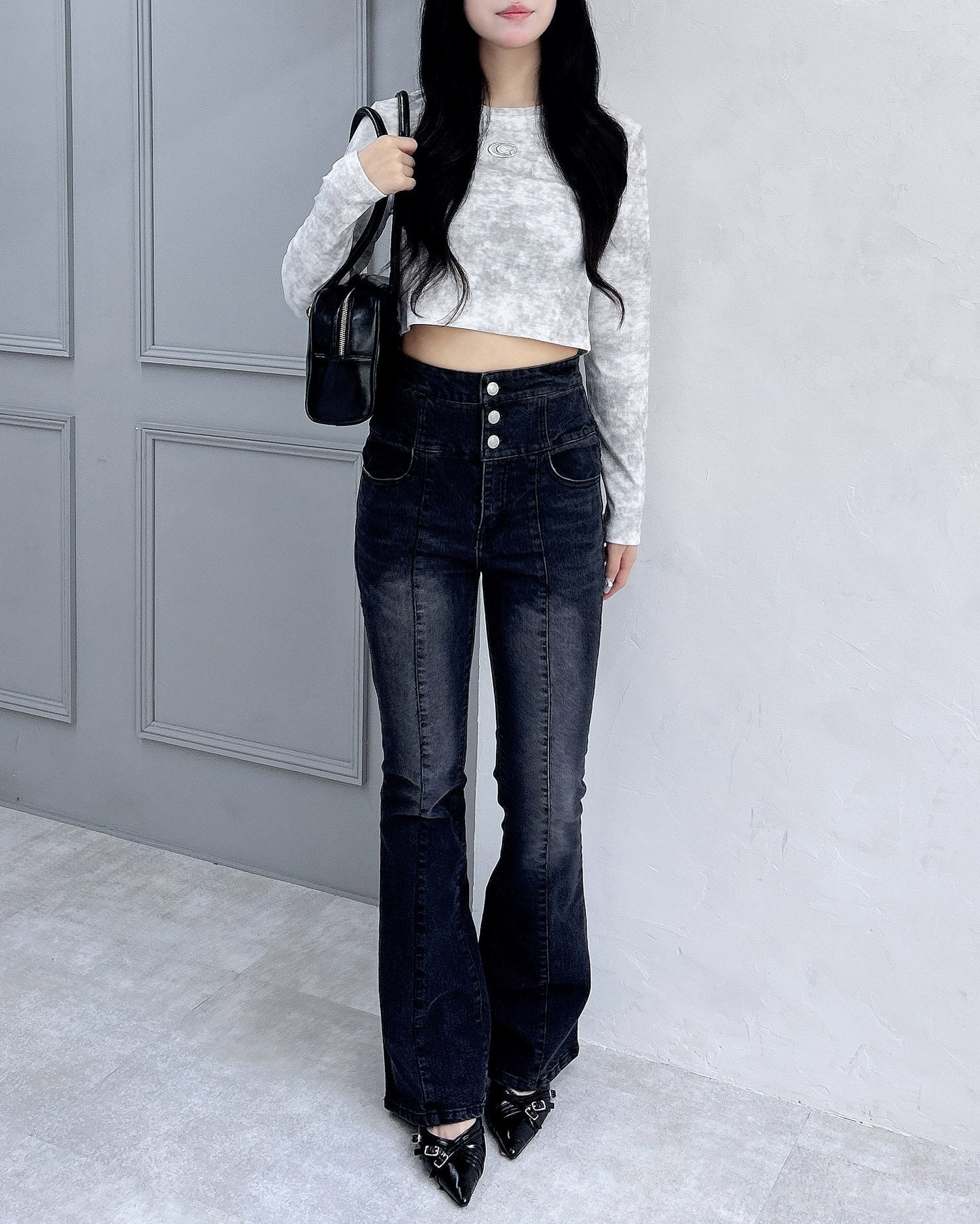 ハイウエストデザインなので、トレンドのショート丈トップスにもバランス良く合わせられるのが◎。