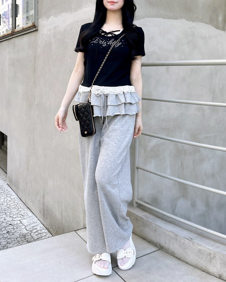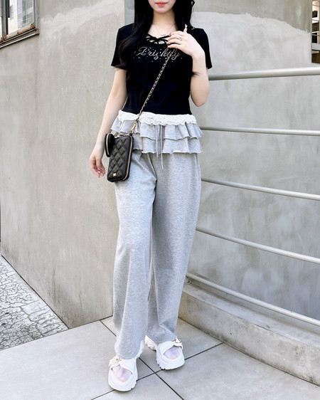 ルーズなシルエットのスウェットパンツにフリルを合わせた