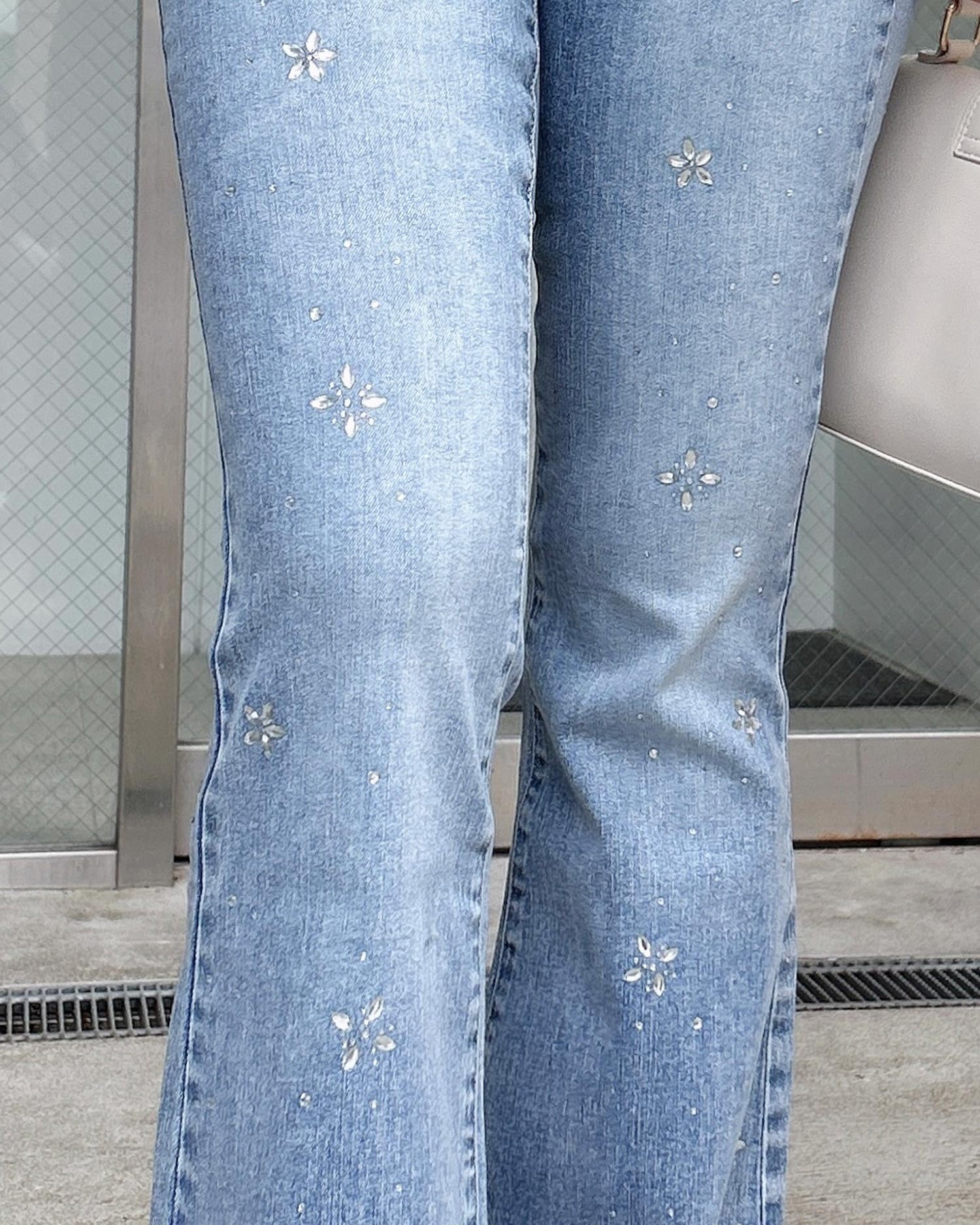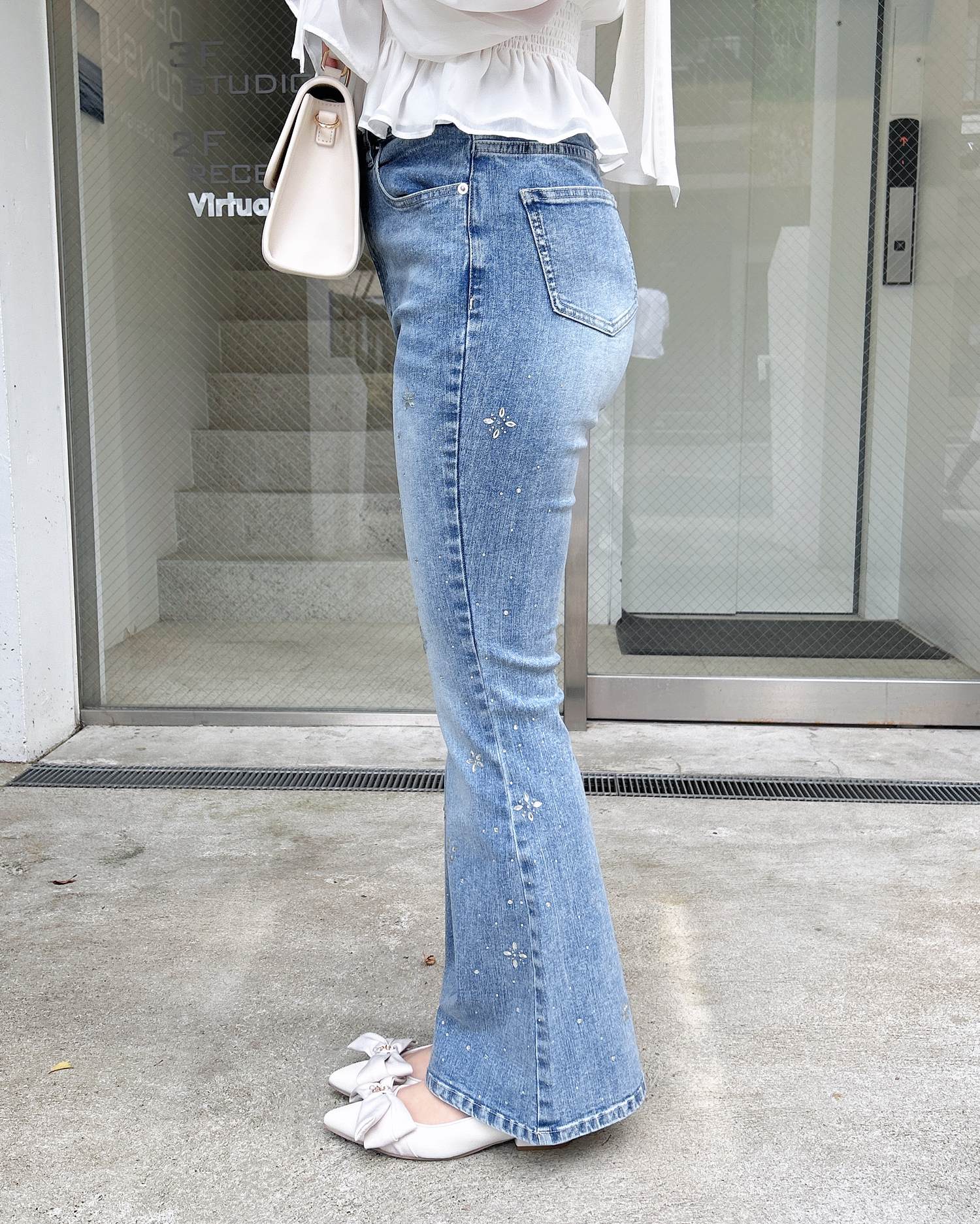 キラッと光る存在感のあるビジューが付いたデニムパンツ。