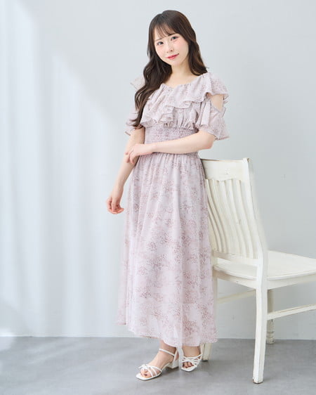 フリルたっぷりのデザインと肩開きのデザインで
