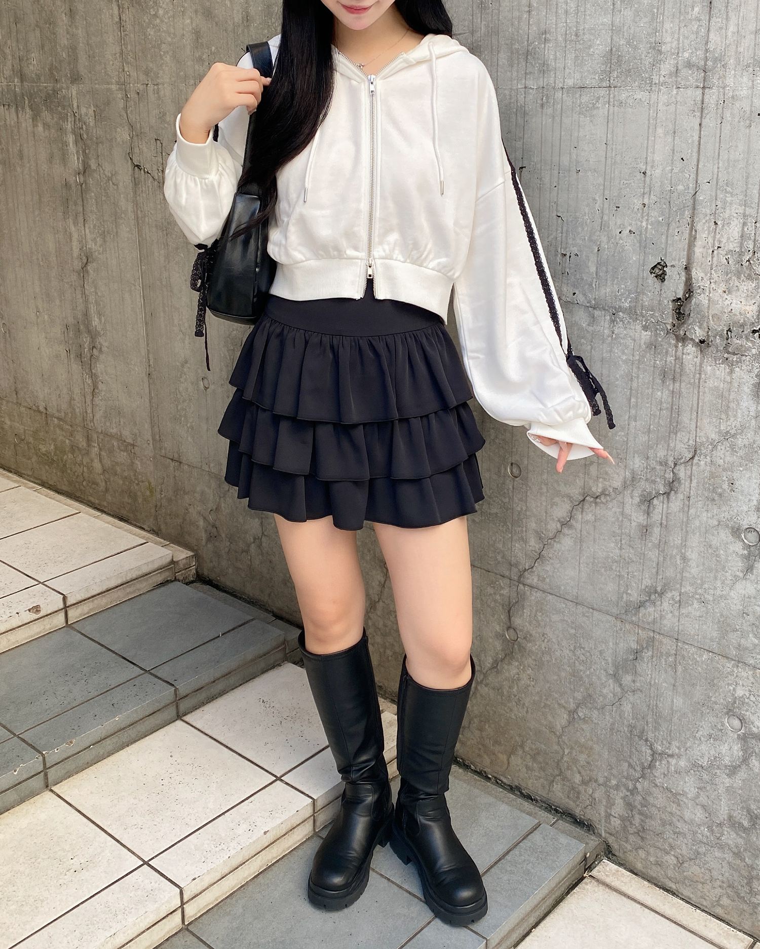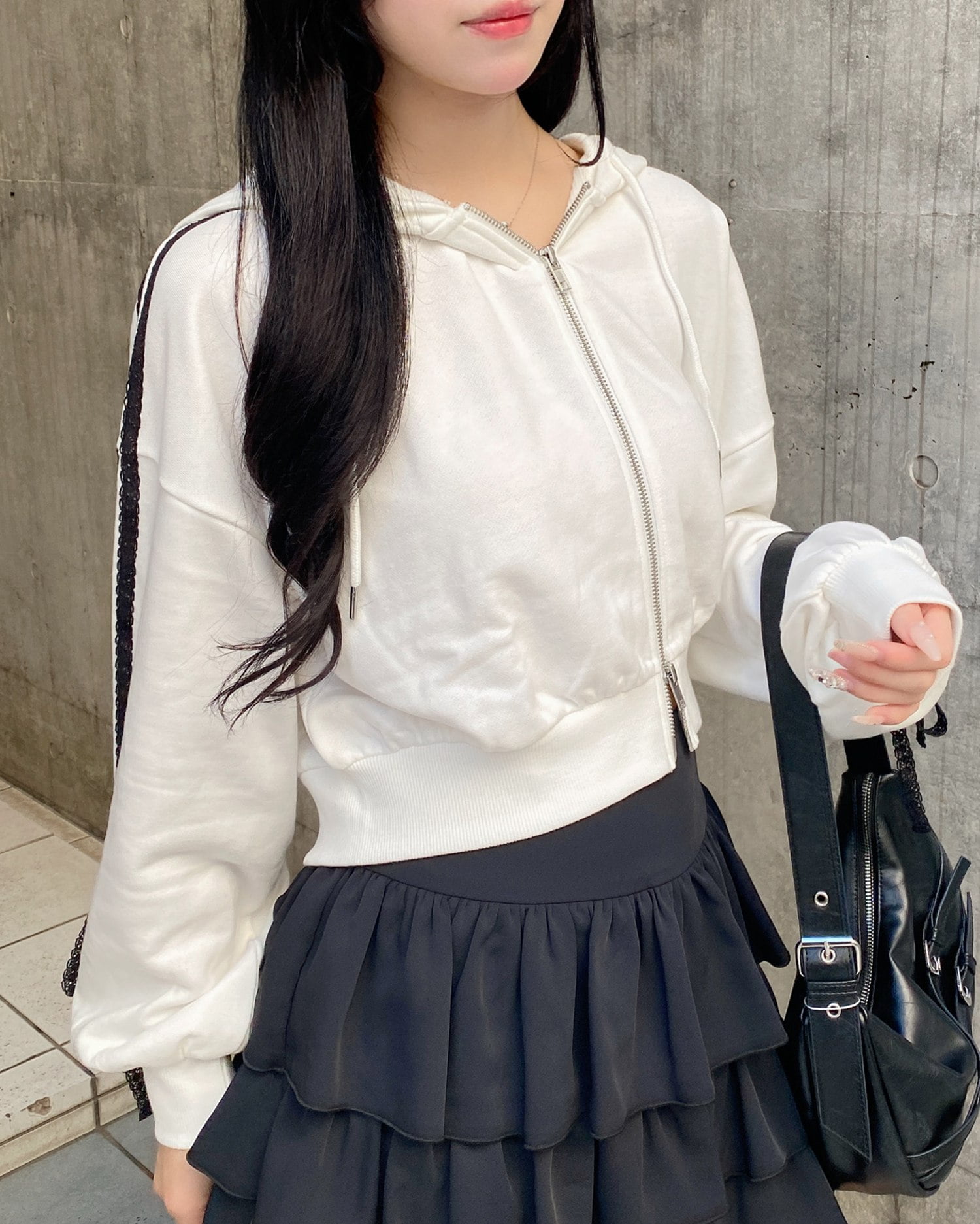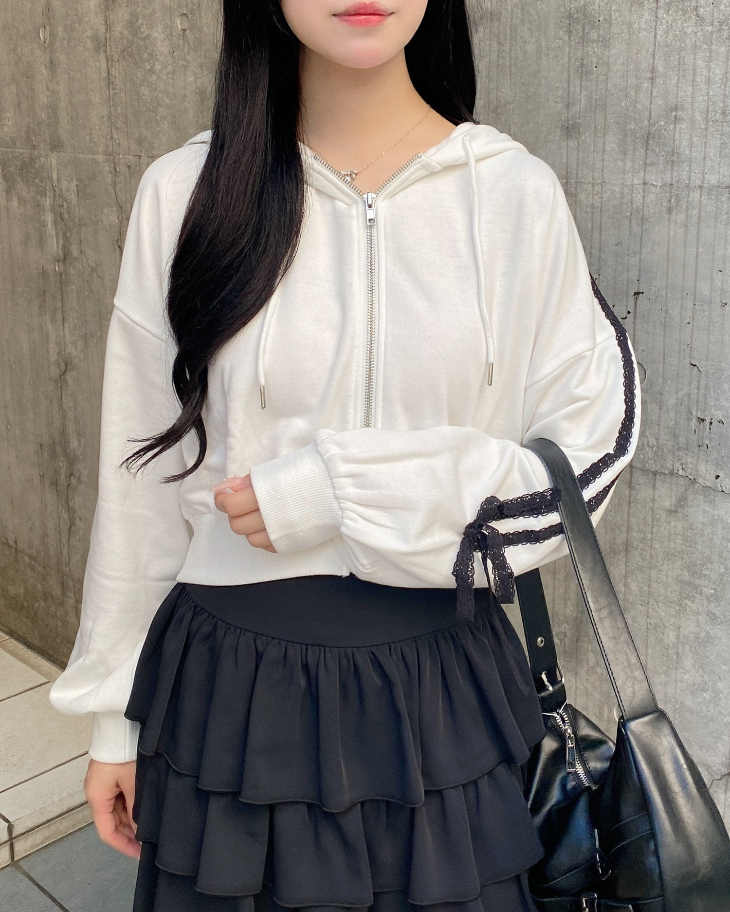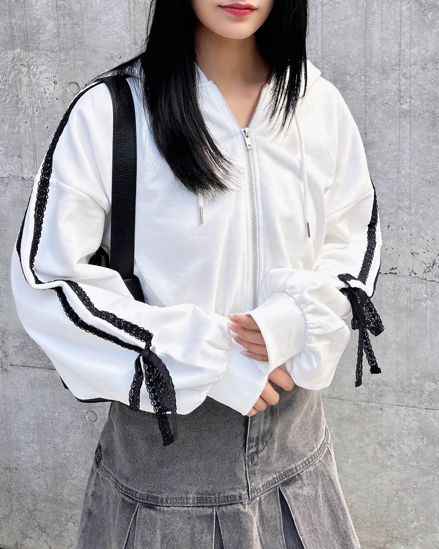 袖部分にはレースをラインのようにあしらってキュート&スポーティなアクセントにしています。