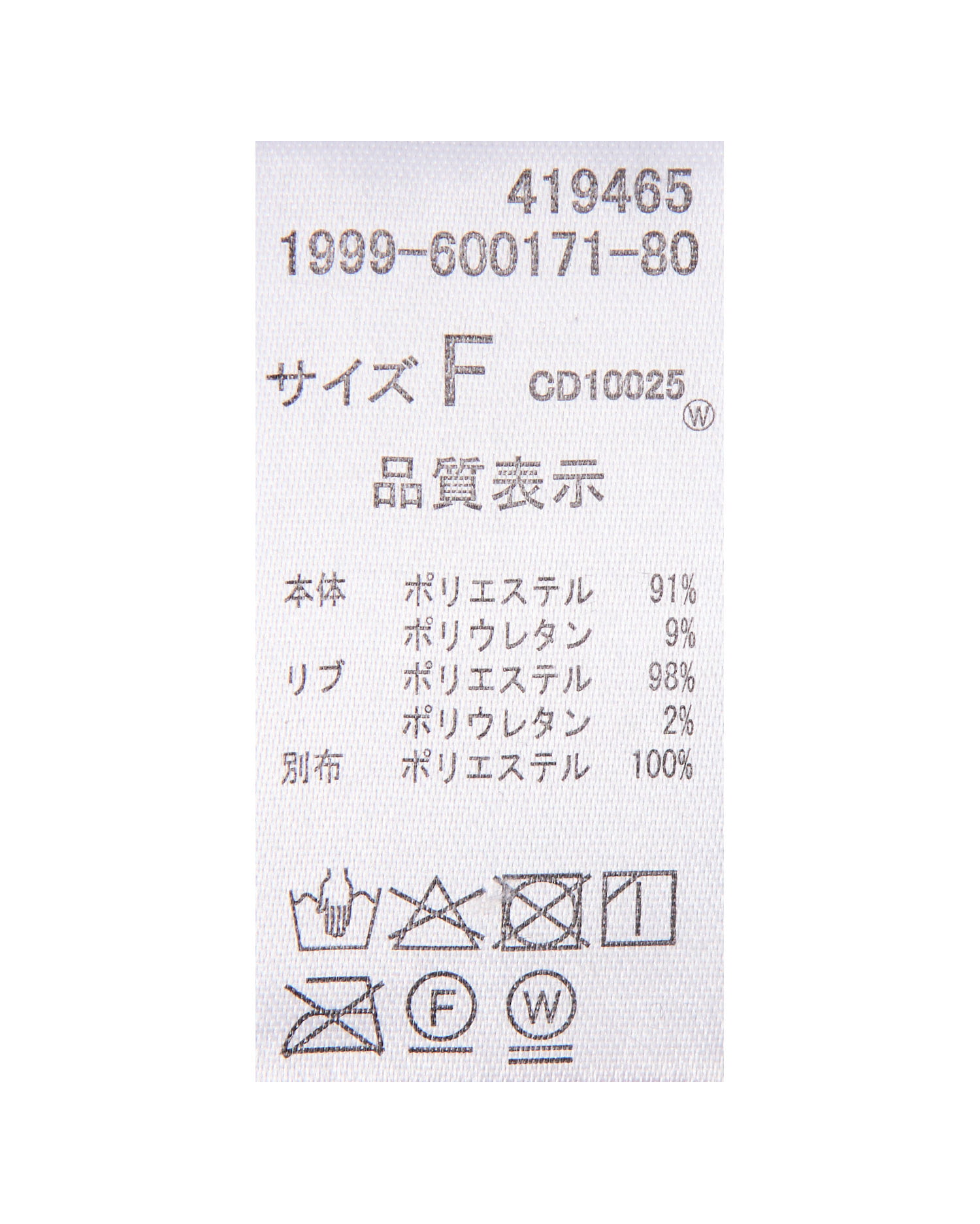 原産国 中国 本体 ポリエステル91% 本体 ポリウレタン9% リブ ポリエステル98% リブ ポリウレタン2% 別布 ポリエステル100%