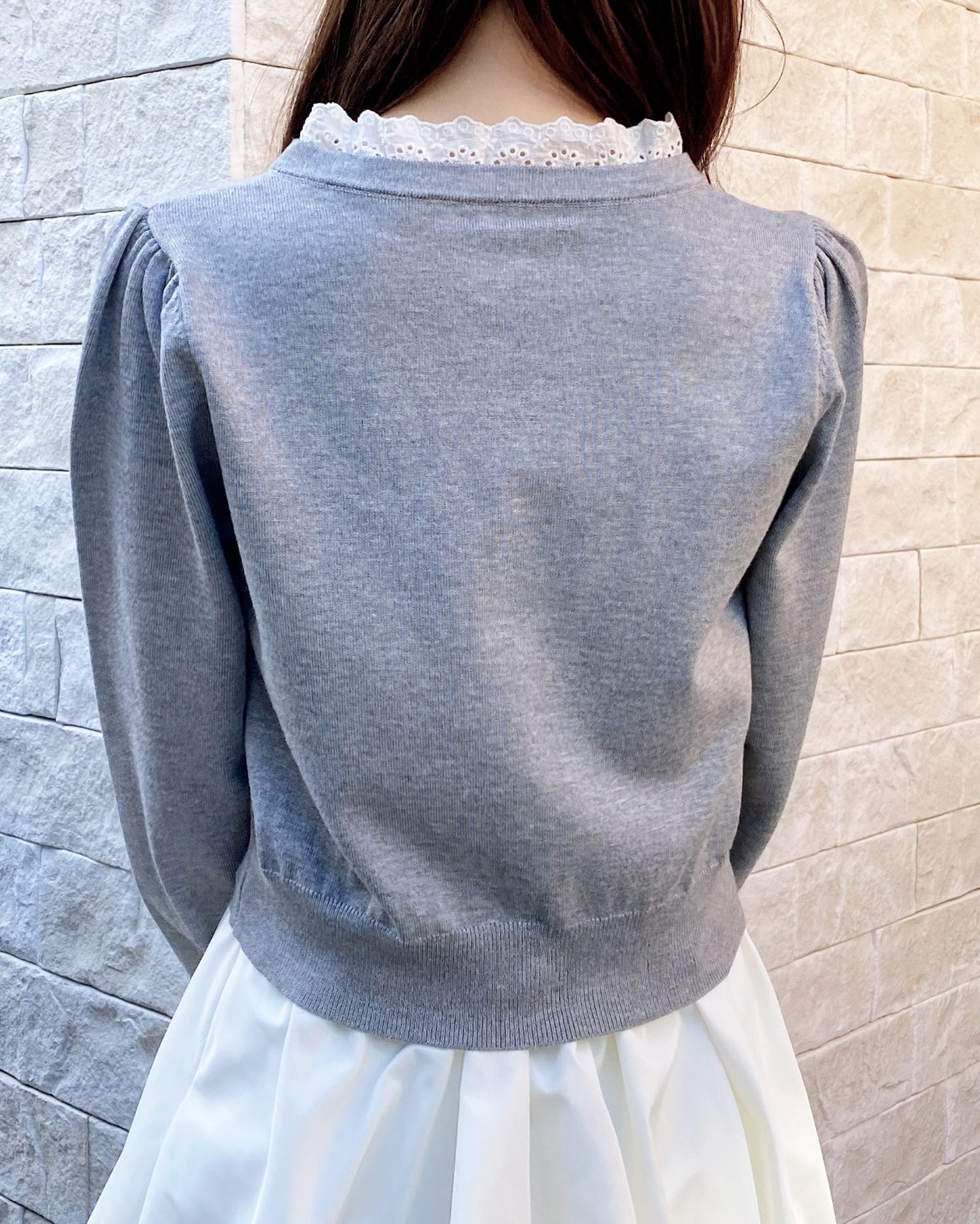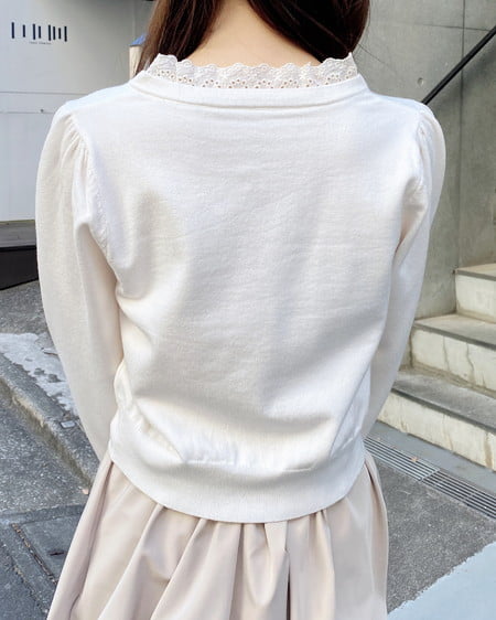 首周りから胸元にかけてあしらわれたレースのリボンがポイントの春ニット♡