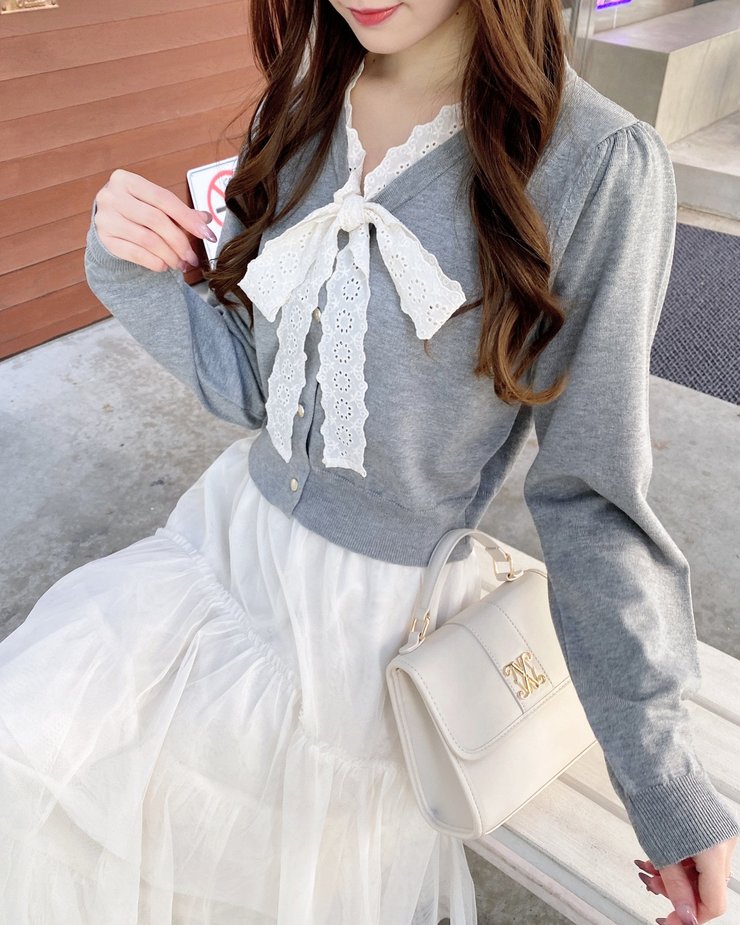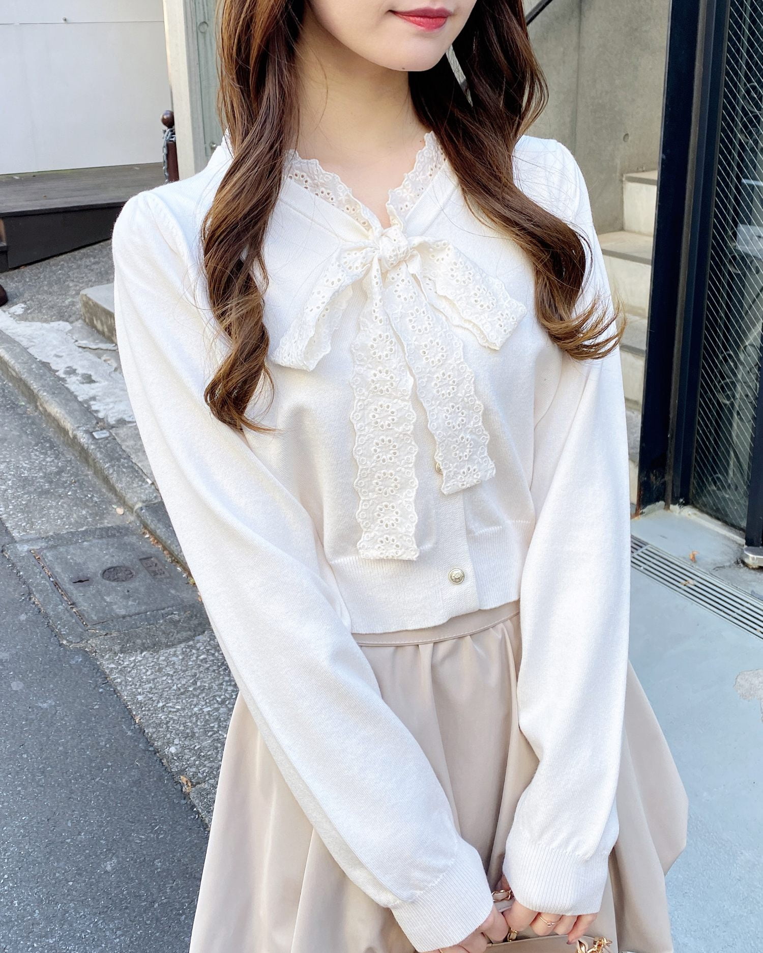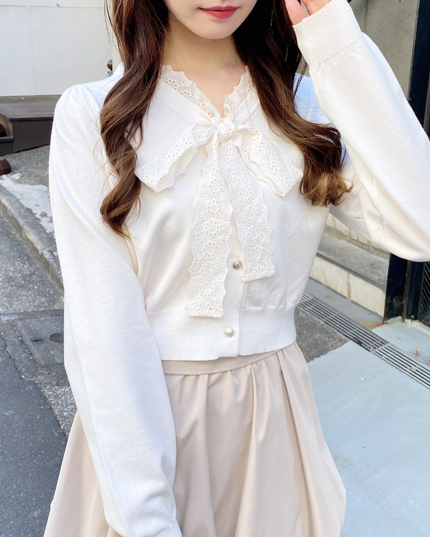 薄手のアウターを羽織ってレースボウタイをちらっとのぞかせてもかわいい♡