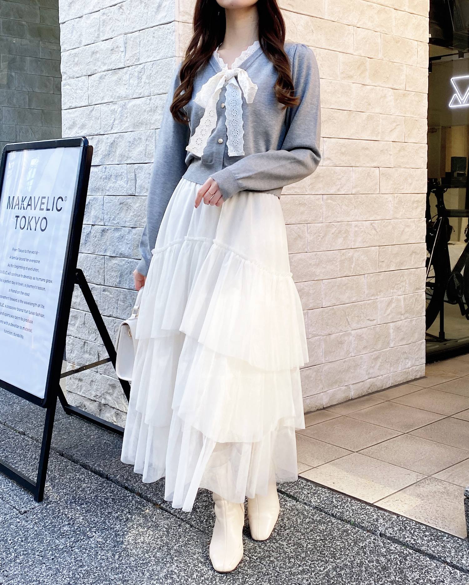 ニットのシルエットやリボンの質感もナチュラルなのでデニムと合わせてカジュアルダウンしても◎
