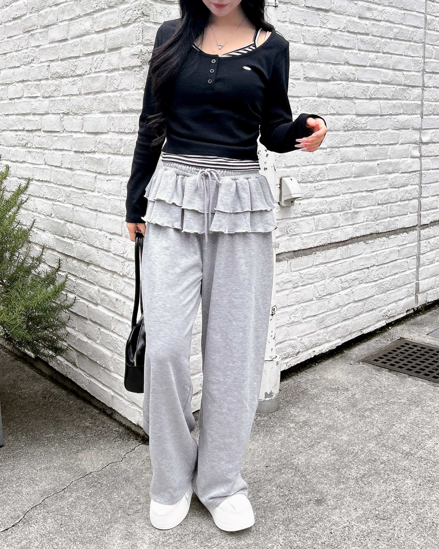 ルーズなシルエットのスウェットパンツにフリルを合わせた