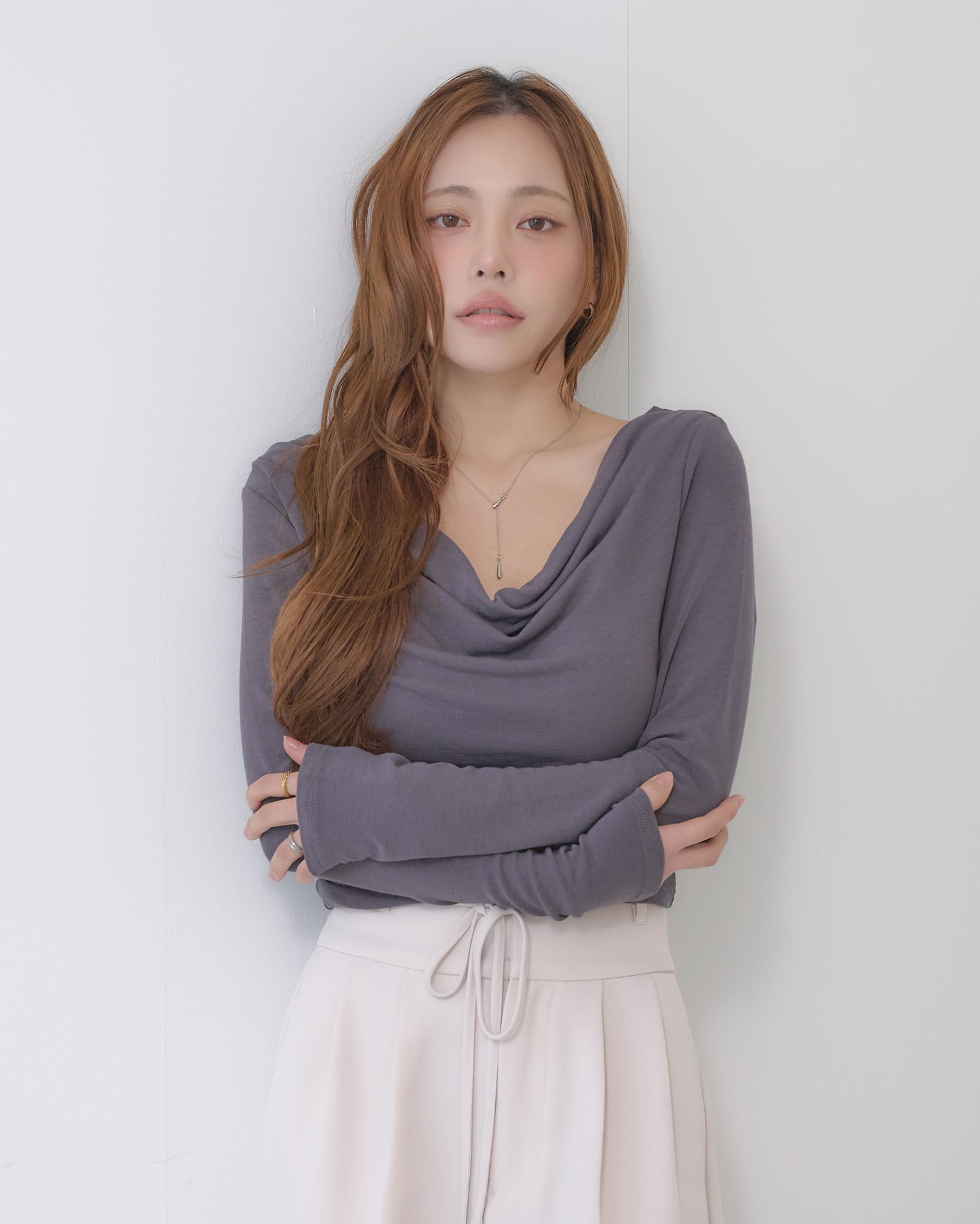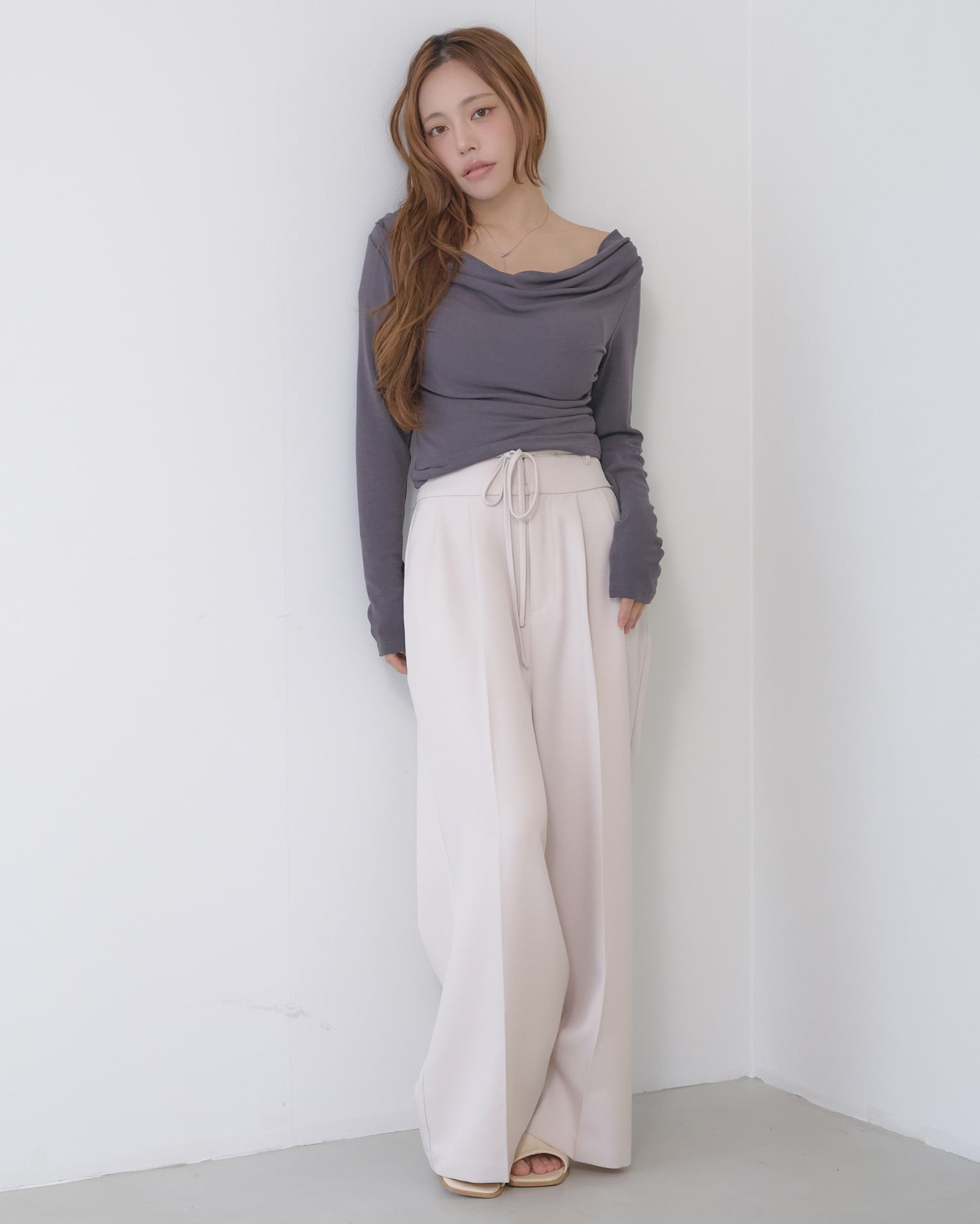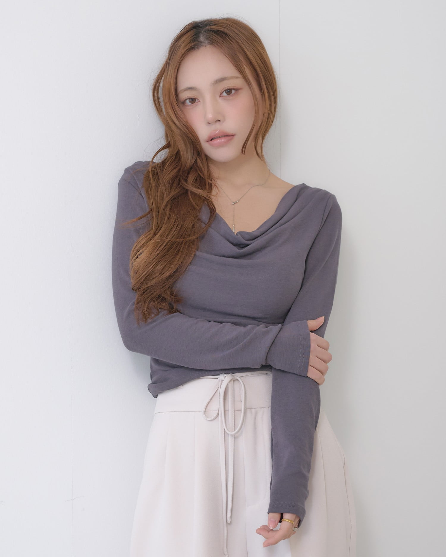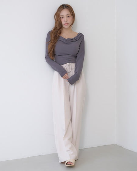 広めに開いたネックラインが顔周りをすっきり明るく彩ります。