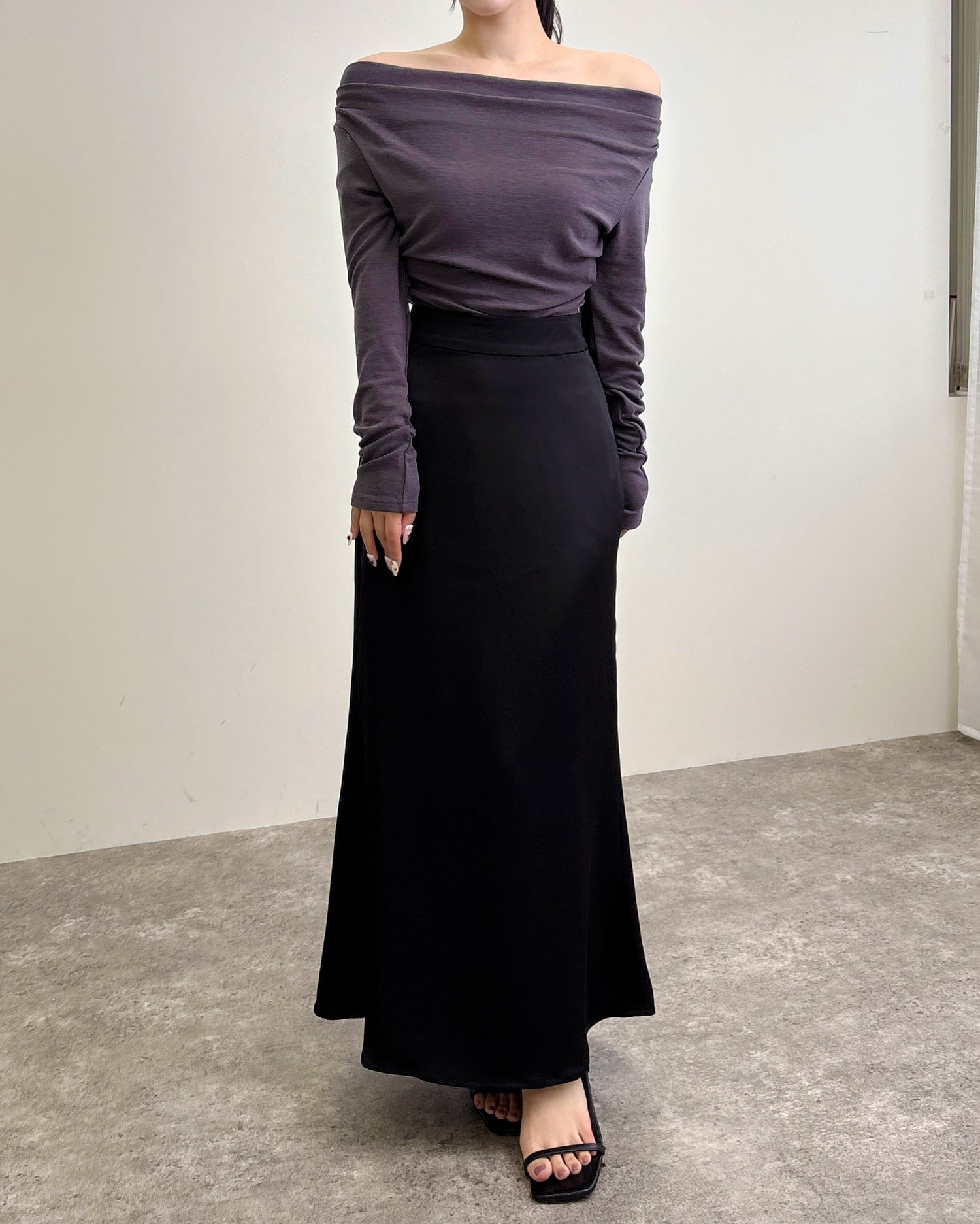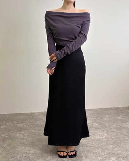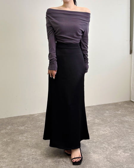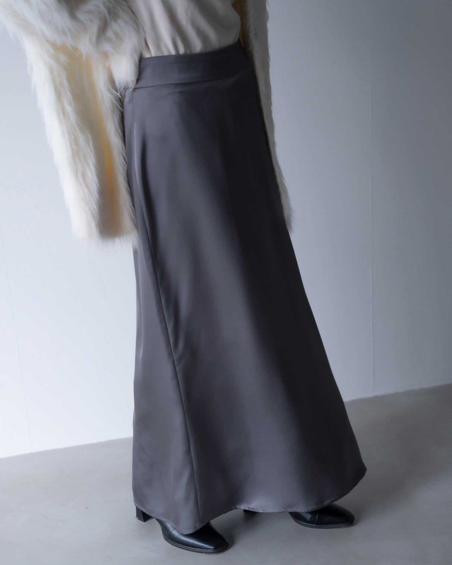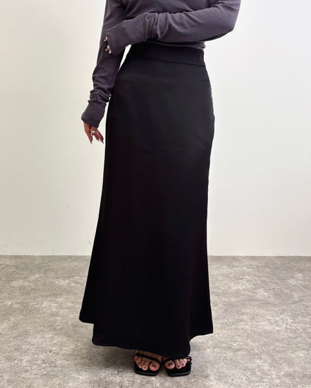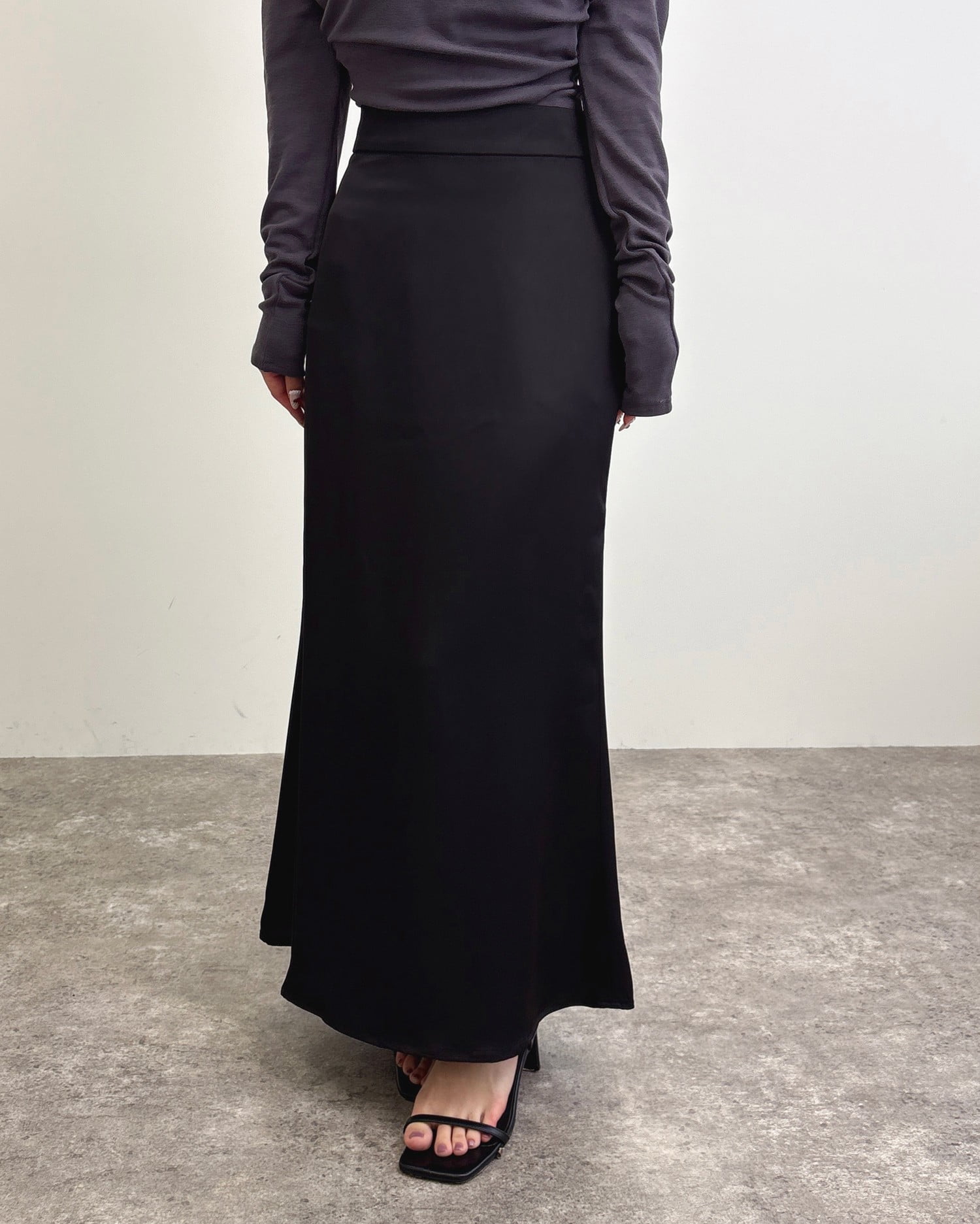 光沢のあるサテン生地で仕立てたマーメイドシルエットのロングスカート。