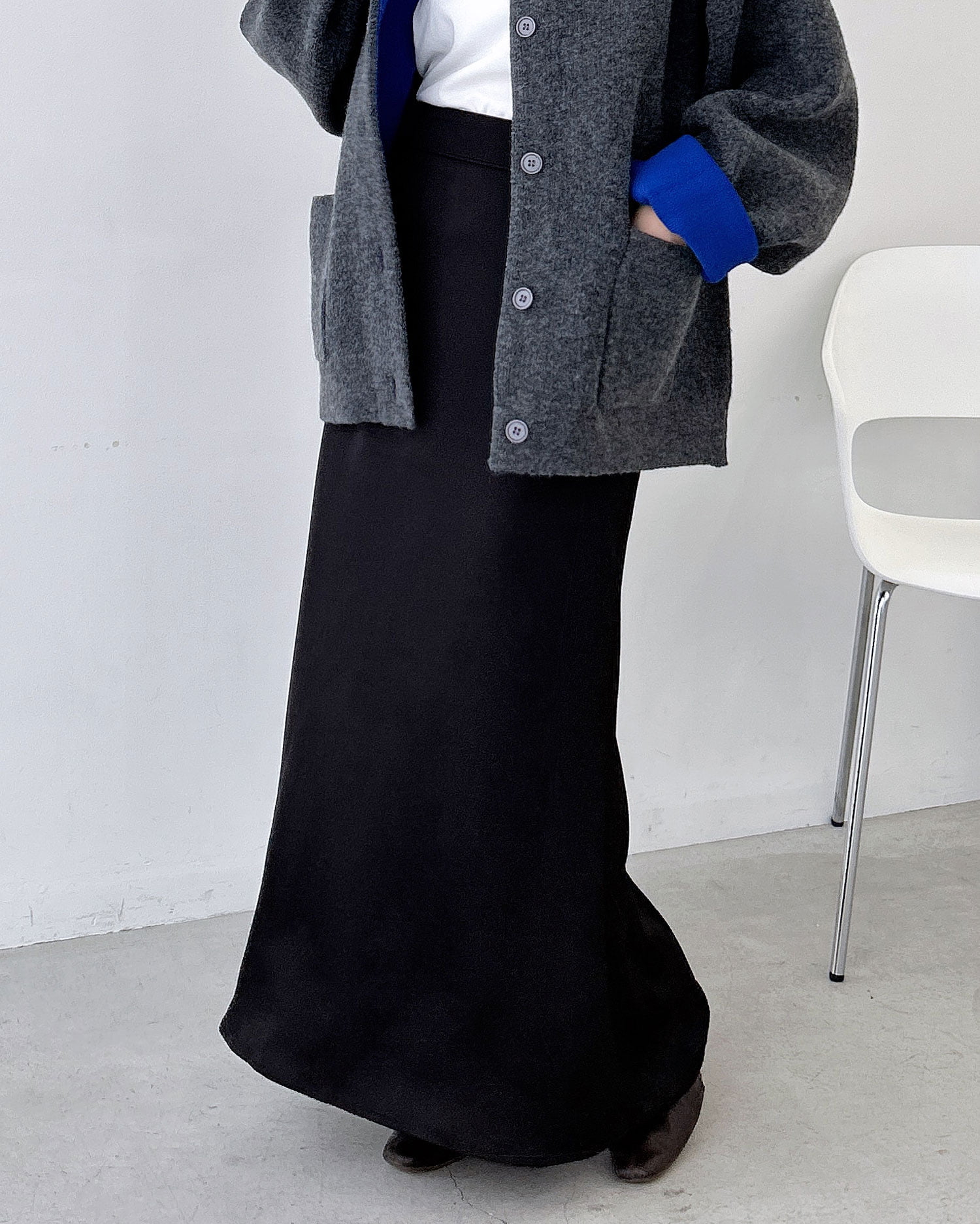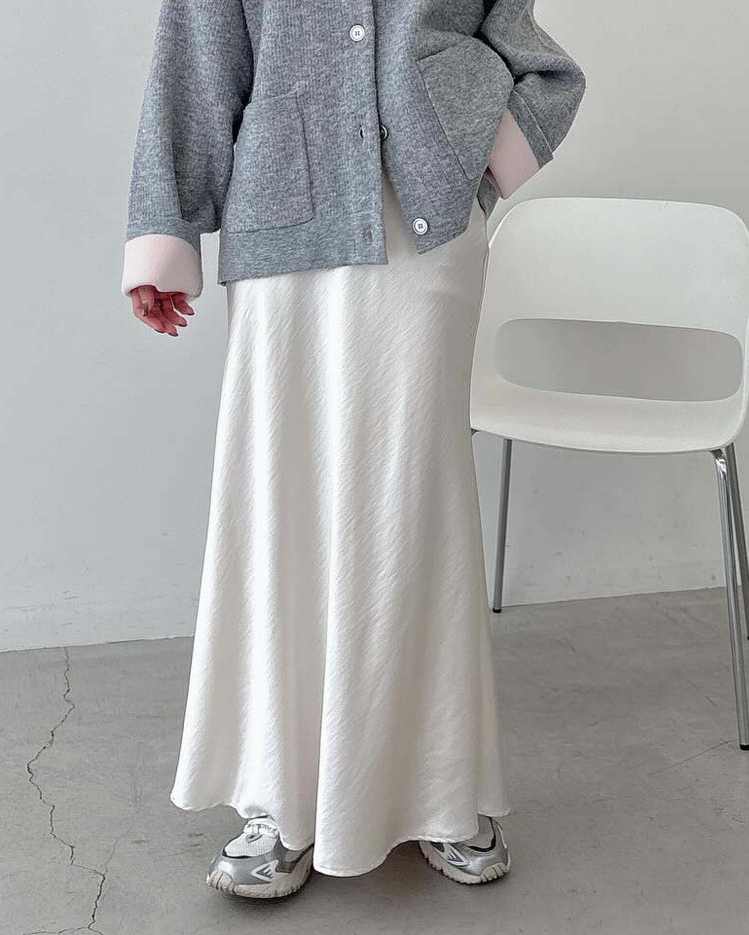 光沢のあるサテン生地で仕立てたマーメイドシルエットのロングスカート。