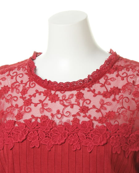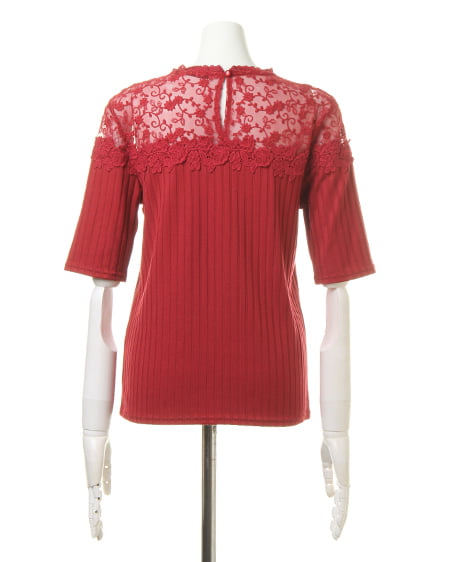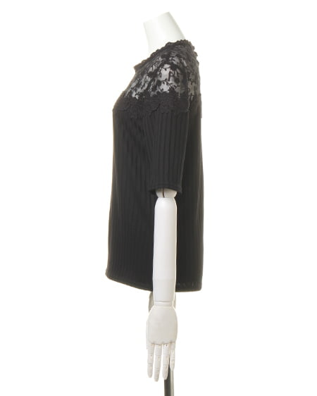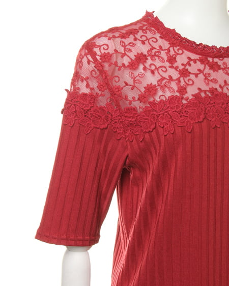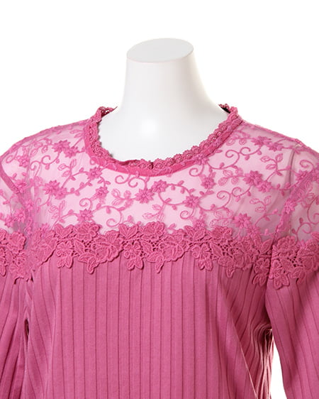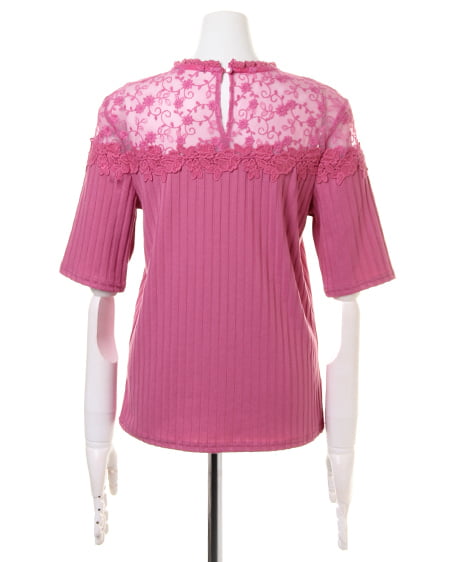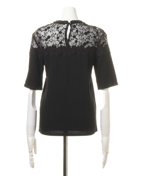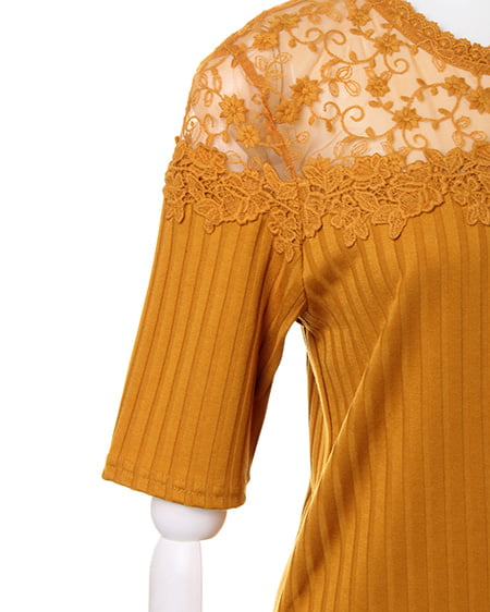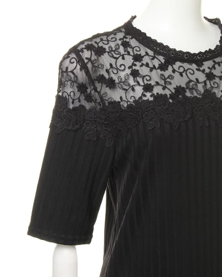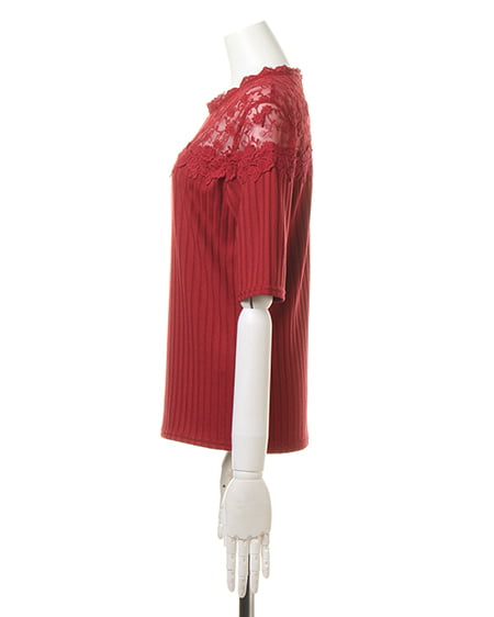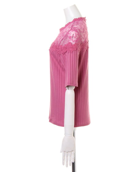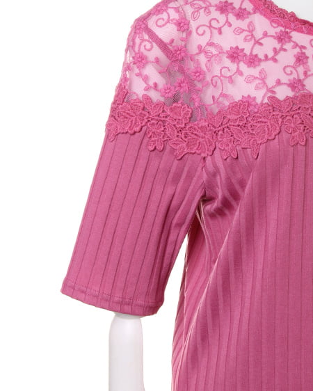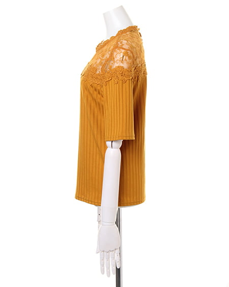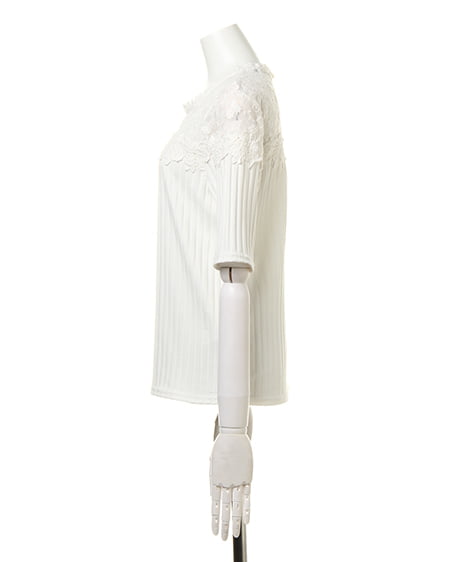 カジュアルなリブトップスに刺しゅうレースをあしらって、クラシカルな印象のトップスに仕上げました。デコルテを覆うプチハイネックが新鮮。伸縮性のある素材と、ボディに沿うワイドめのリブでIラインを強調。ちょっぴり長めの5分袖との組み合わせで、着やせをあおります。注目のワイドパンツと合わせて、メリハリのあるスタイルを楽しんで。