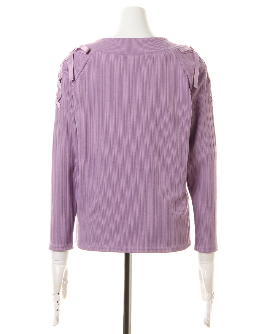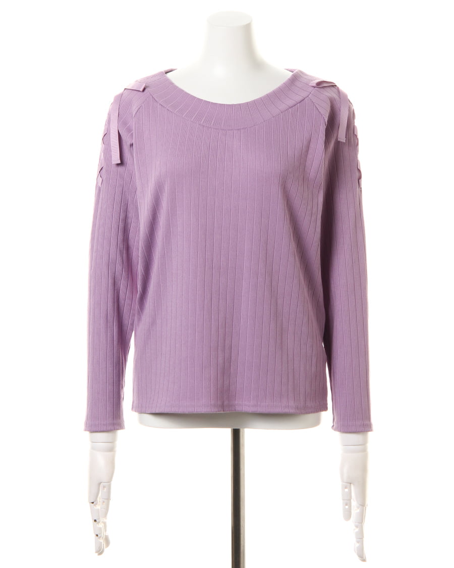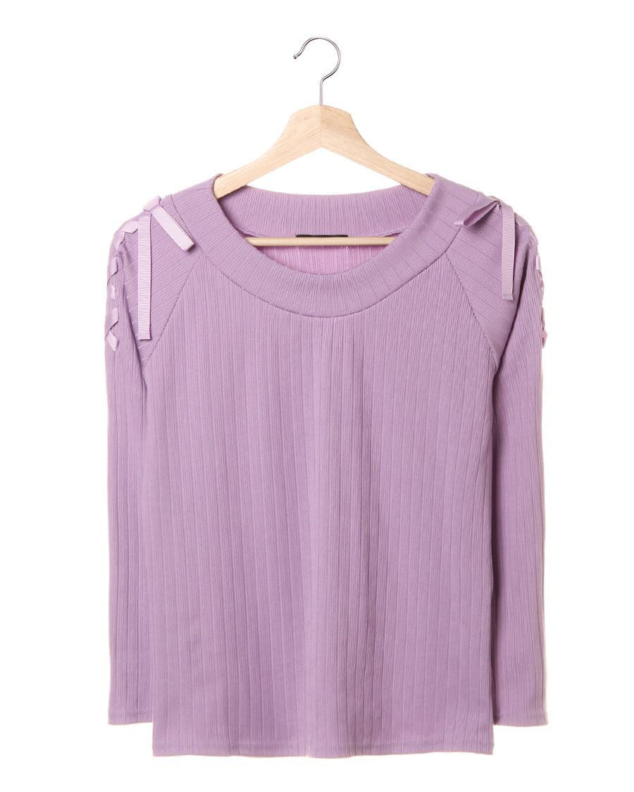 上半身にボリュームを持たせ、視線を上に集めることでスタイルアップを叶えてくれるカットソー。ショルダー部分にあしらったグログランリボンがアクセントになっています。リブは畝の変化で表情ある雰囲気に。広めのネックラインとの組み合わせでバランス良く着こなせます。肌馴染みの良い素材が普段使いに重宝。
