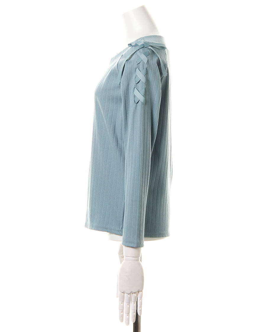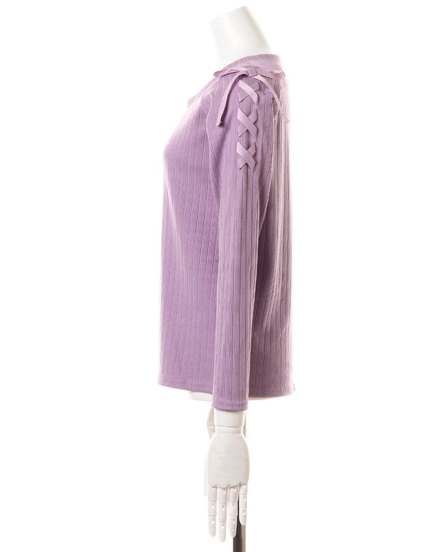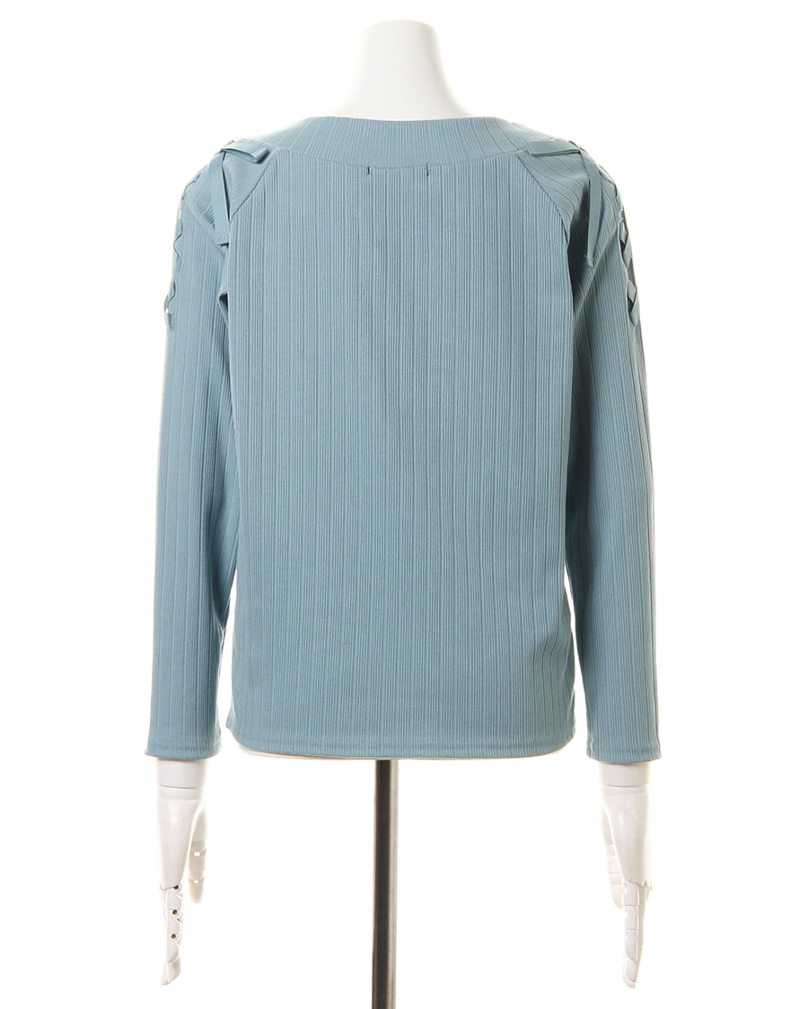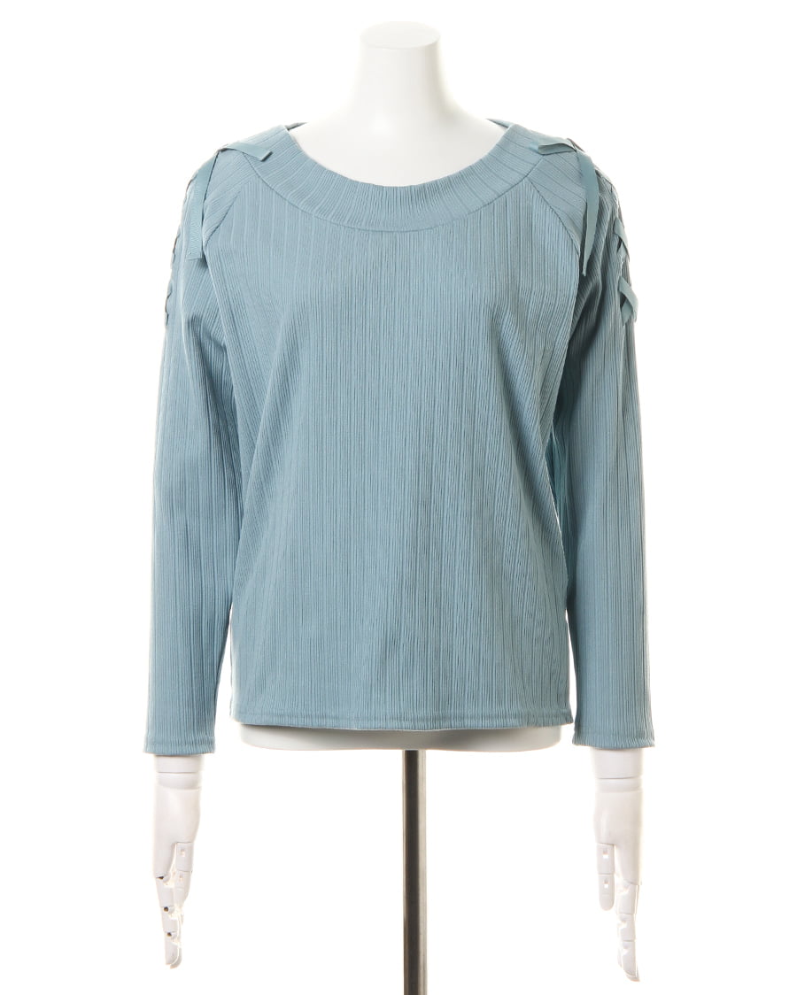 上半身にボリュームを持たせ、視線を上に集めることでスタイルアップを叶えてくれるカットソー。ショルダー部分にあしらったグログランリボンがアクセントになっています。リブは畝の変化で表情ある雰囲気に。広めのネックラインとの組み合わせでバランス良く着こなせます。肌馴染みの良い素材が普段使いに重宝。