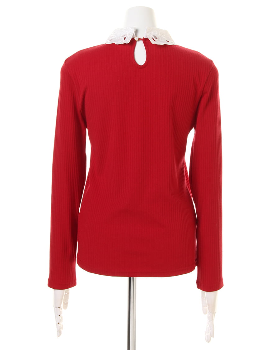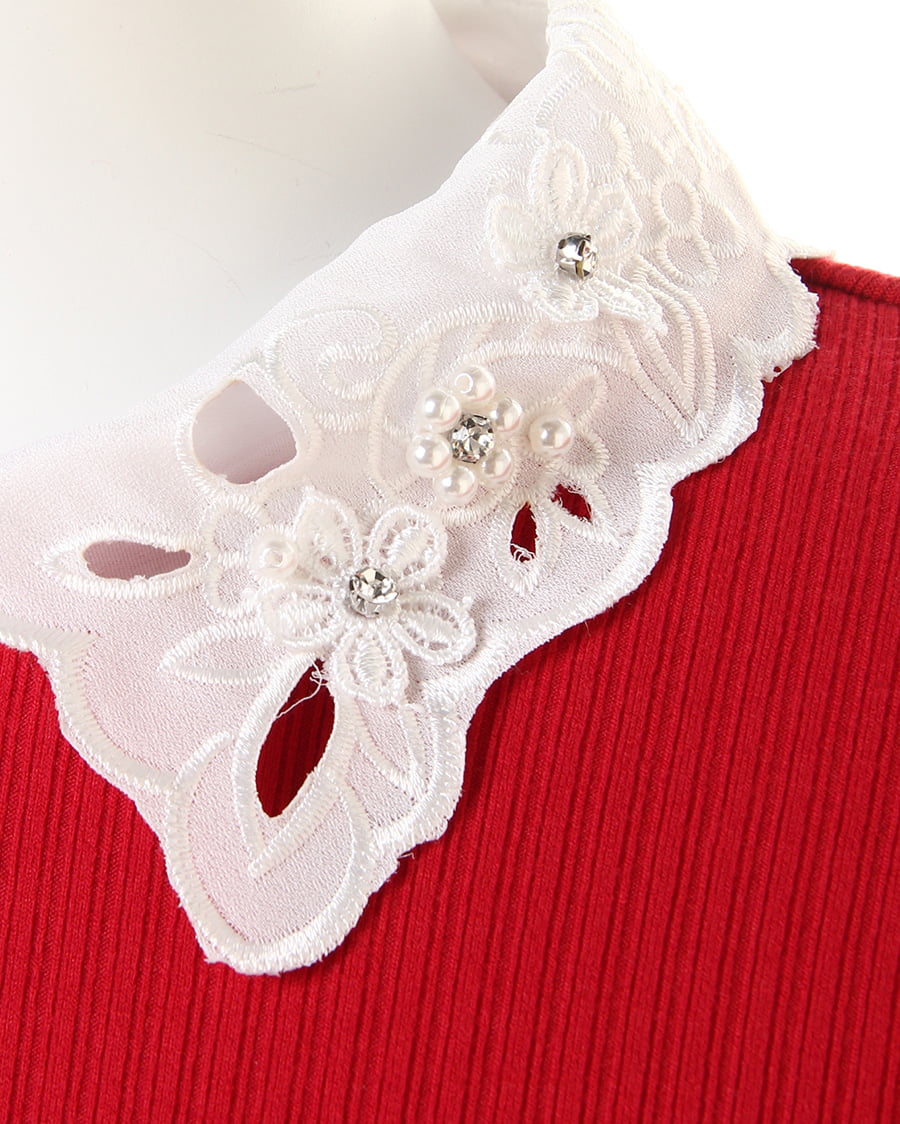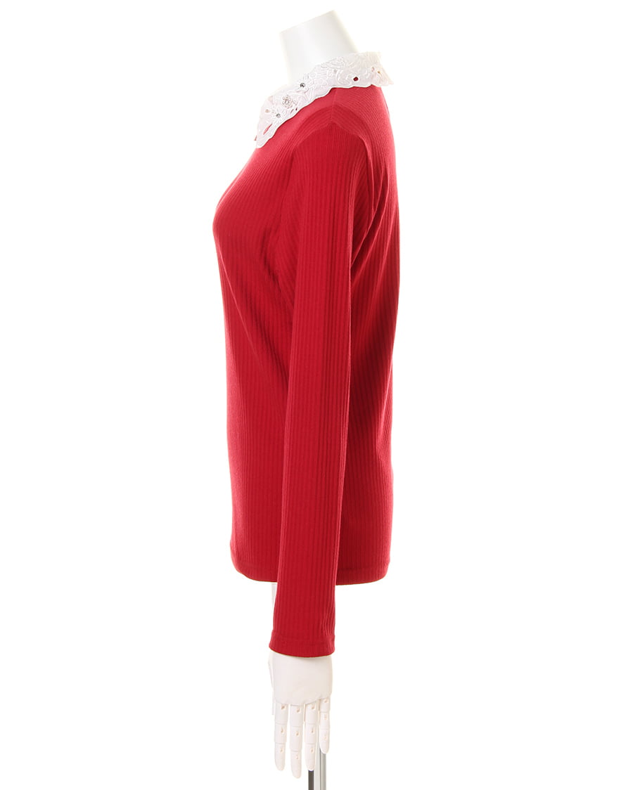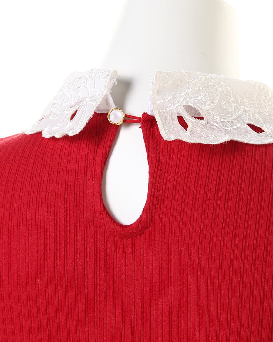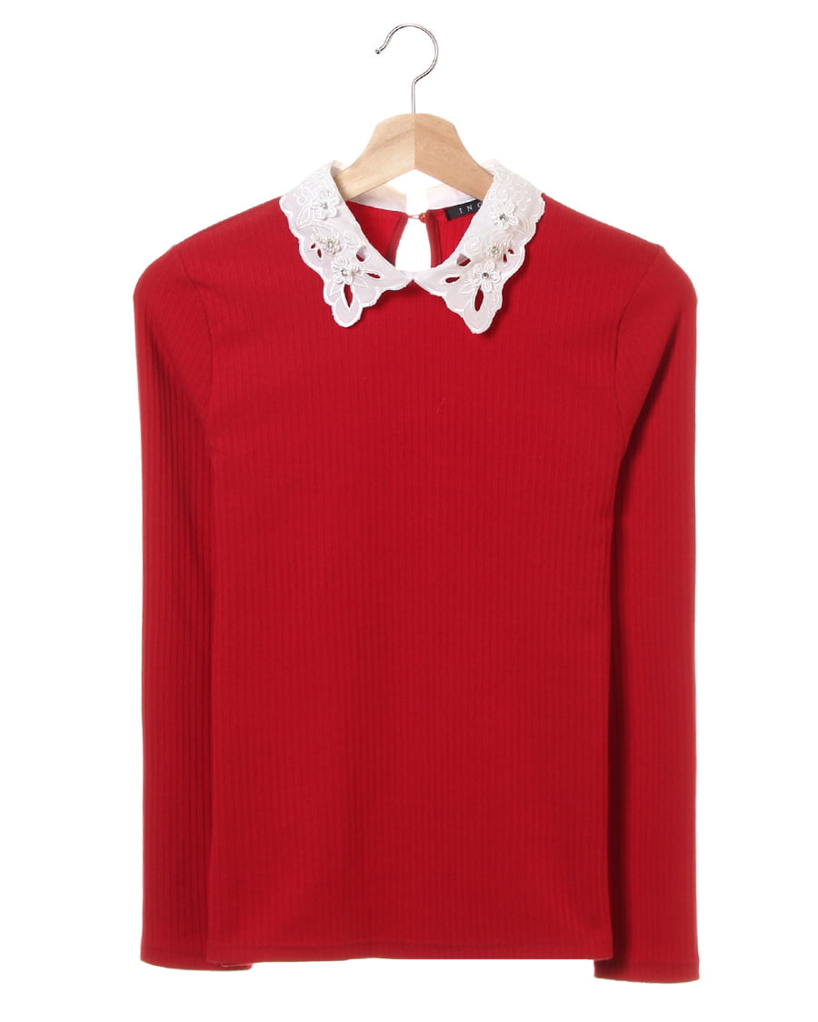 伸縮性抜群のリブカットソーに襟装飾レースをあしらってフェミニンに仕上げたトップス。細めのリブでボディに沿うデザインが上半身をすっきり見せてくれます。首元にスカラップデザインのシフォン素材をプラスした上品さが◎。立体フラワーとパールビジュー、ラインストーンでアクセいらずで顔周りを華やかに演出します。バックもドロップカットで抜かりなしになっています。