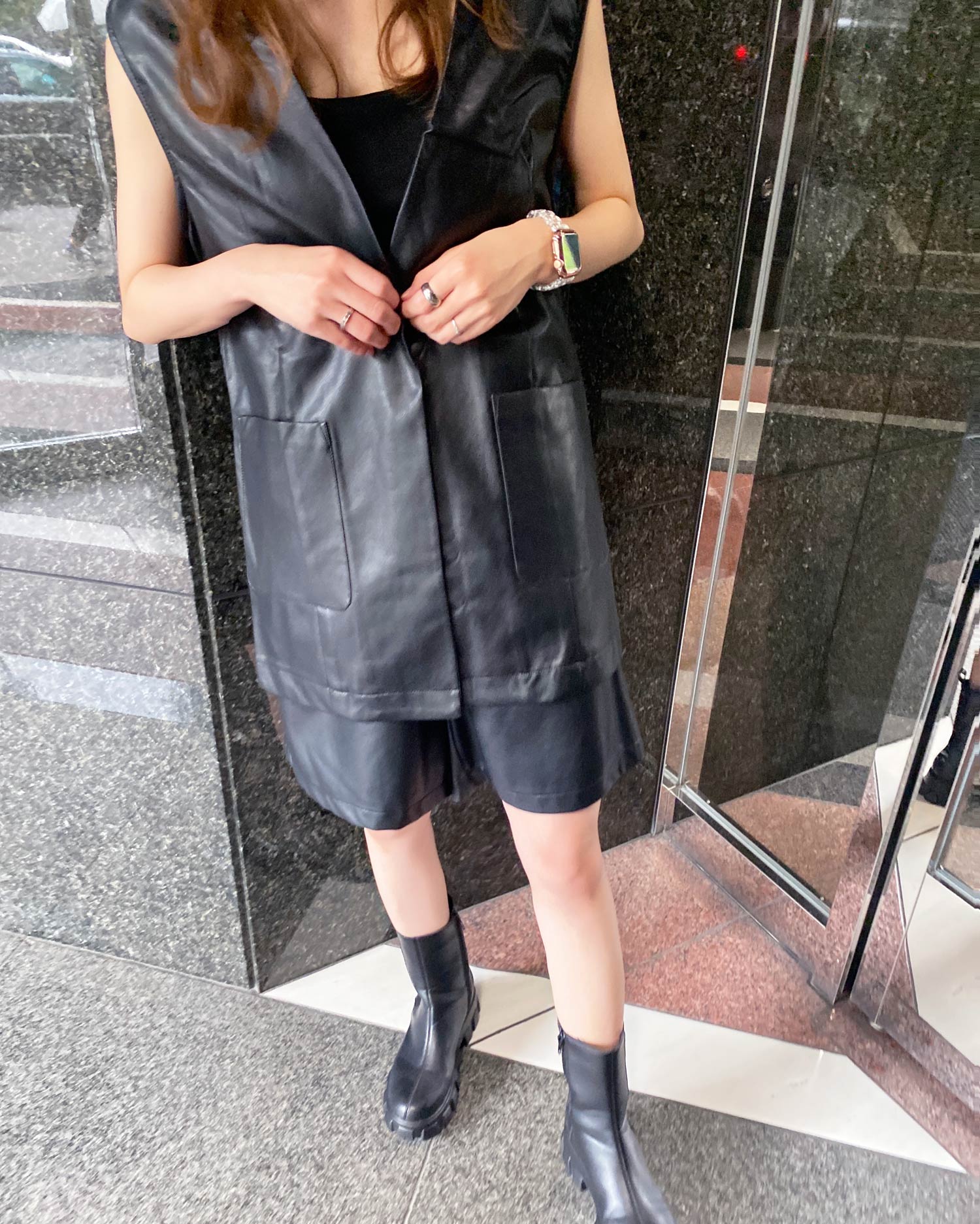 シンプルなコーデにプラスするだけでモードな印象へ導くフェイクレザーのジレ。