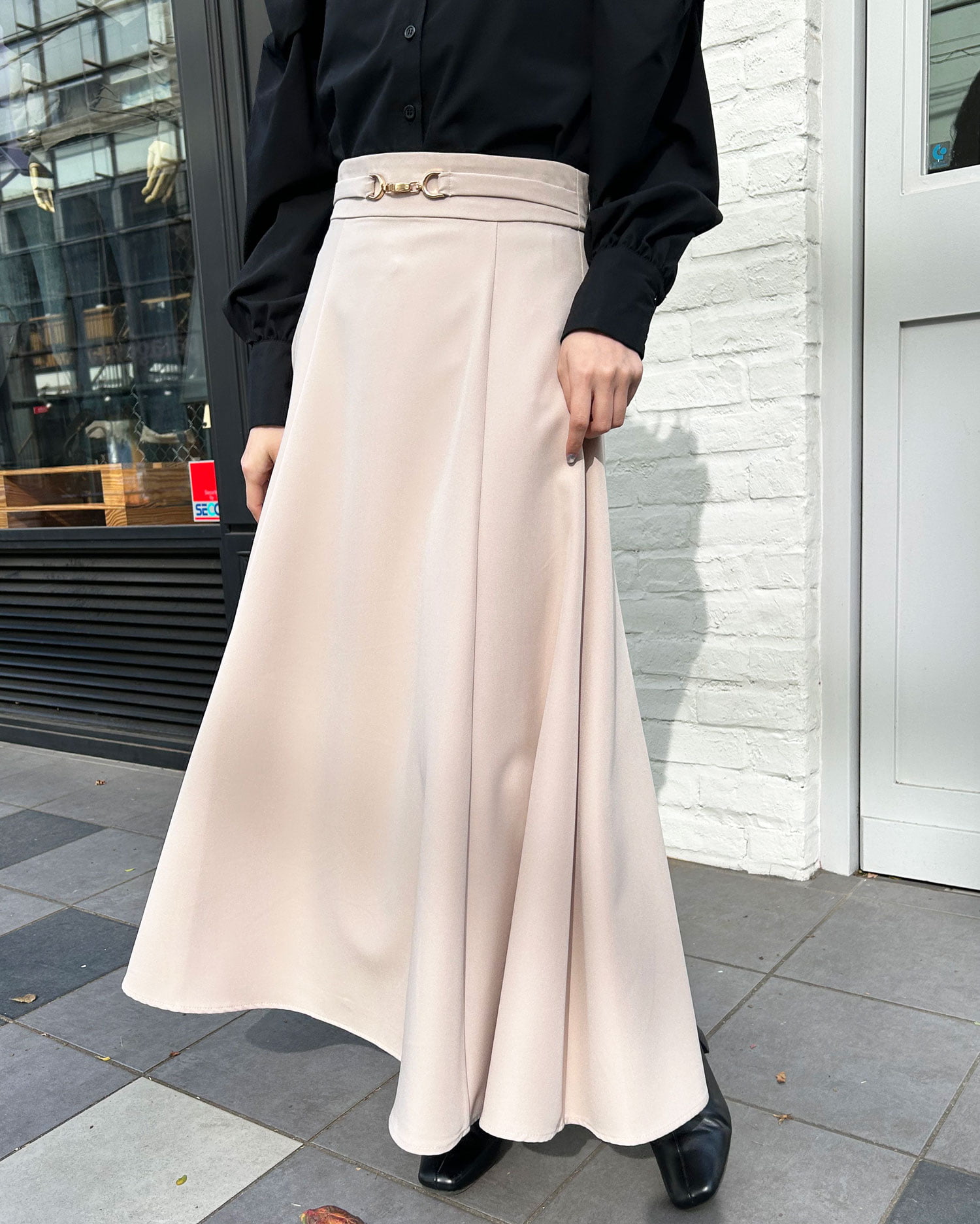 裾へ向かってふわりと広がる美シルエットで、動くたび揺れる裾が魅力的です。