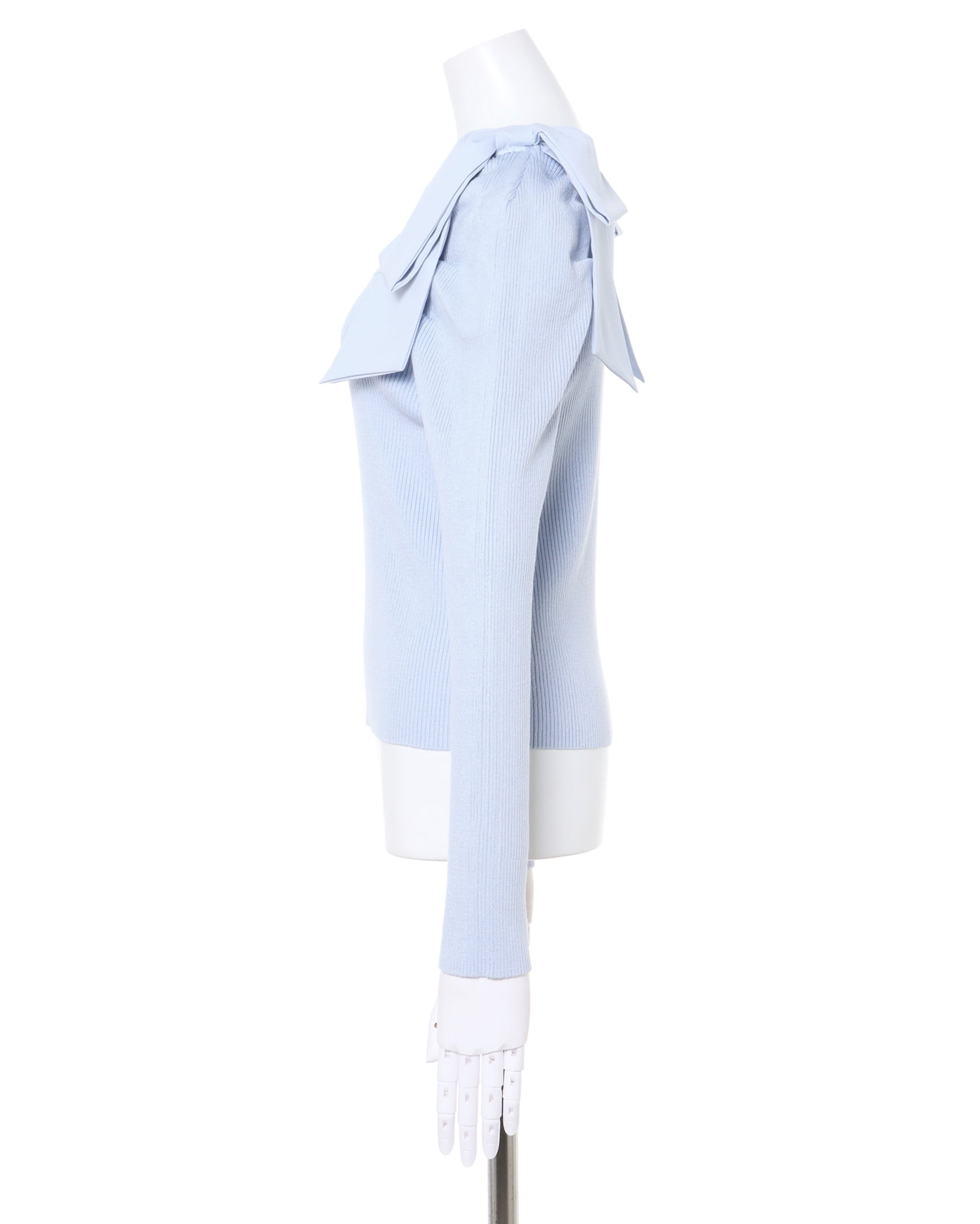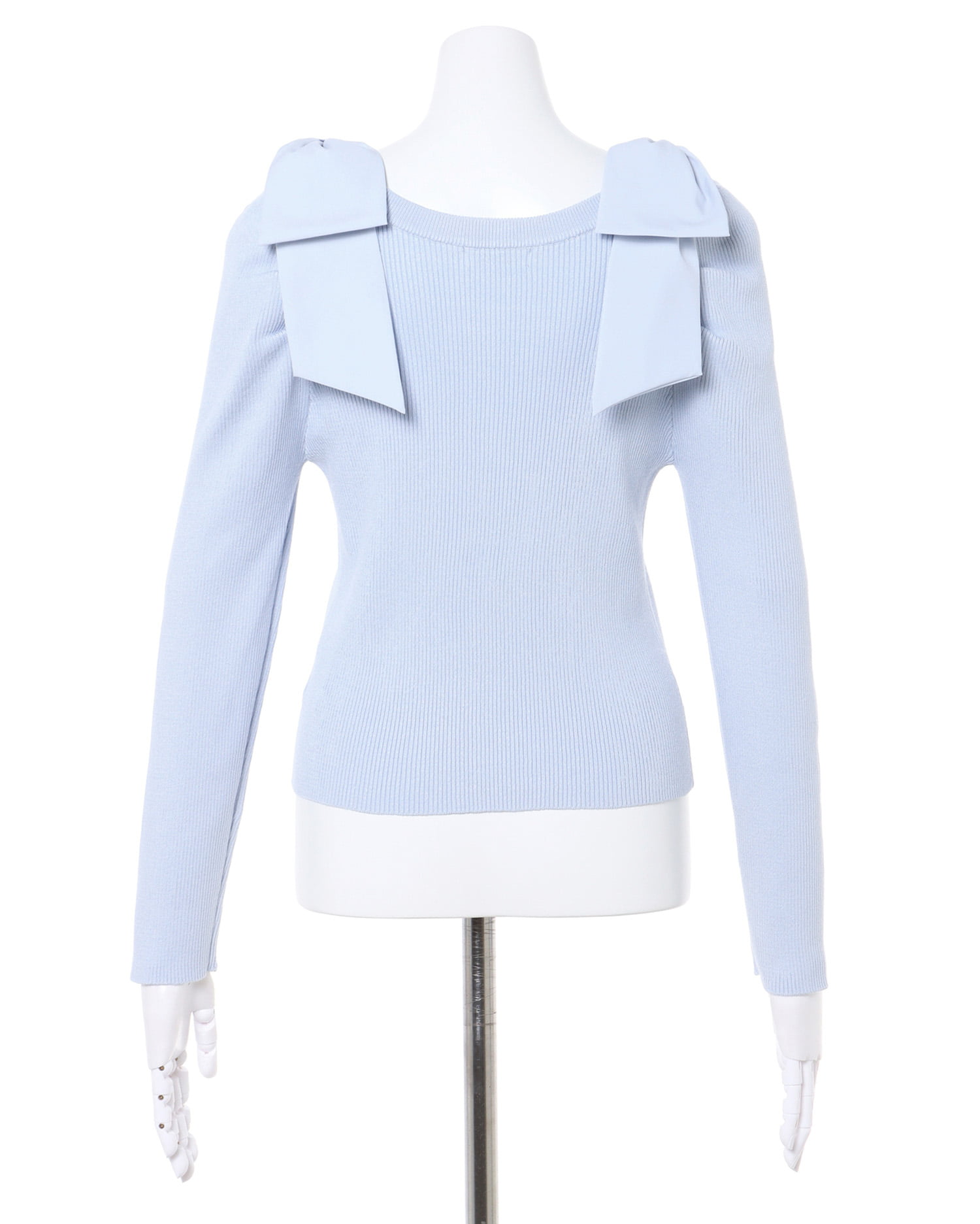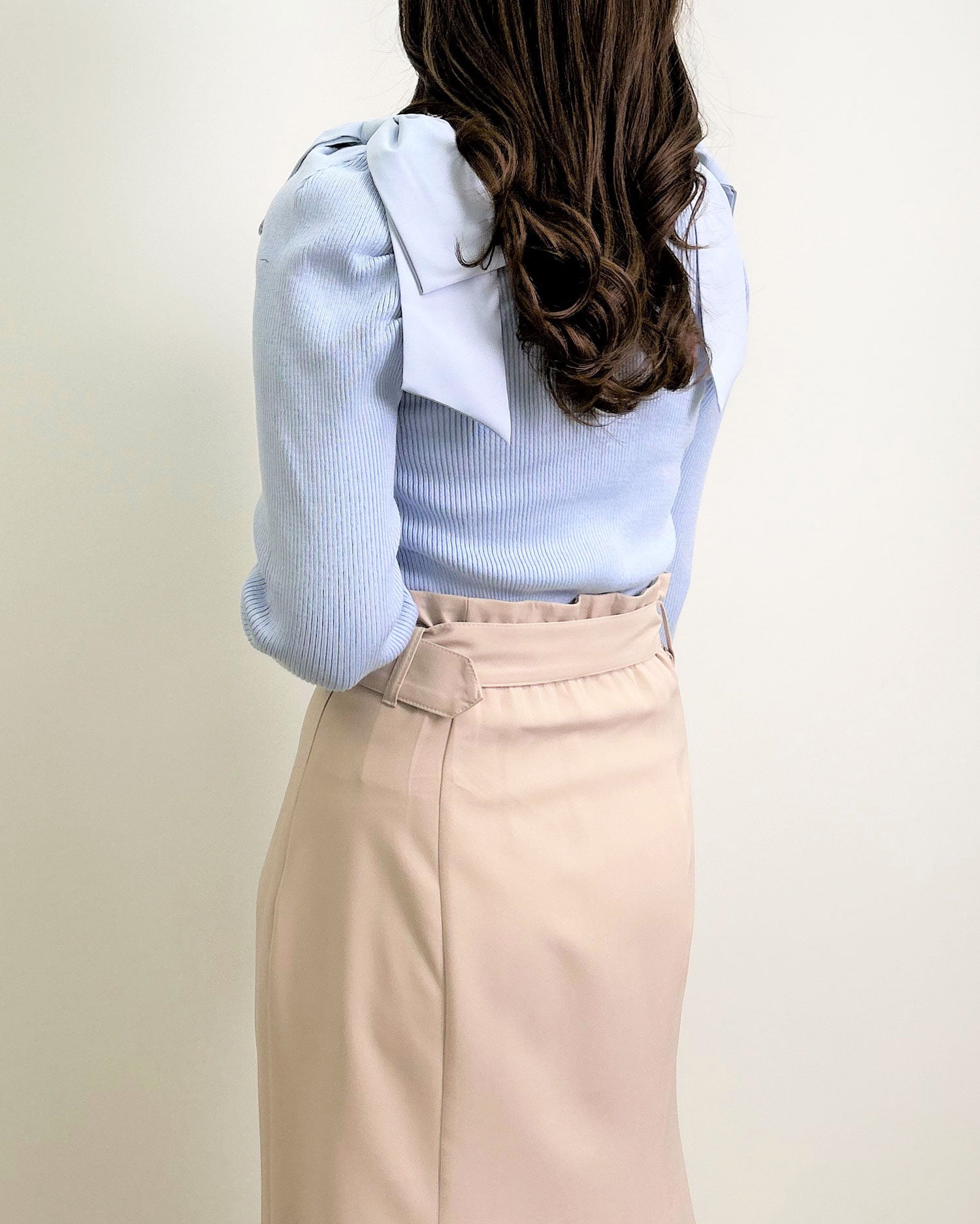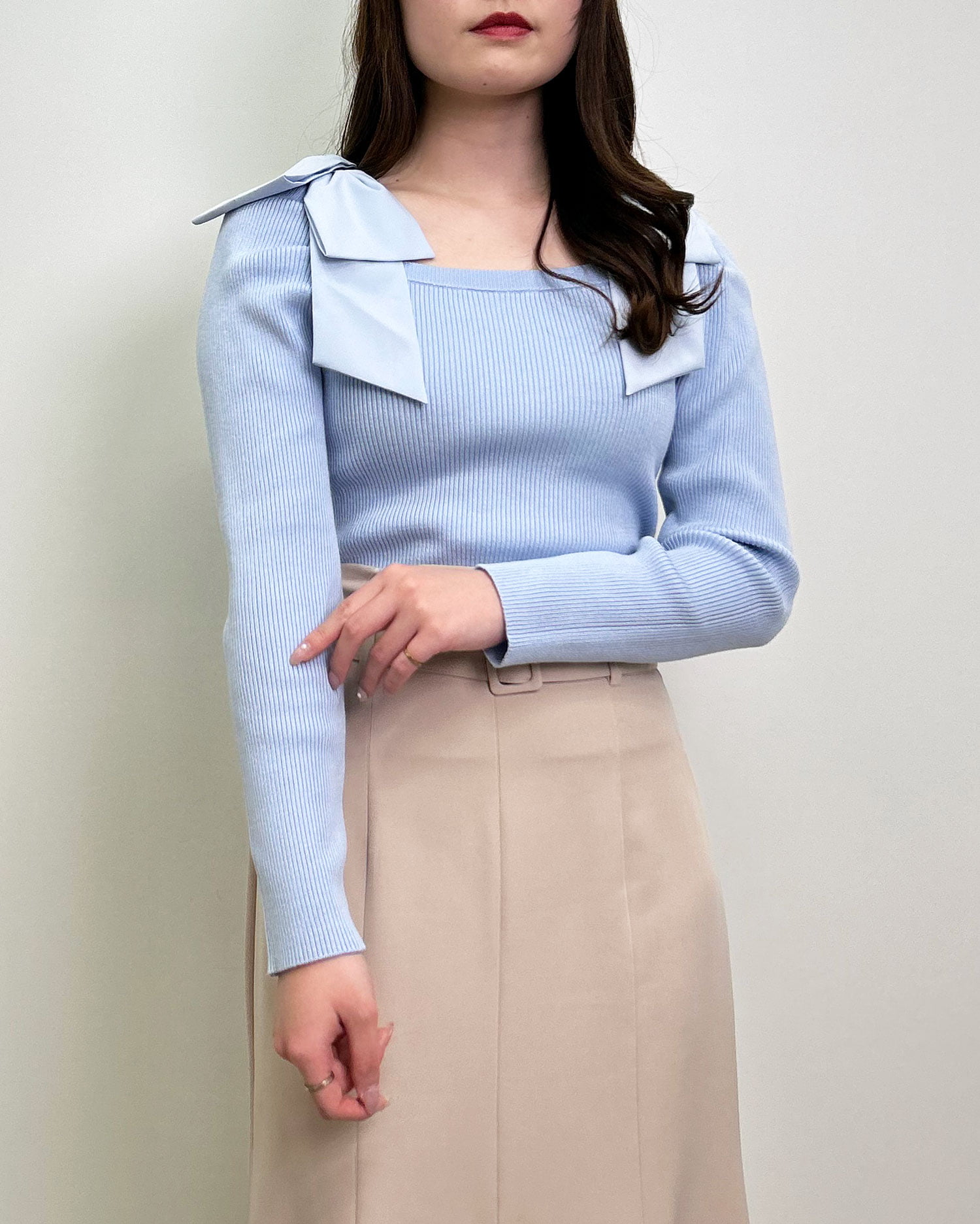 肩に大きなリボンをあしらった大人レディな魅力たっぷりのニットトップス。