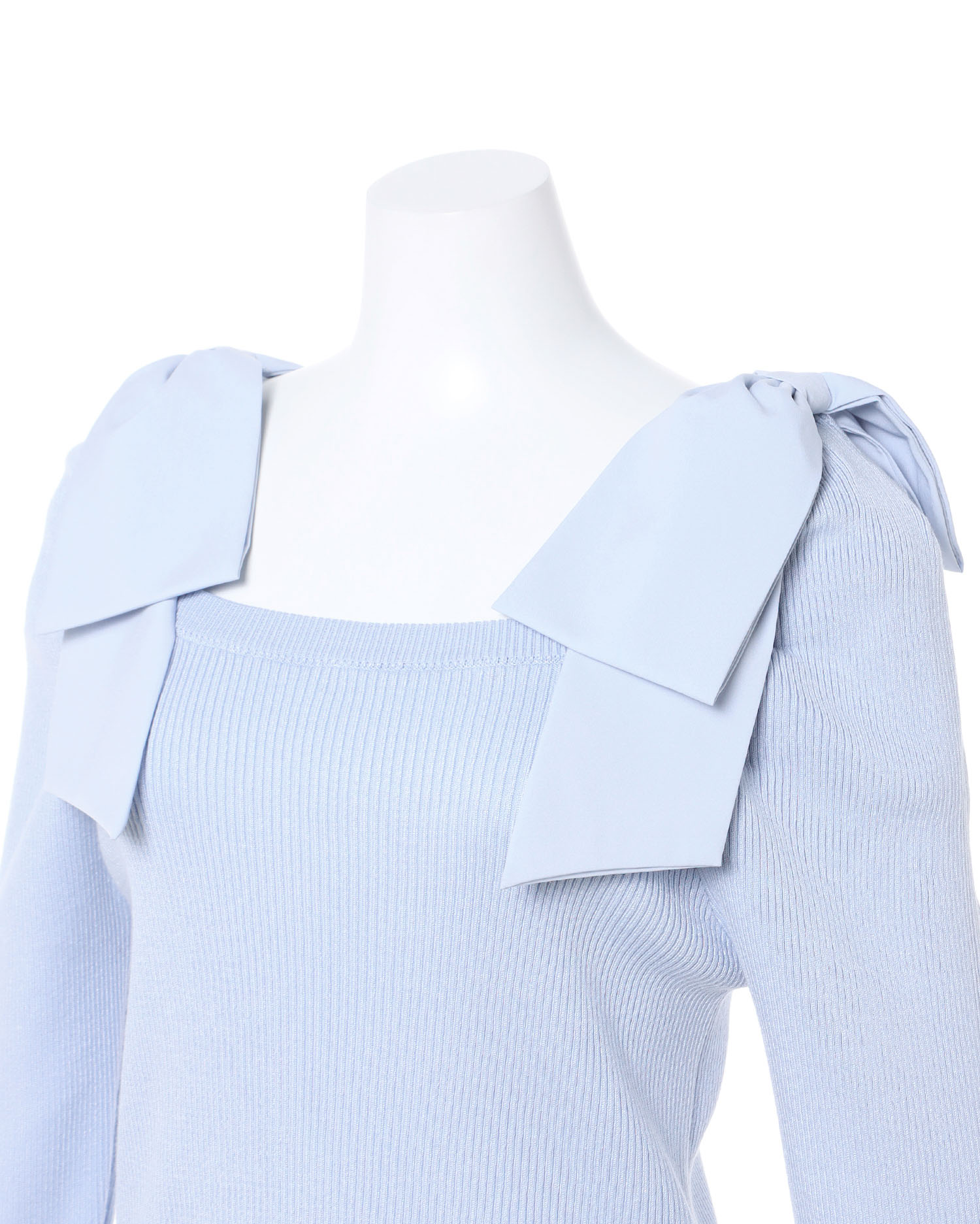 【1231-900106 スクエアネック異素材肩リボン5分袖ニット】