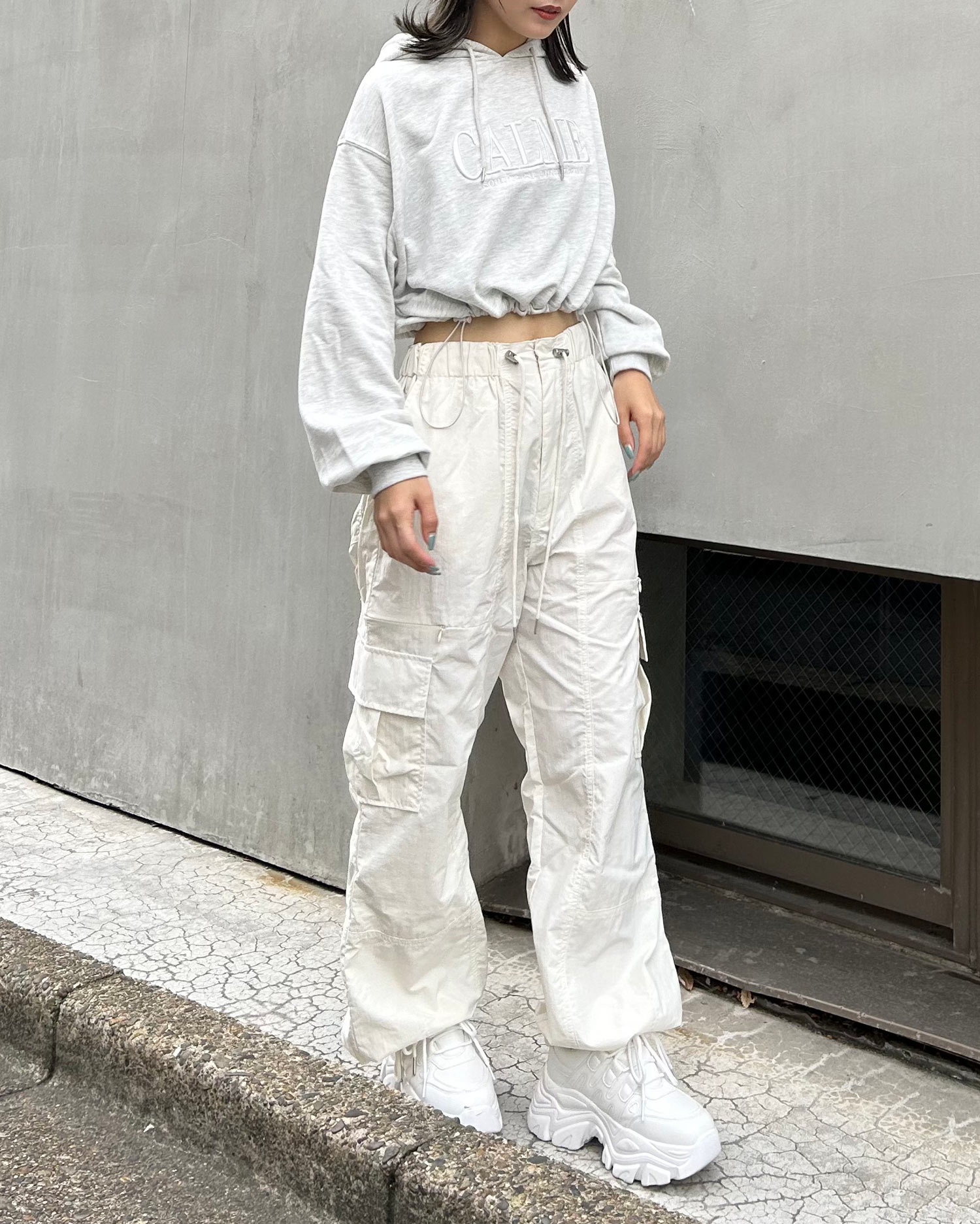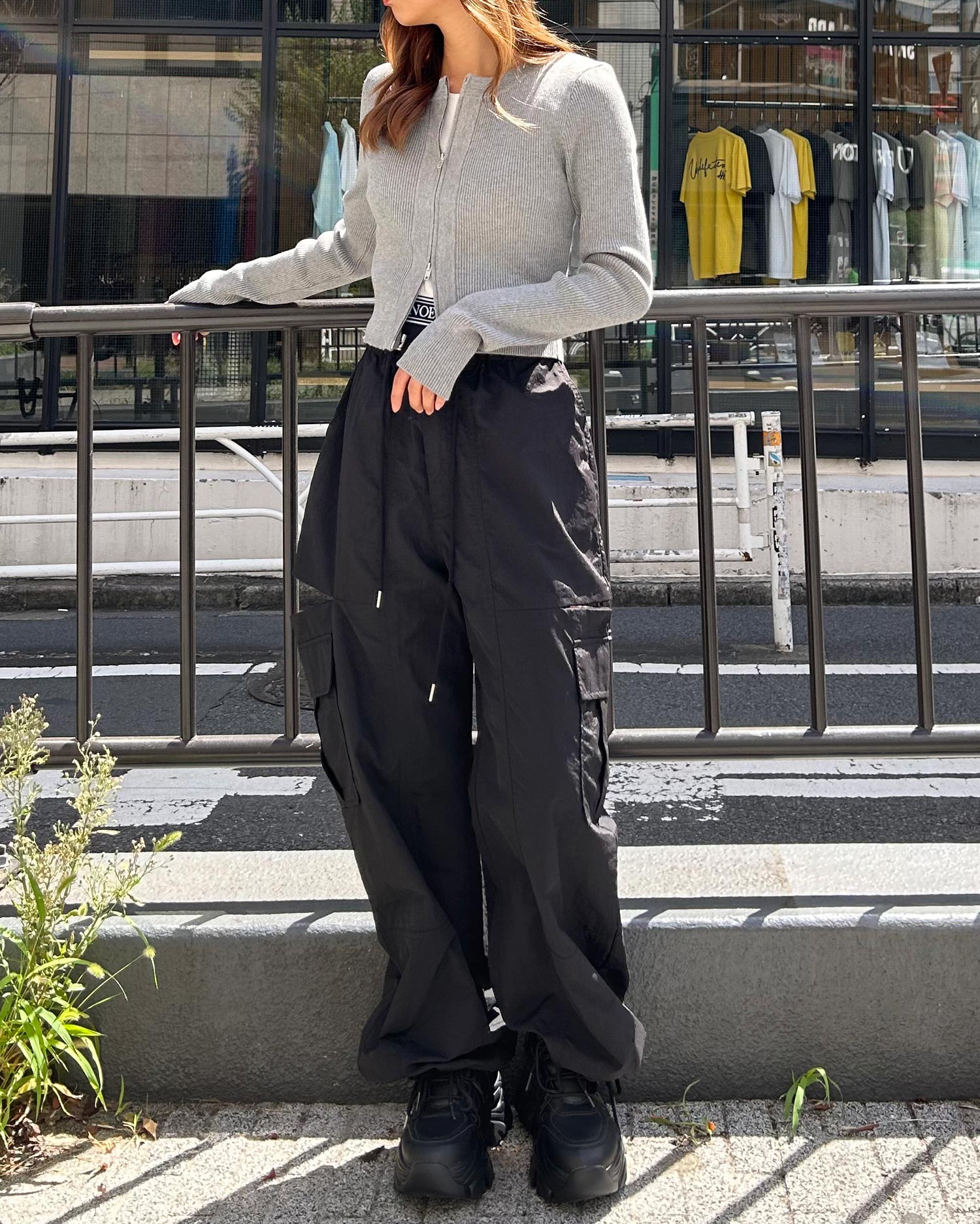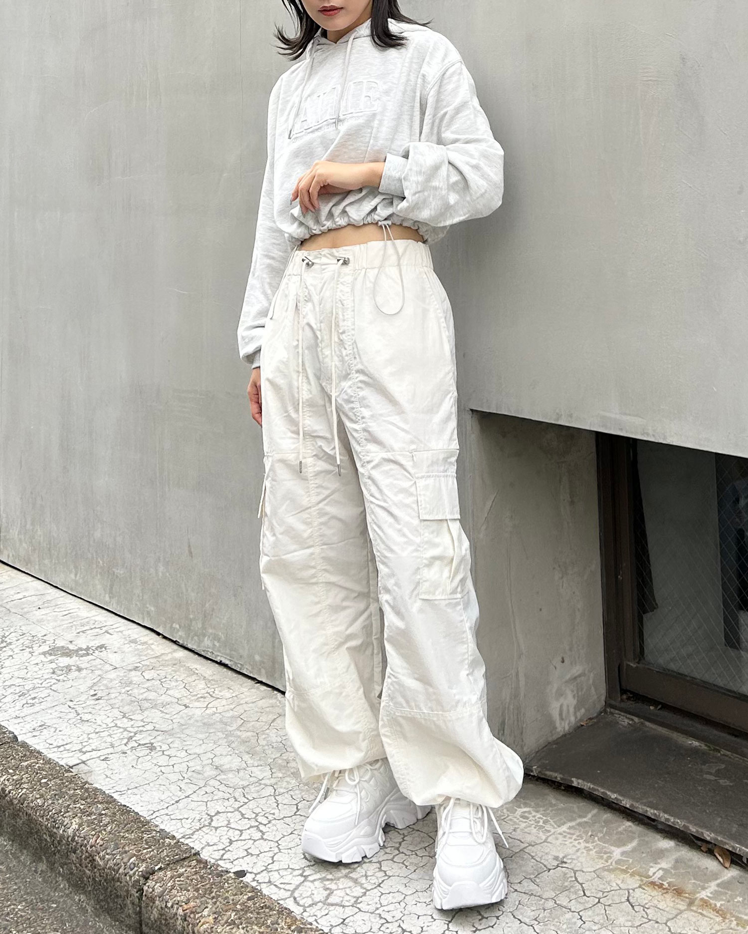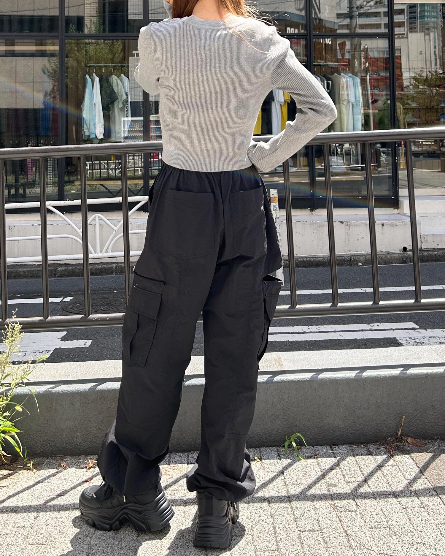 ・シャリ感のあるナイロンの生地で仕立てたカーゴパンツです。
