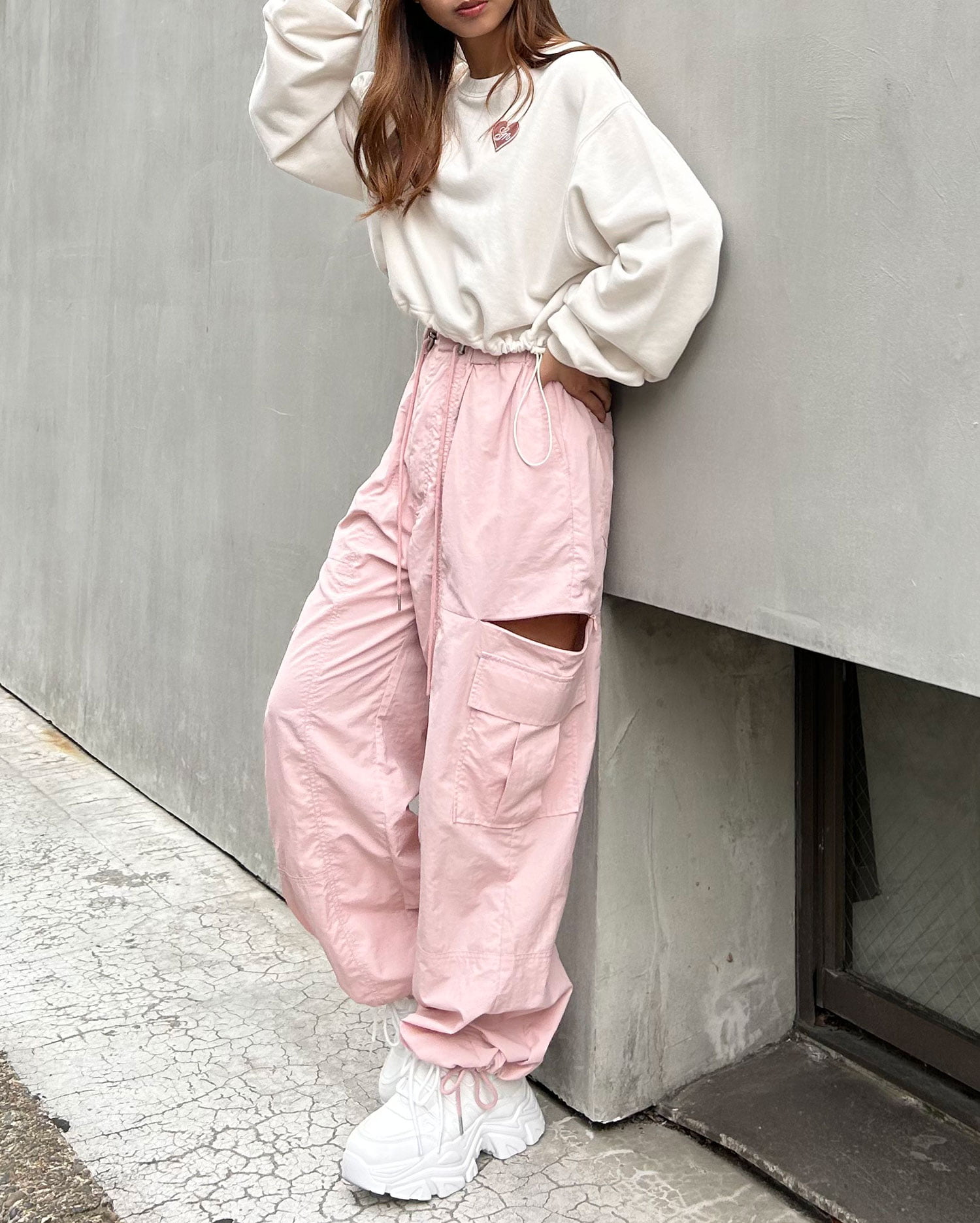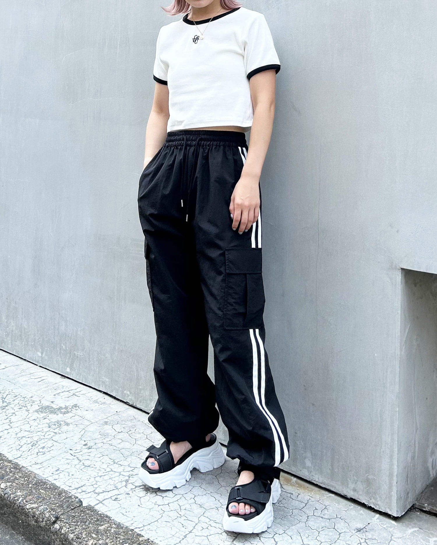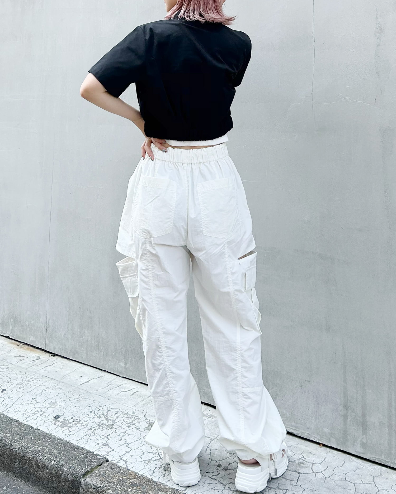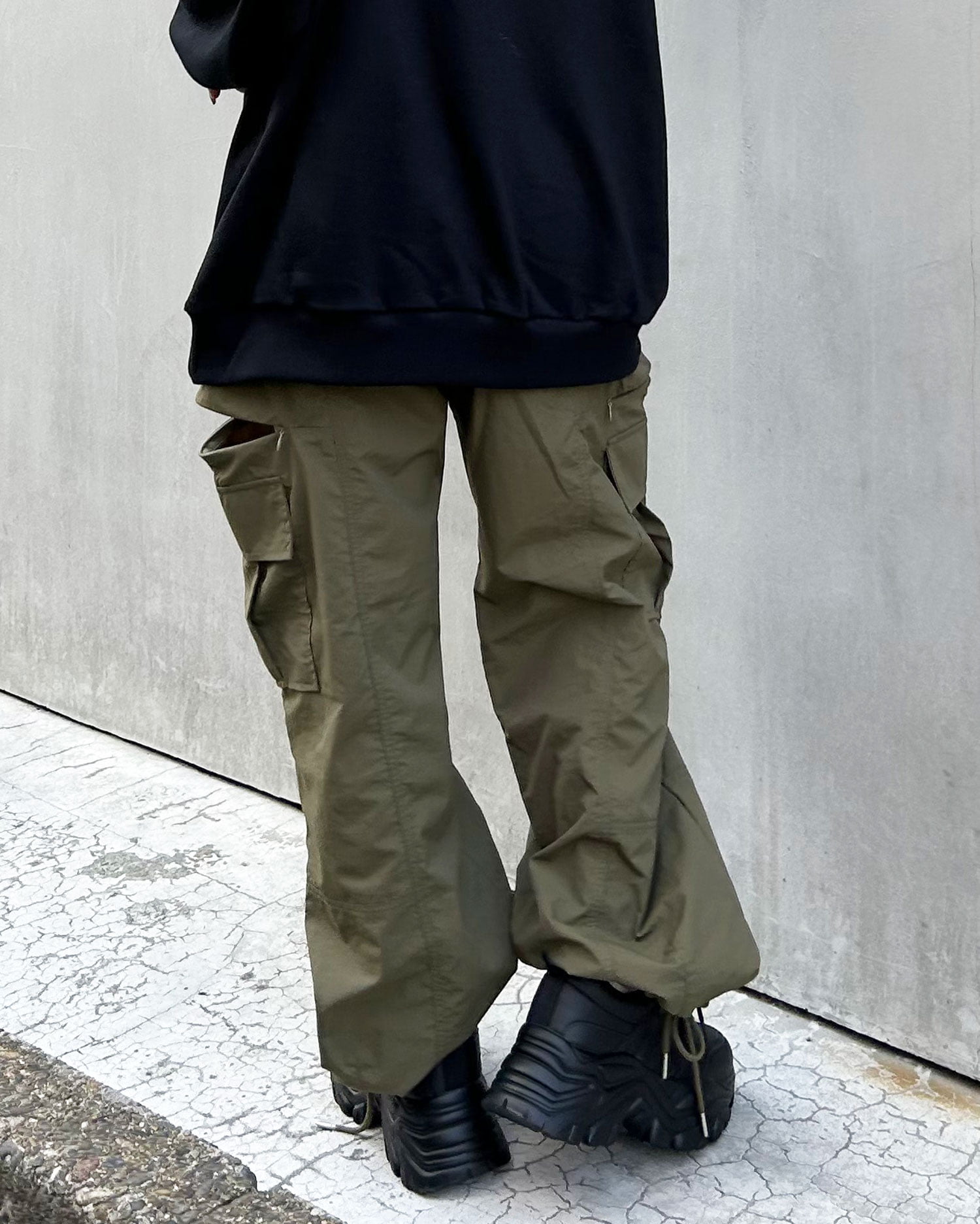 ・シャリ感のあるナイロンの生地で仕立てたカーゴパンツです。