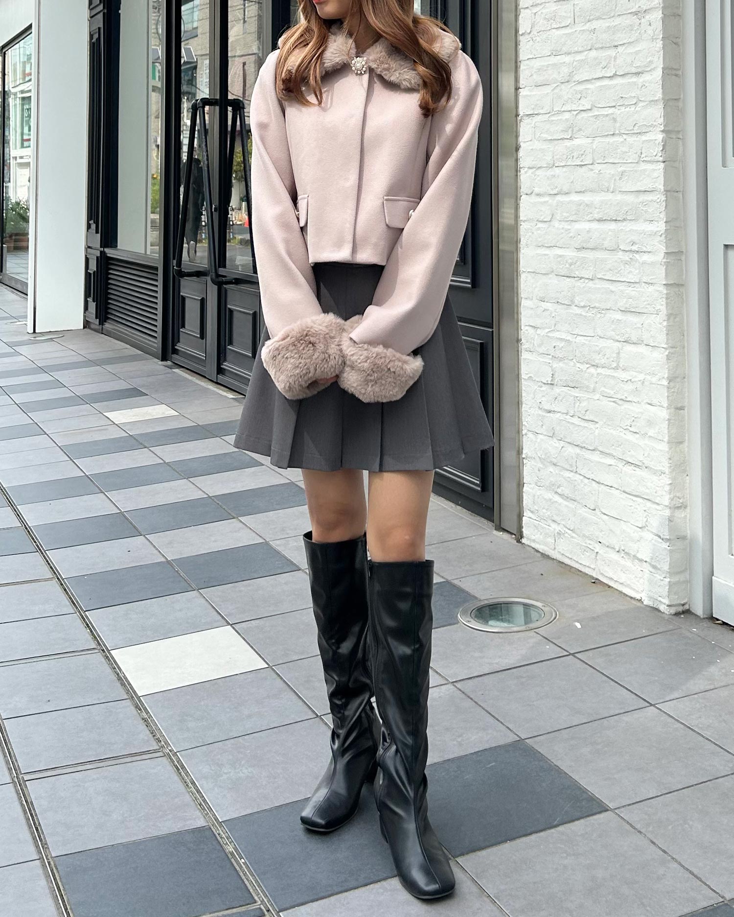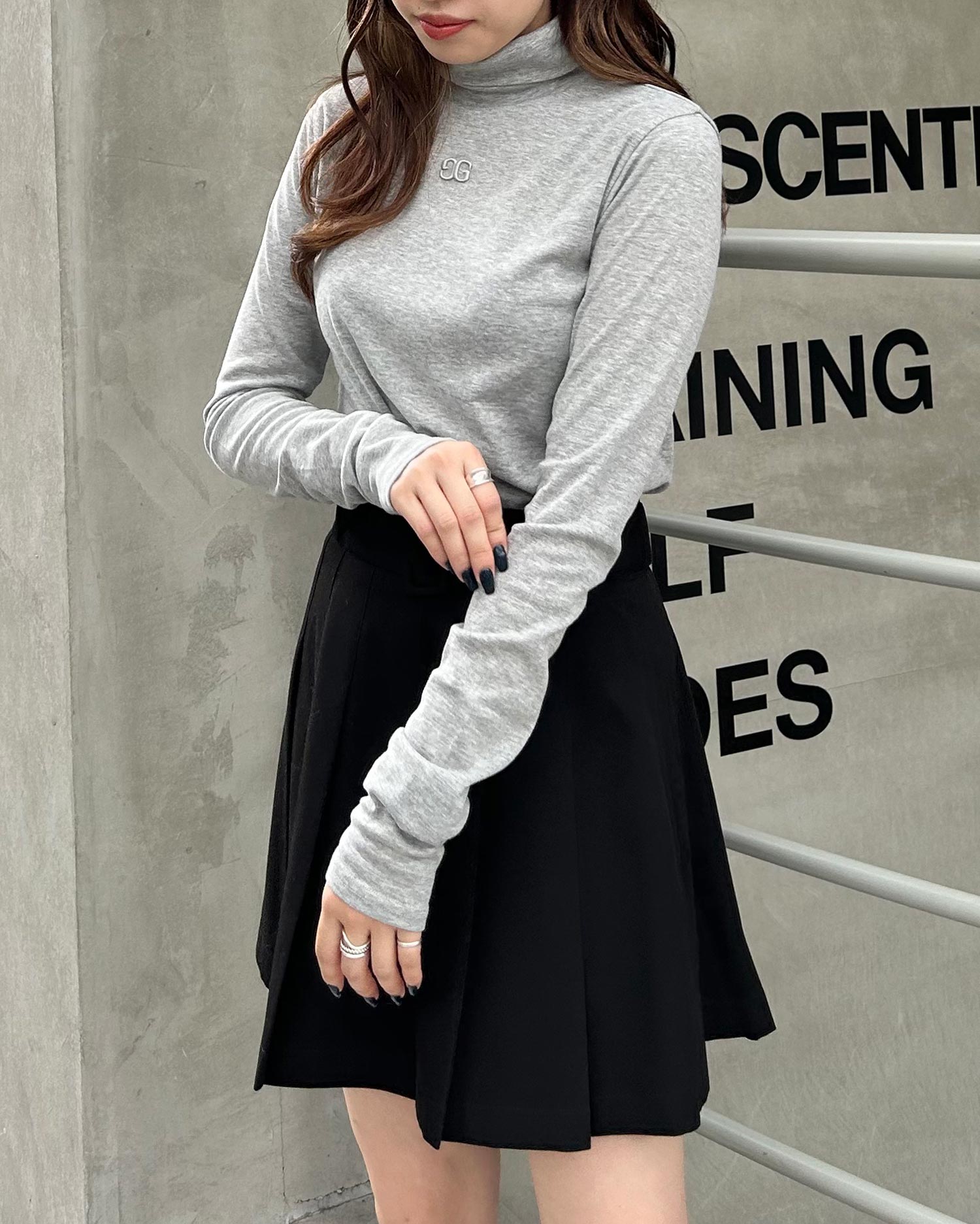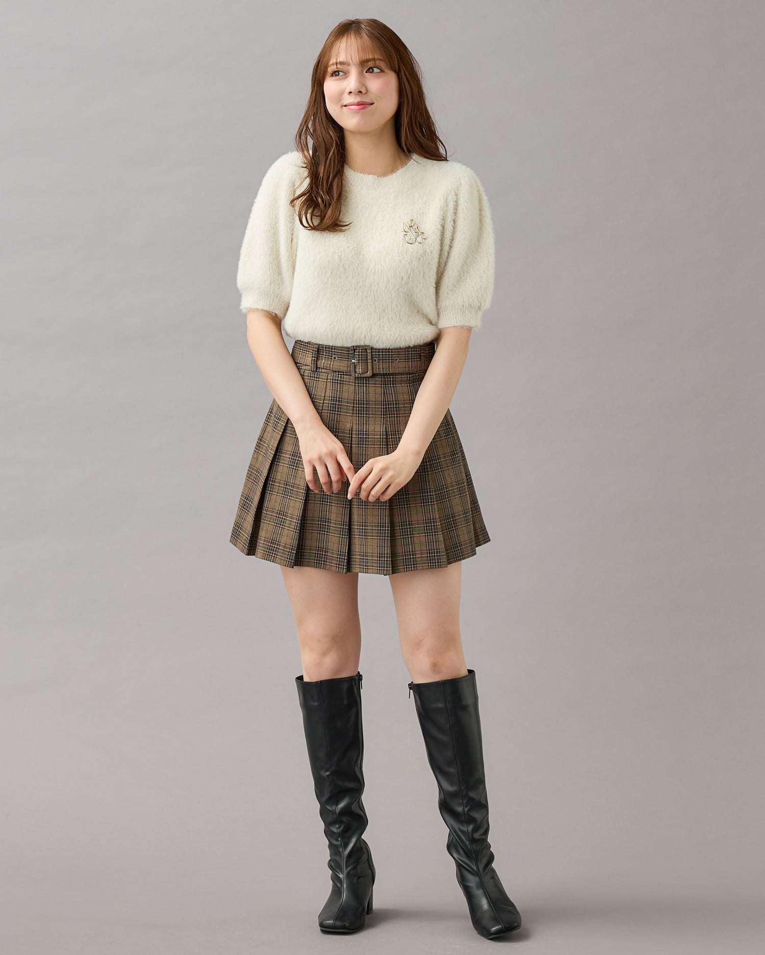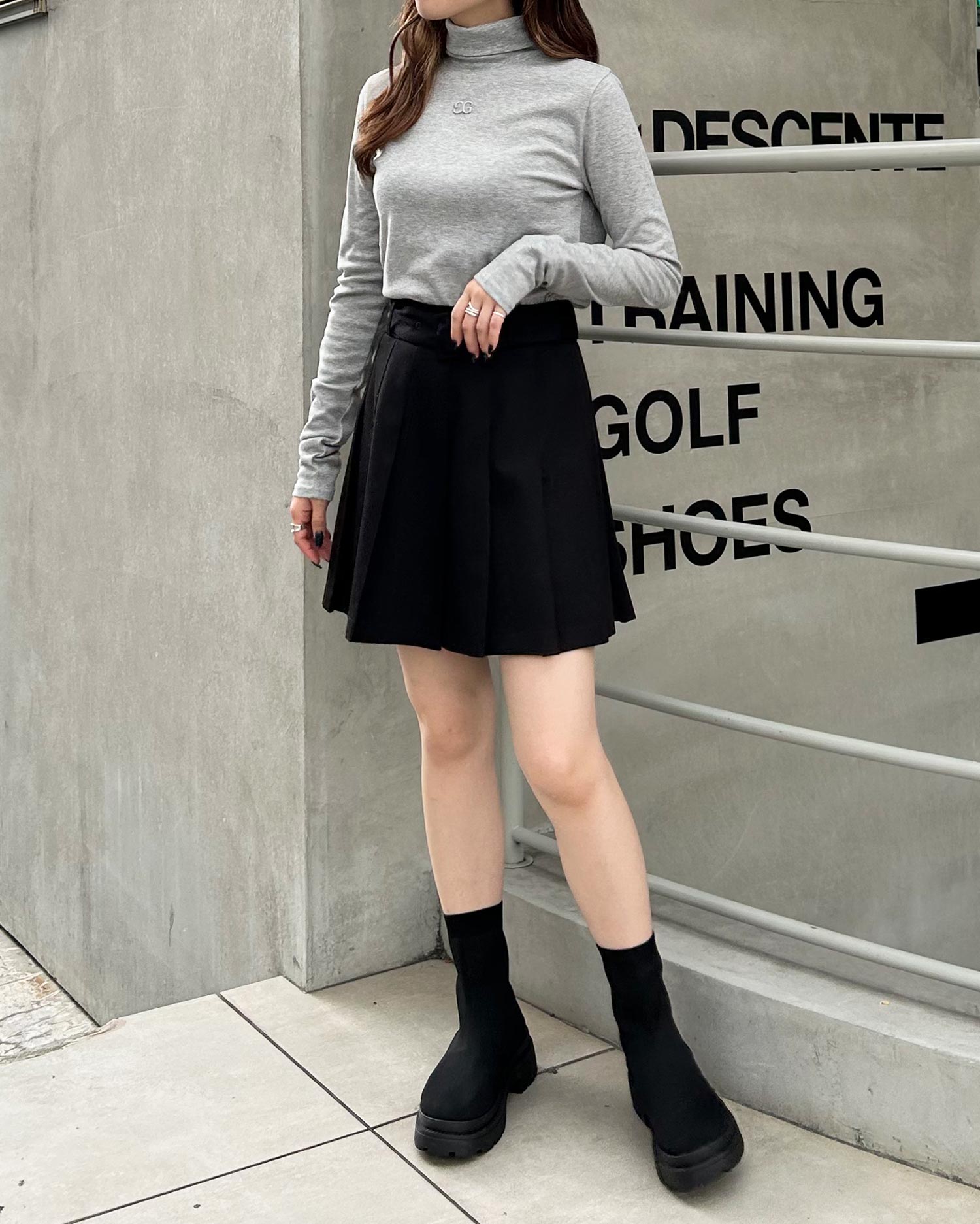 スクールガールのようなプリーツスカートは裏地がパンツデザインになっているので