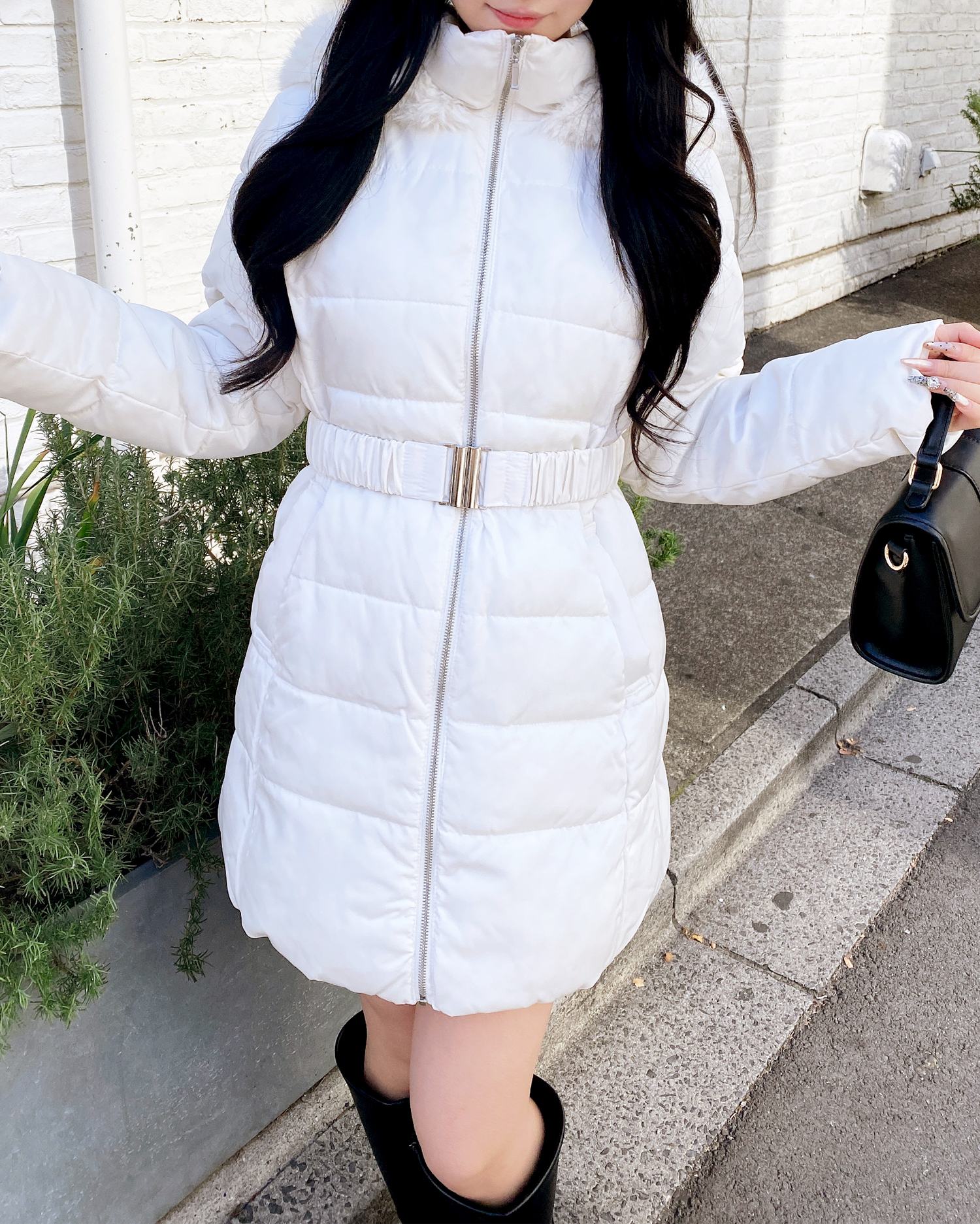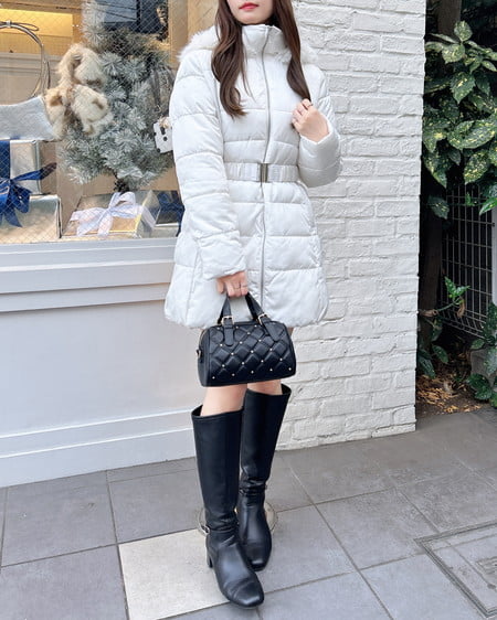 あったかエコダウンなのに、ウエストマークのベルトと絶妙な丈感◎