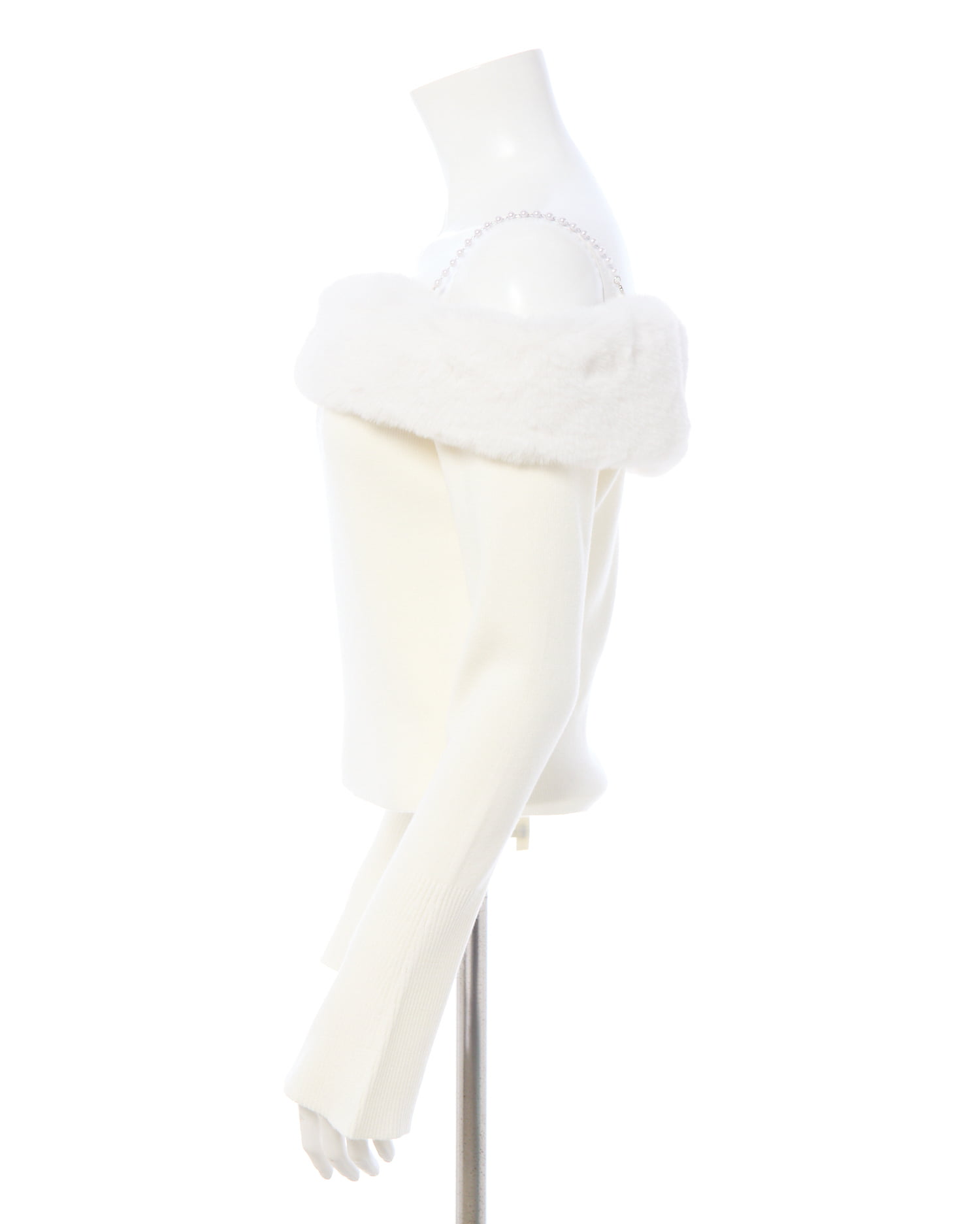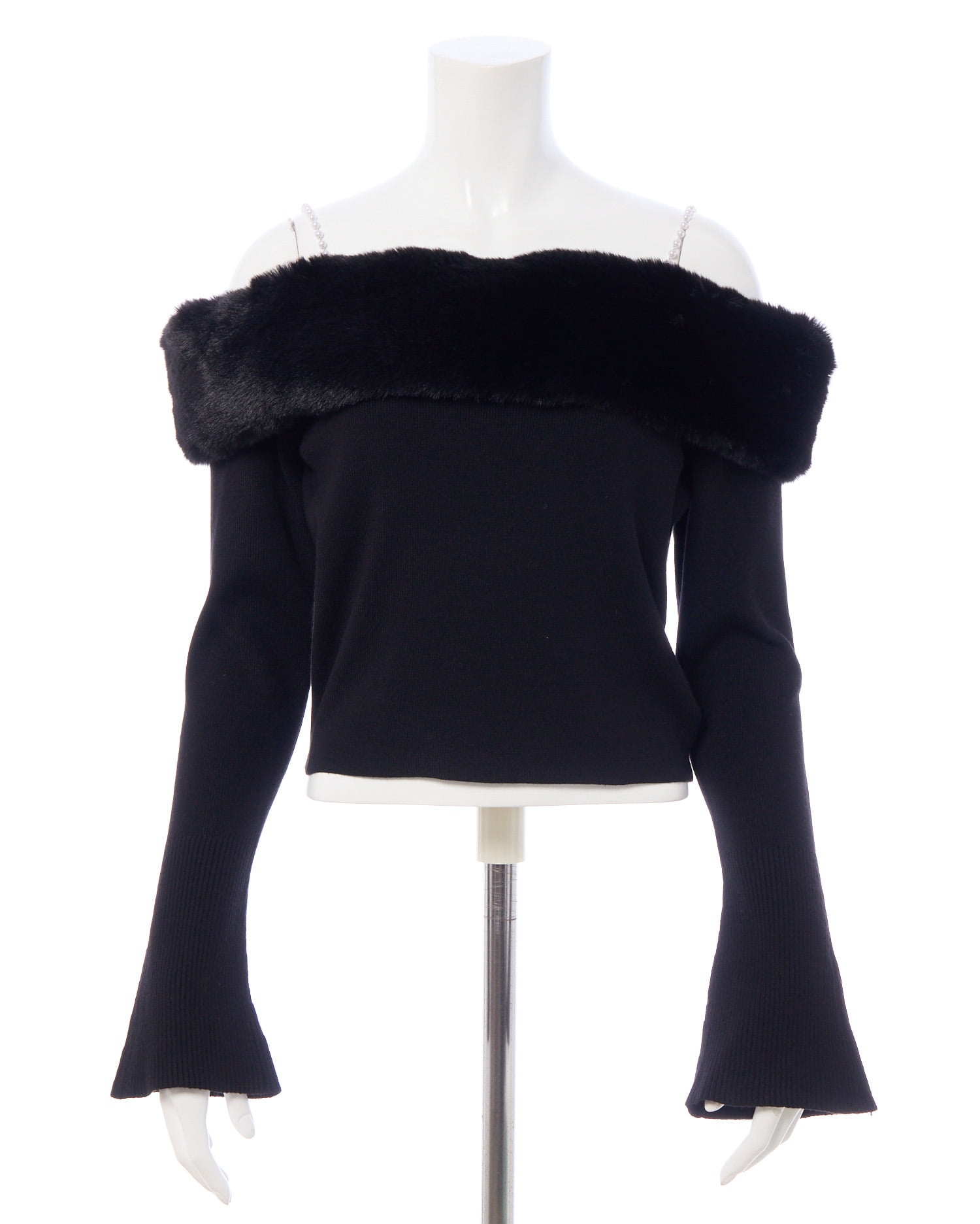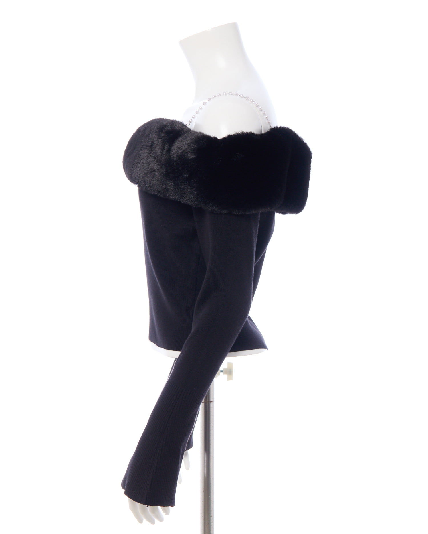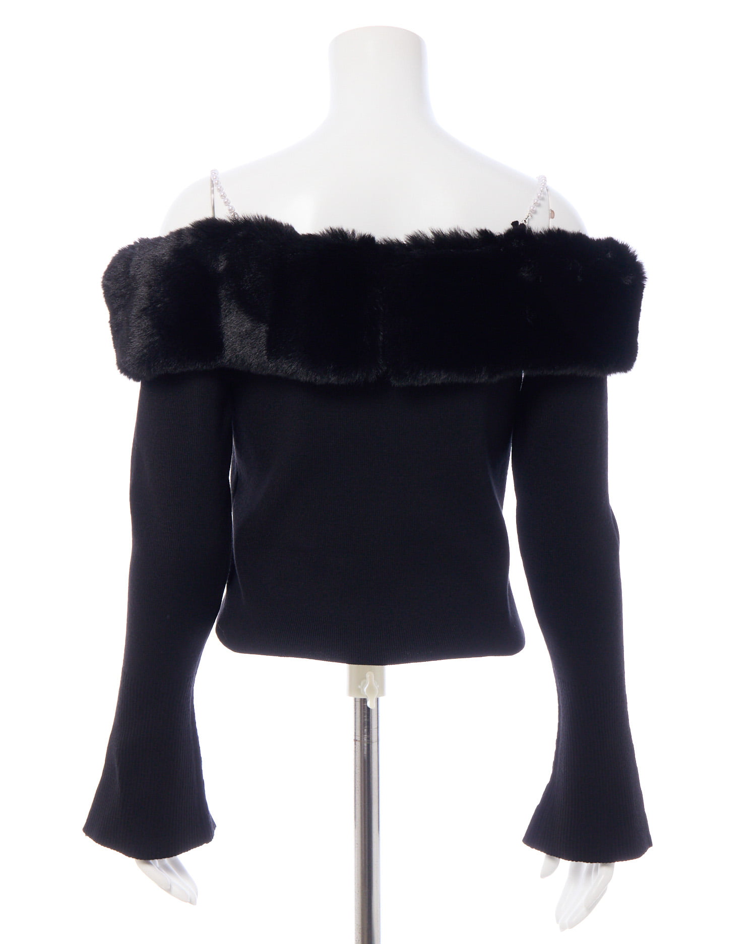 肩紐のパールと胸元にあしらわれたエコファーがポイントのオフショルニットです!
