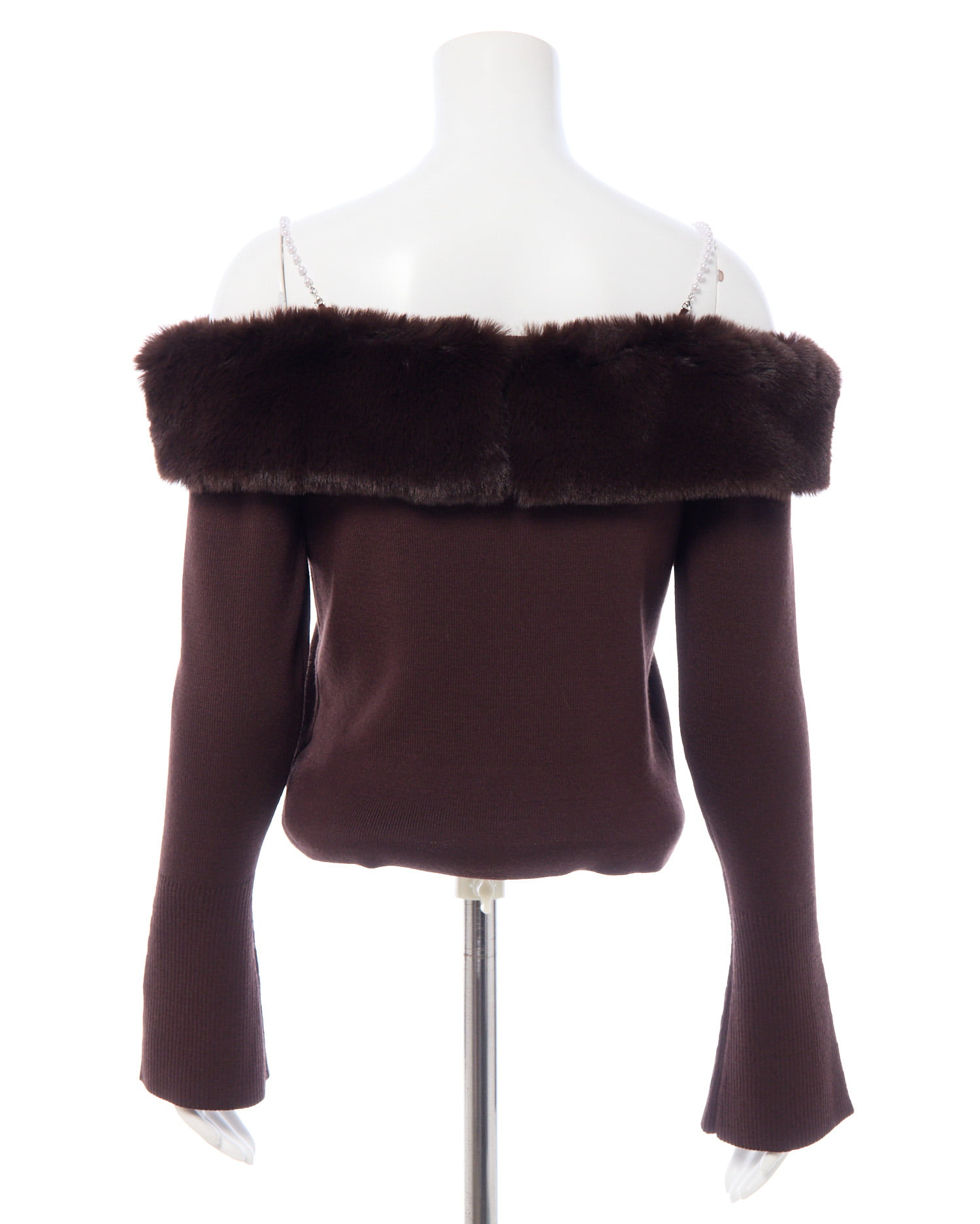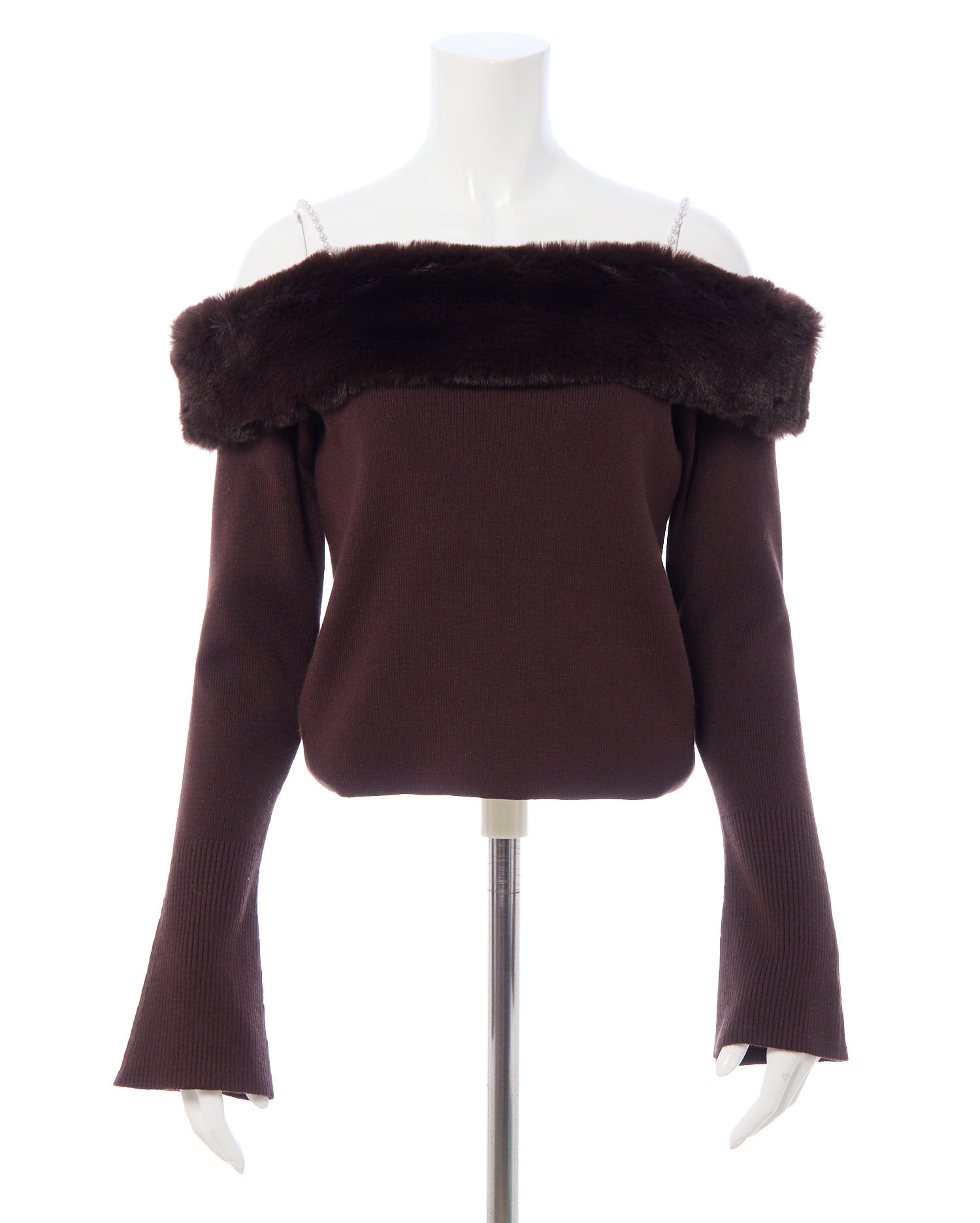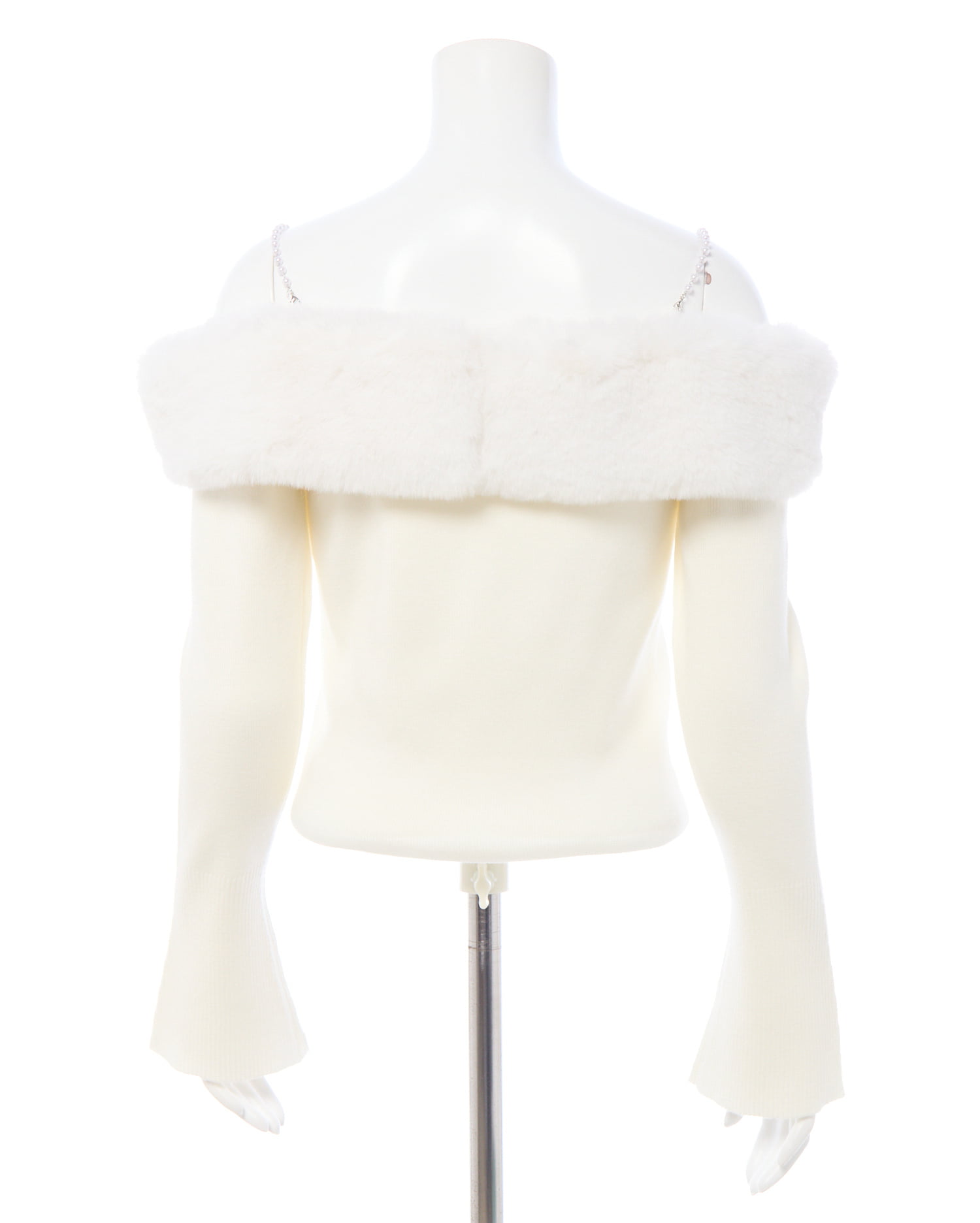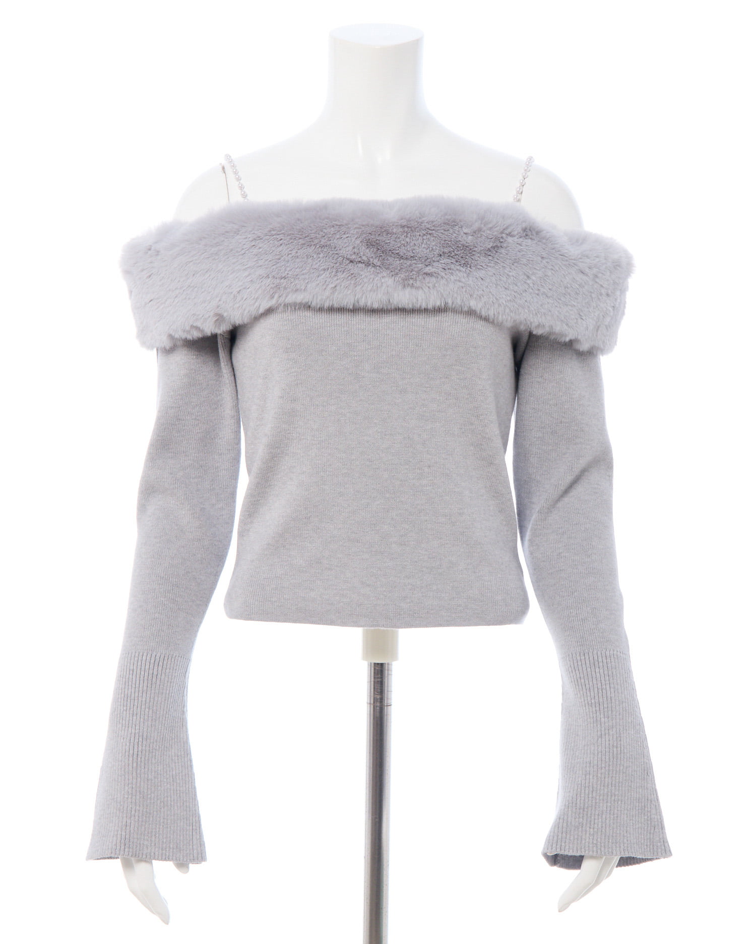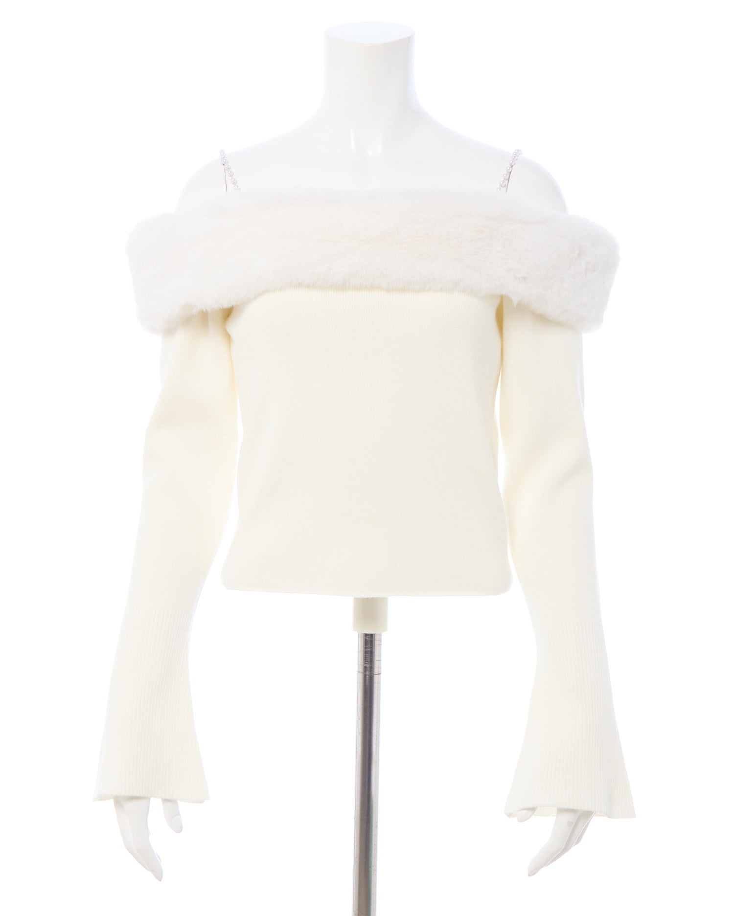 肩紐のパールと胸元にあしらわれたエコファーがポイントのオフショルニットです!