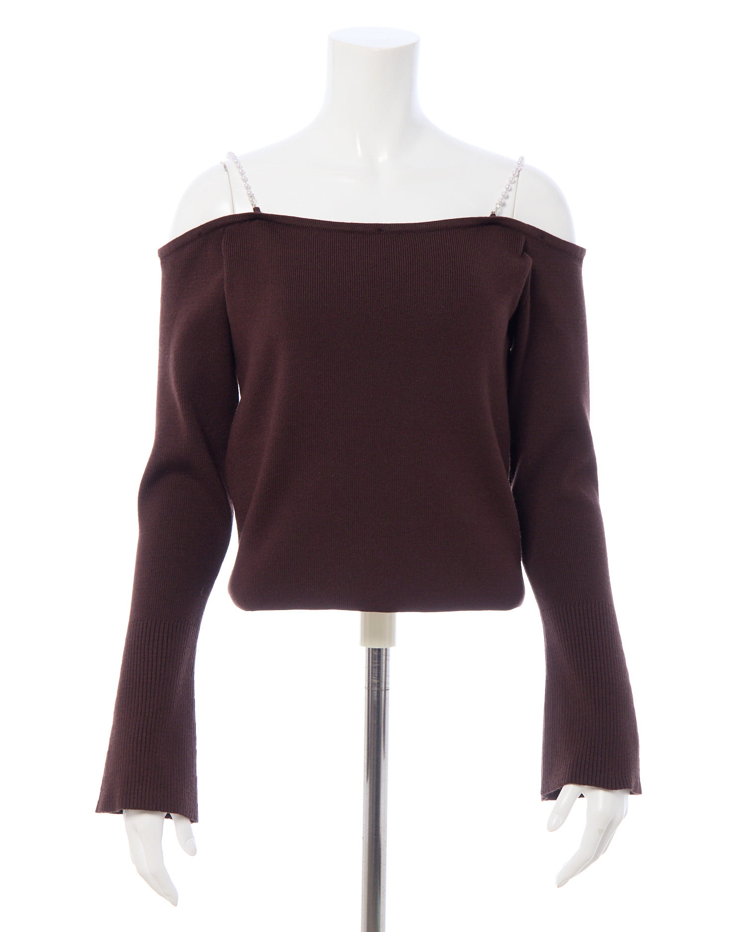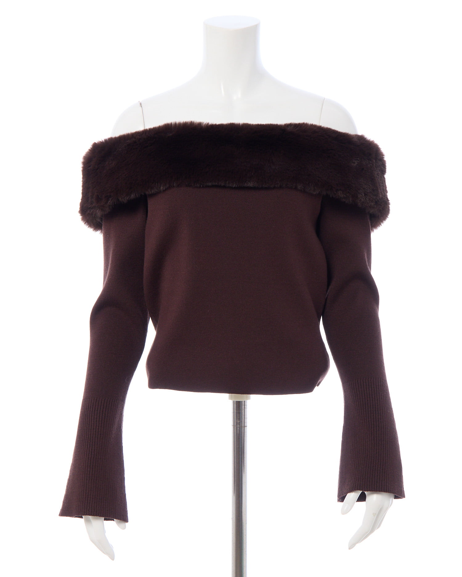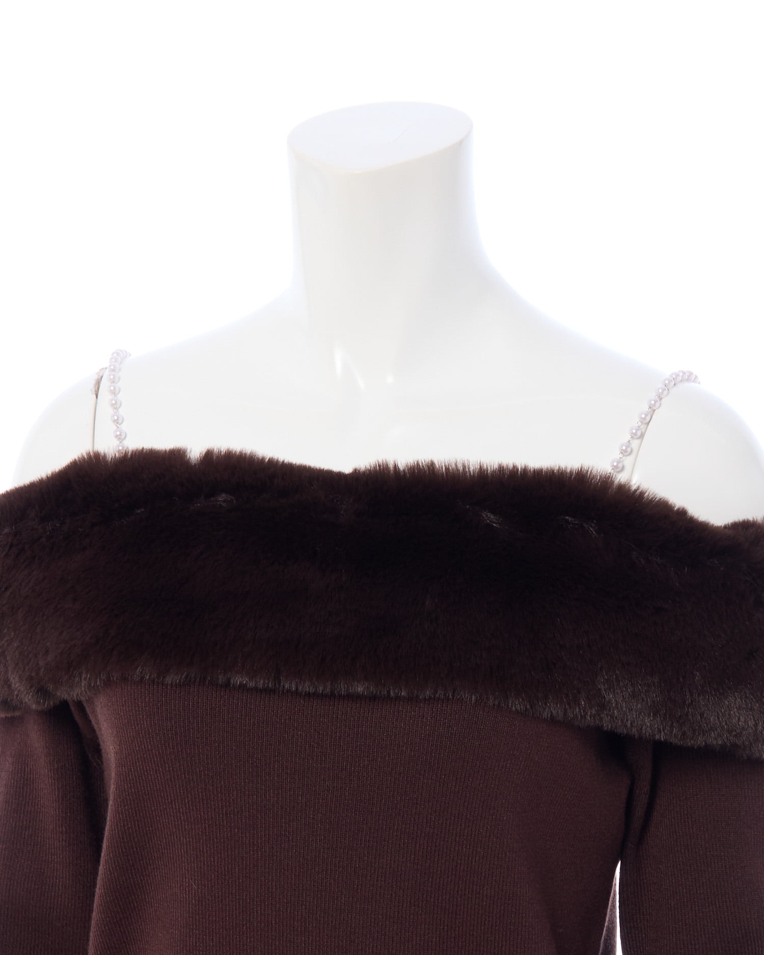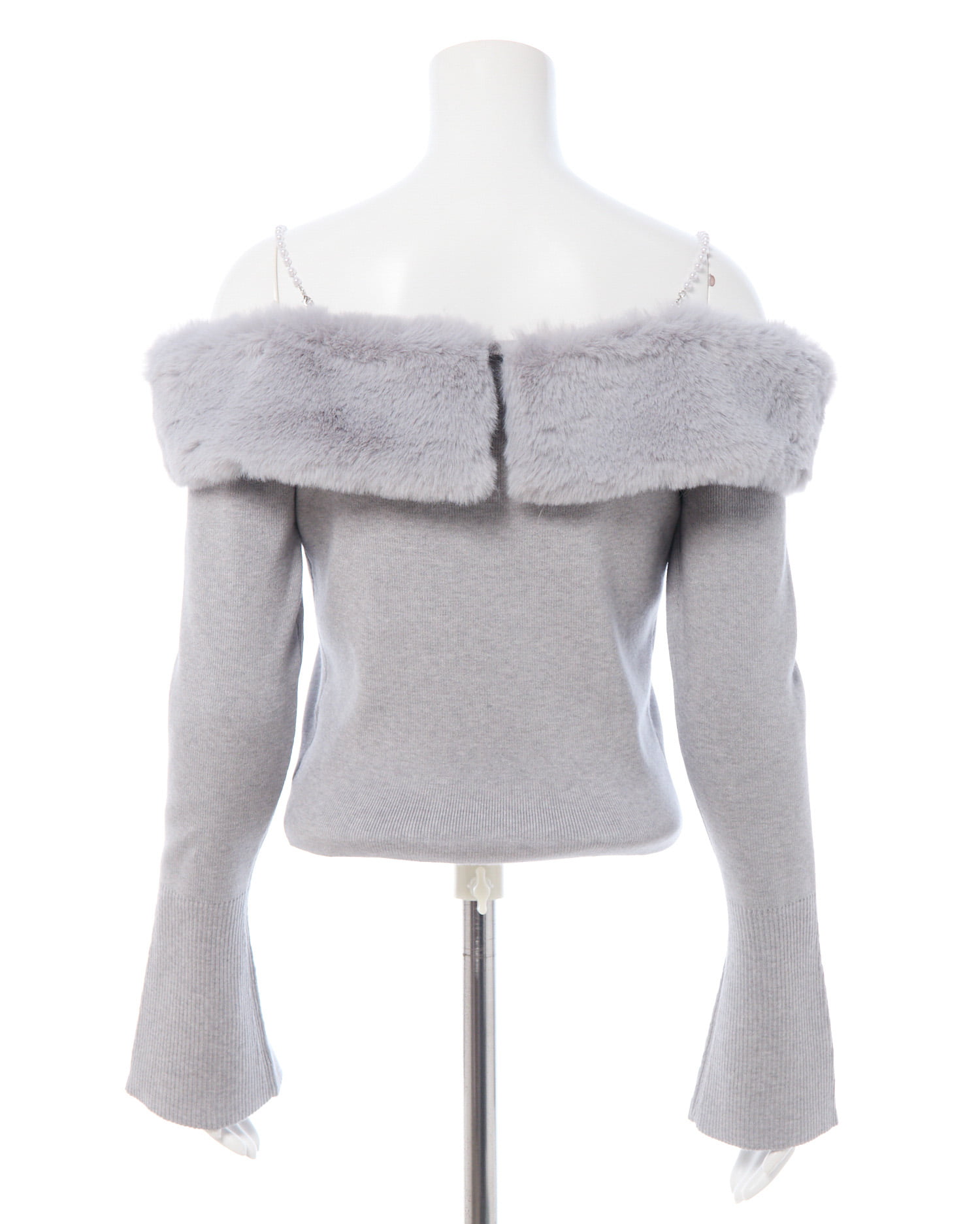 肩紐のパールと胸元にあしらわれたエコファーがポイントのオフショルニットです!