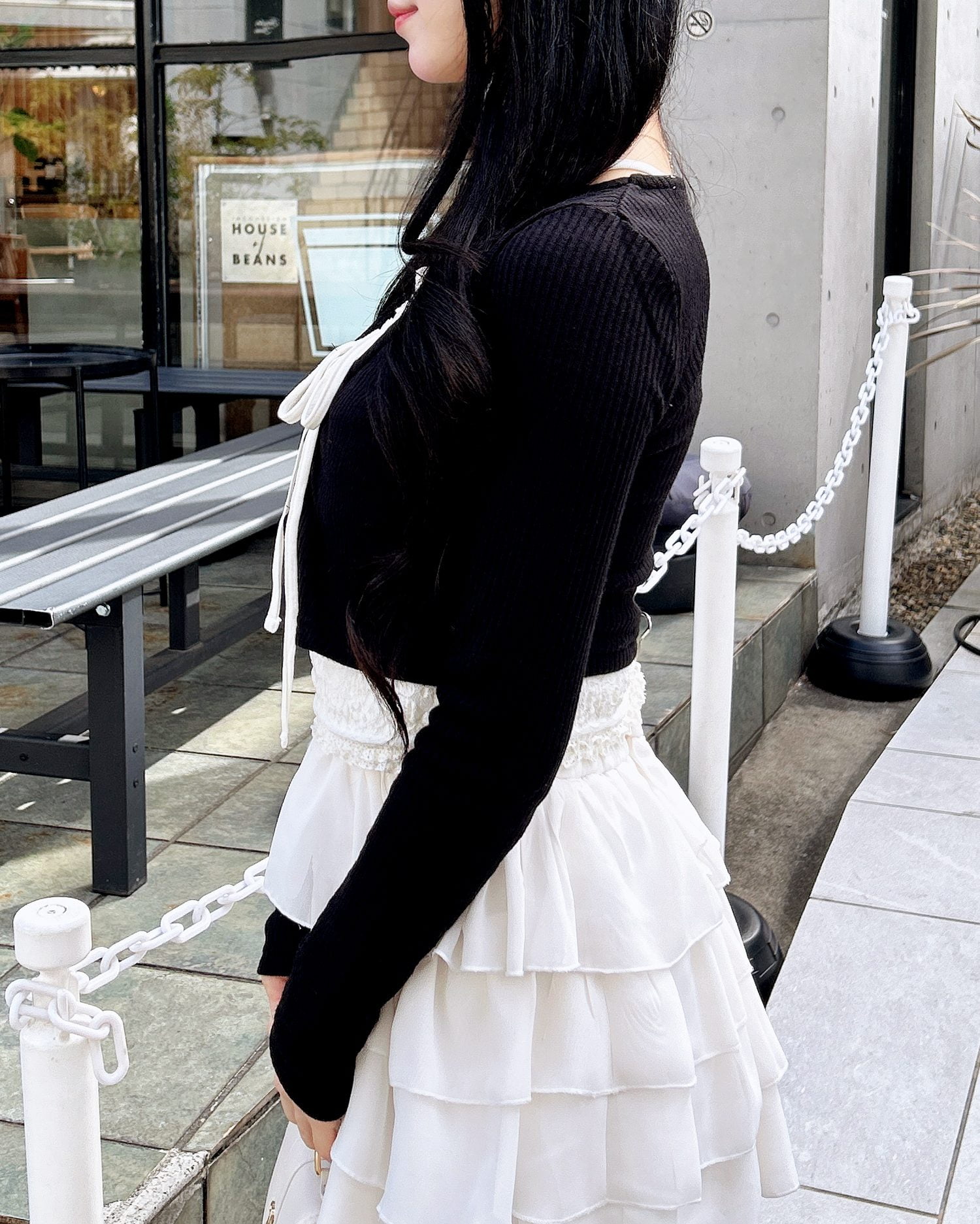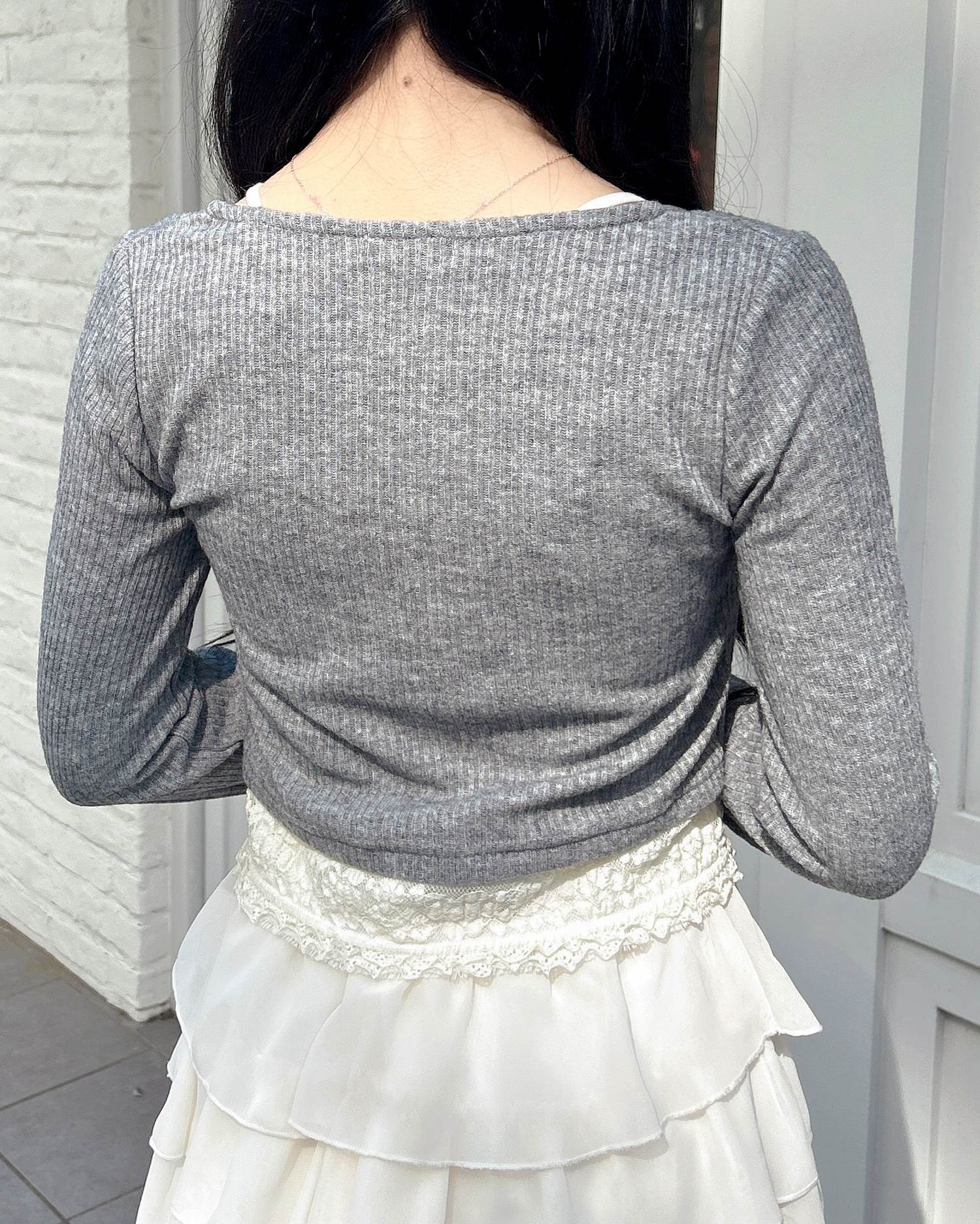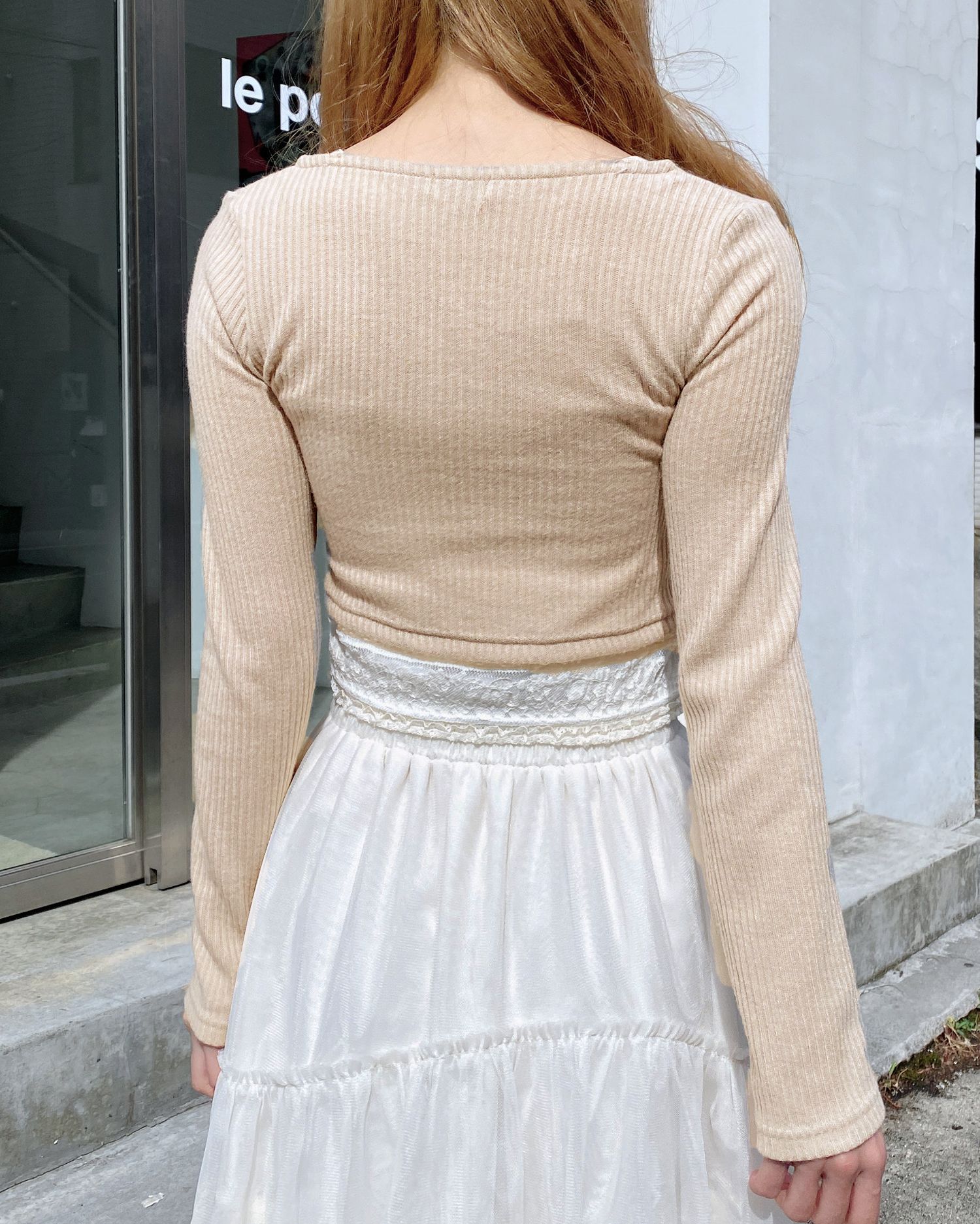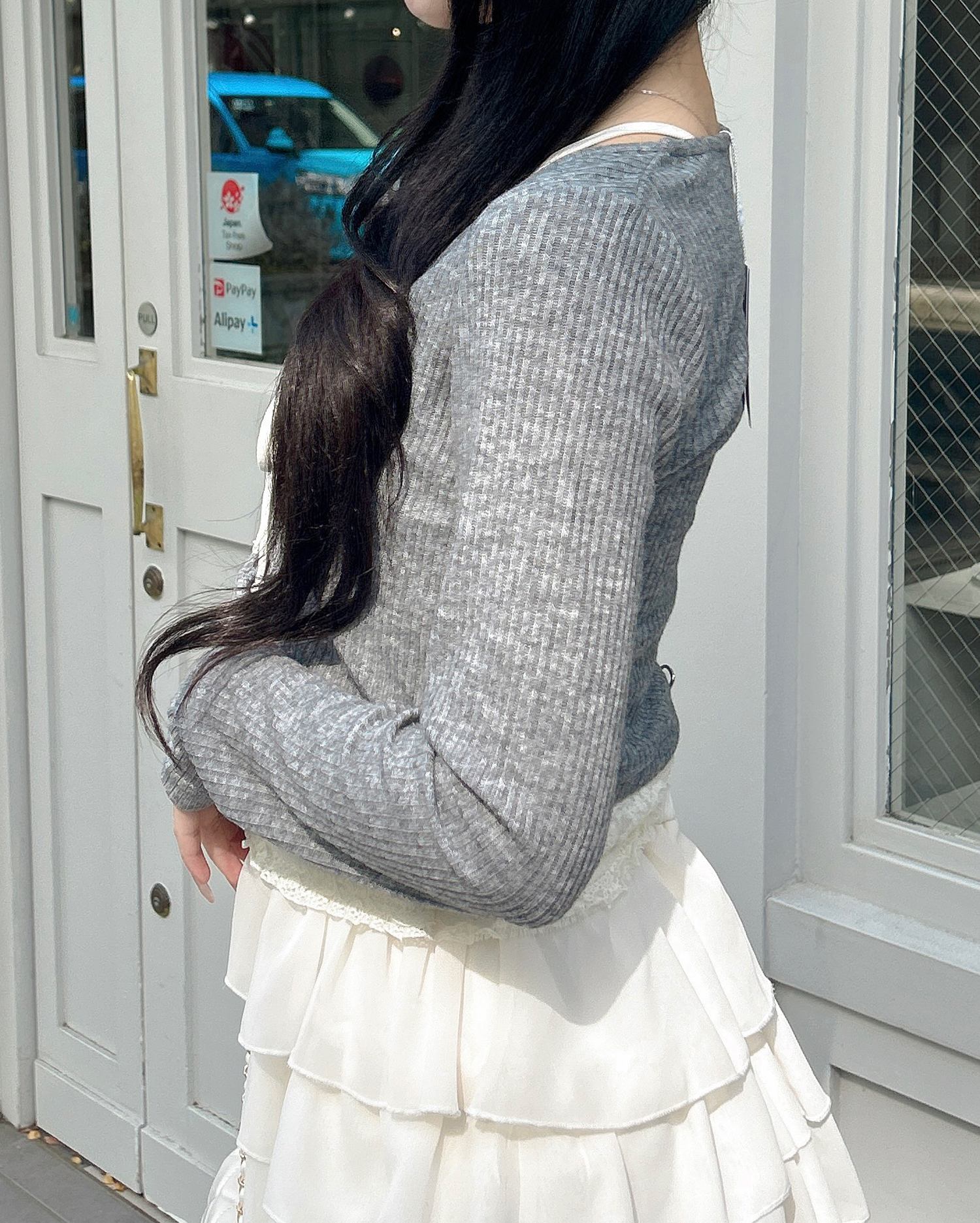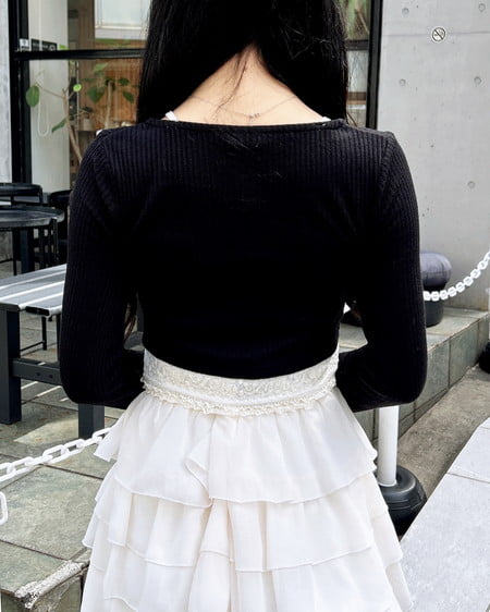 広めに開いたネックラインが顔周りを明るく彩ります。