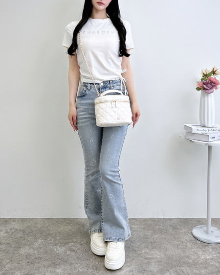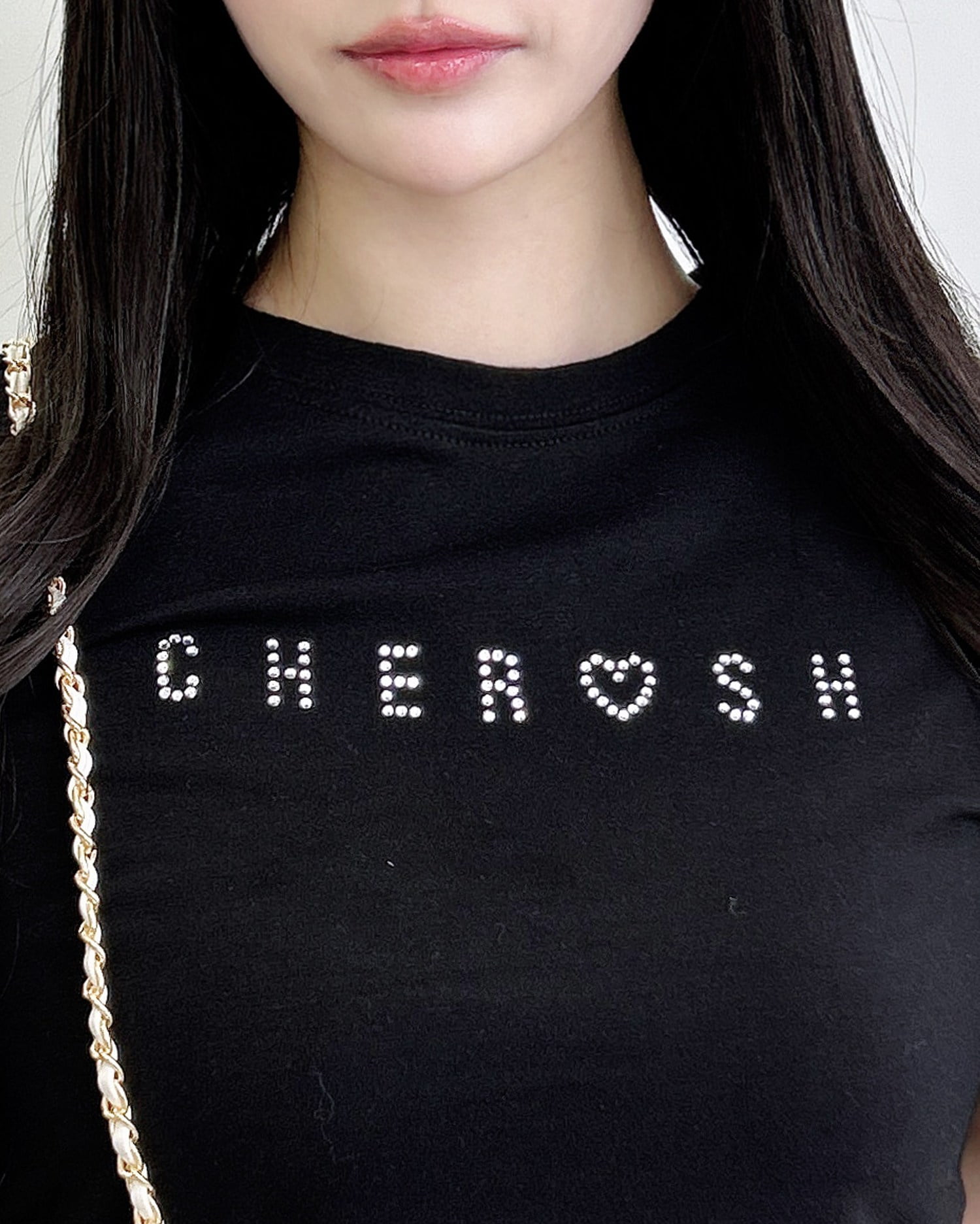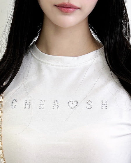フロントのラインストーンロゴがアクセントのTシャツ。