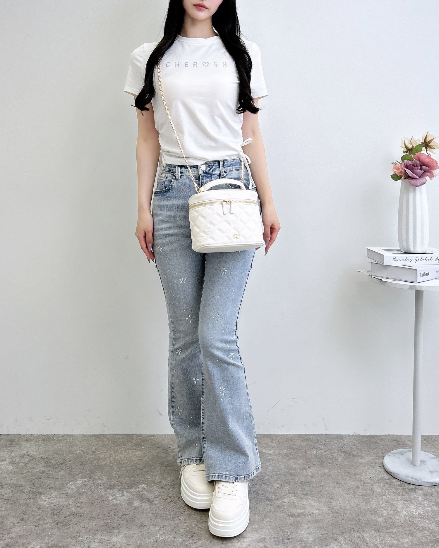• INGNI(イング) サイドギャザーリボンラインストーンロゴTシャツ オフホワイト