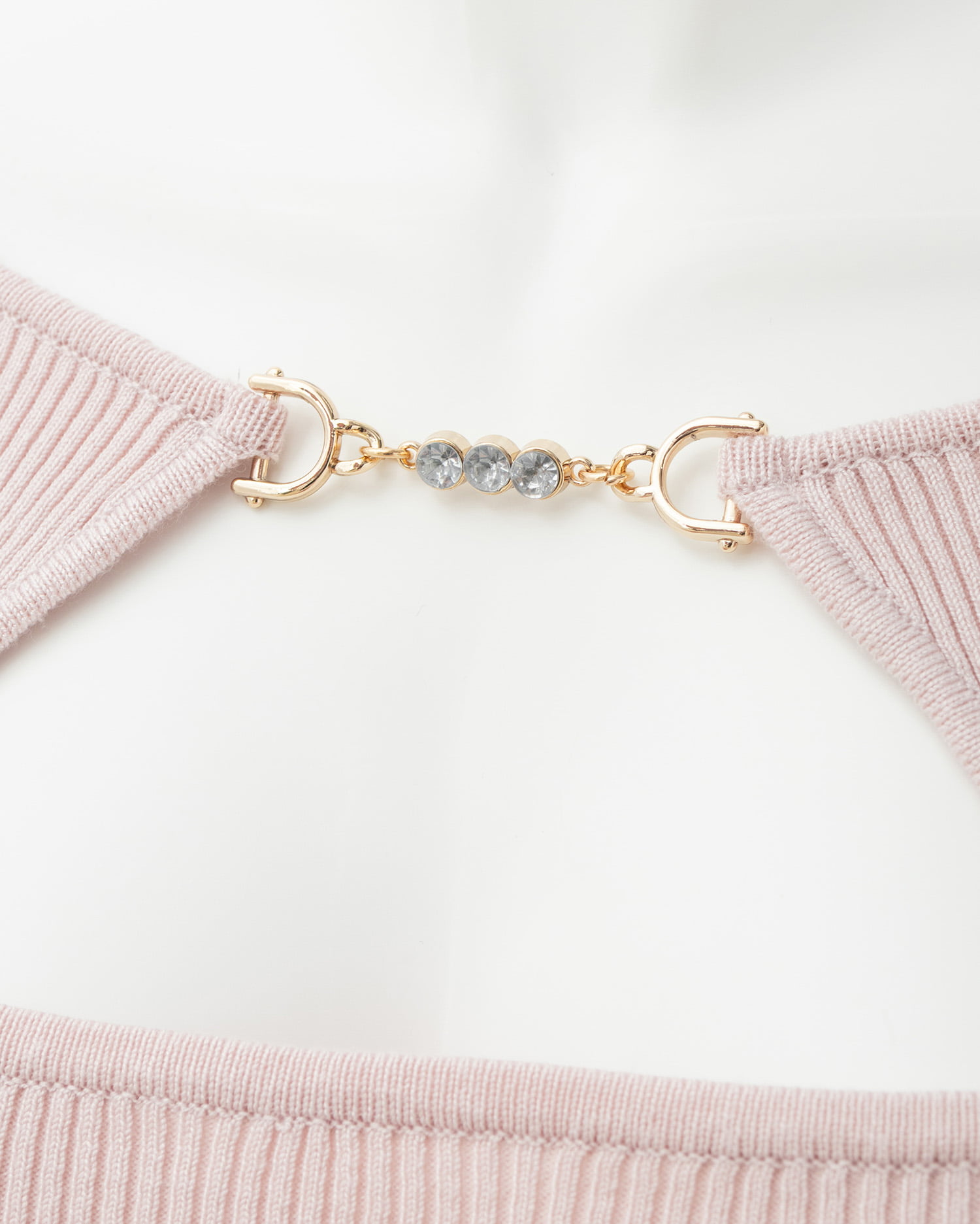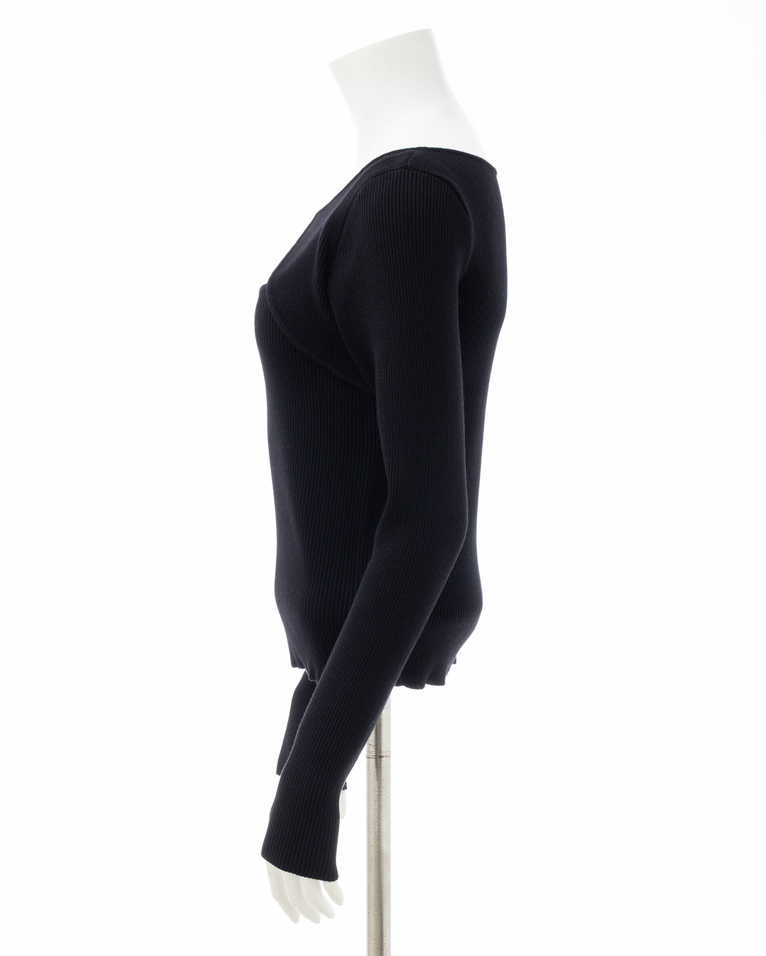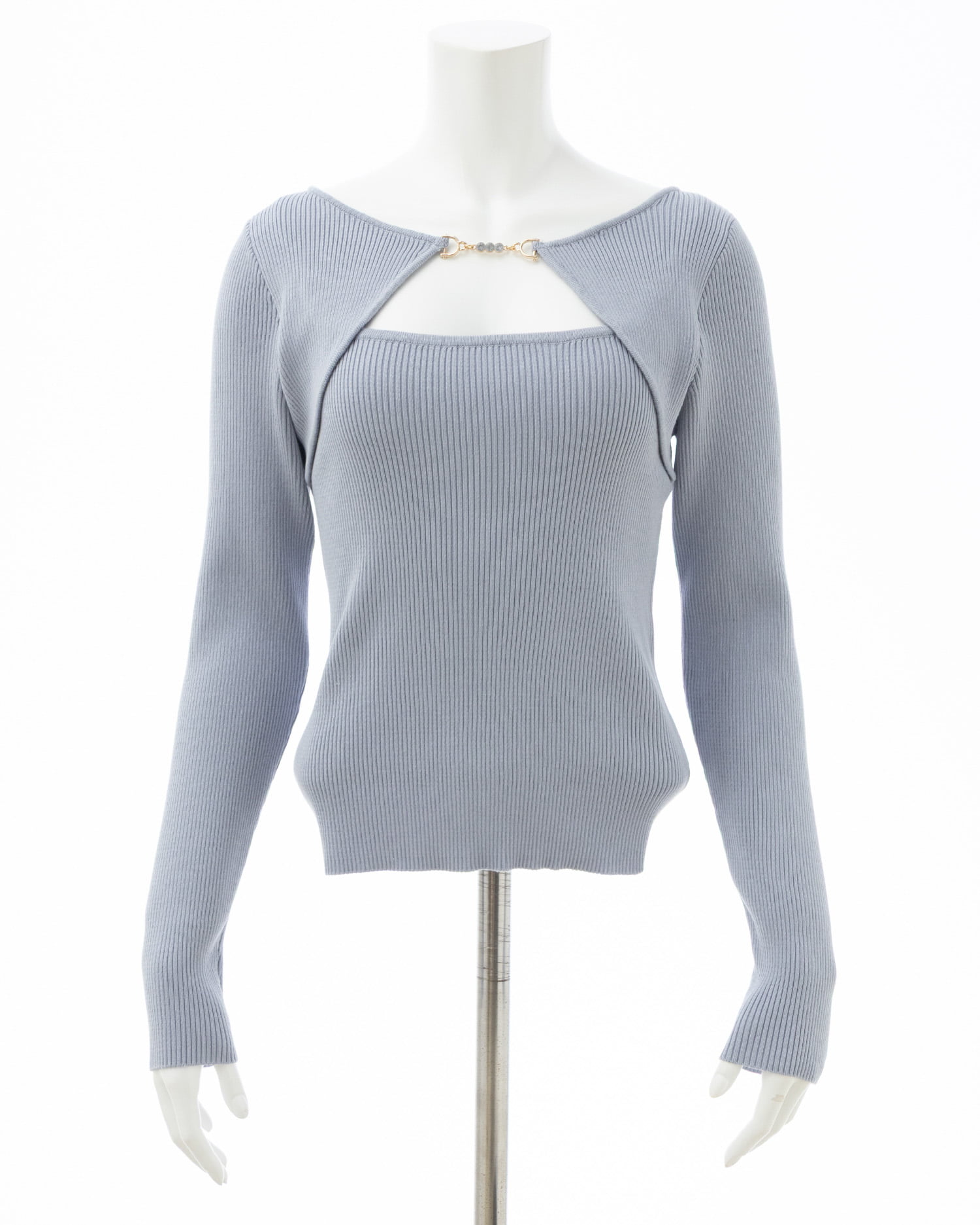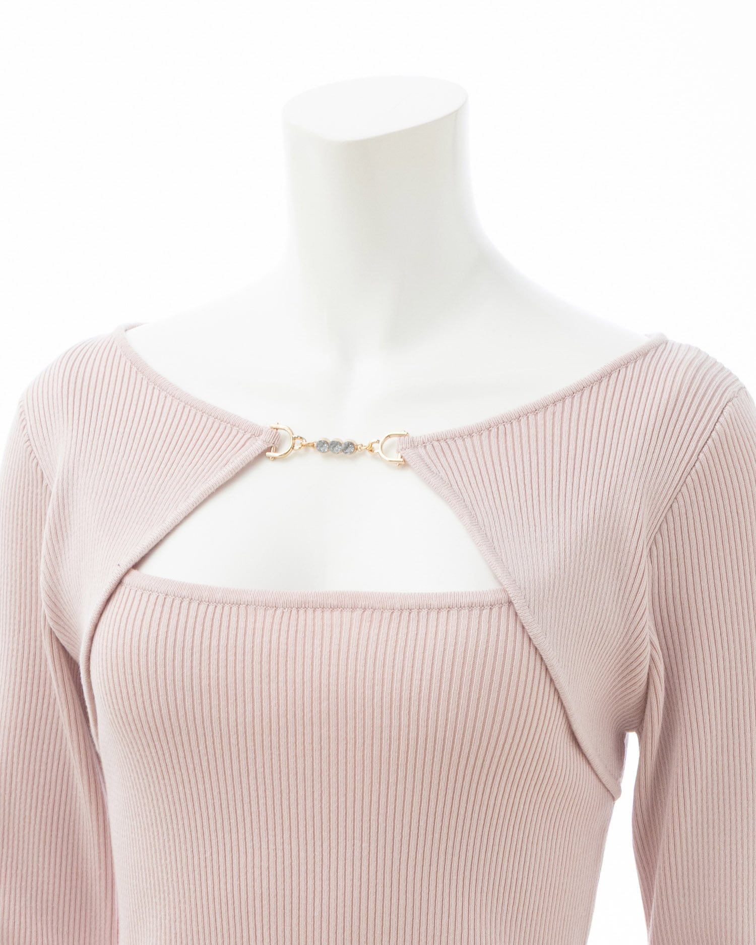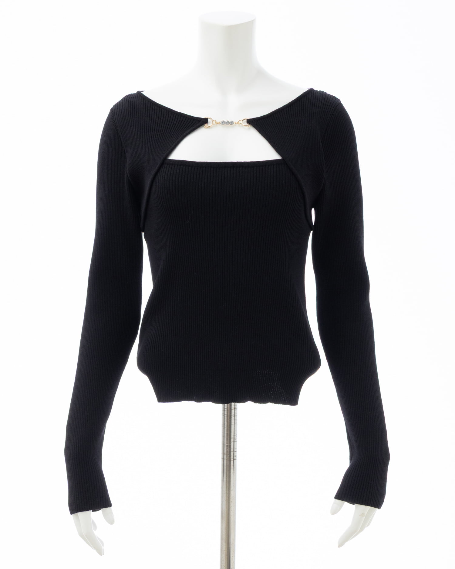 広めのスクエアネックにあしらったビットが華やかなニットトップスです。