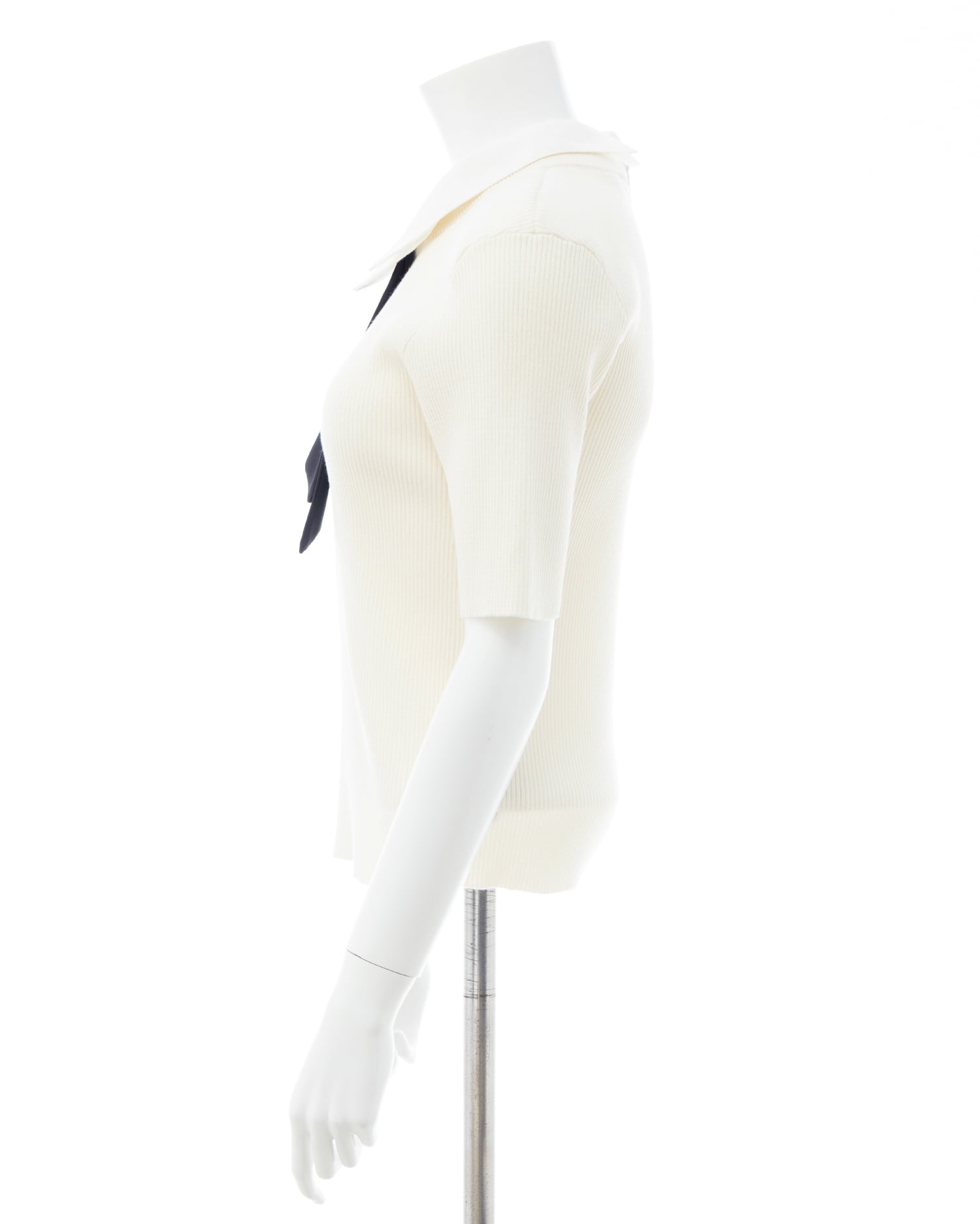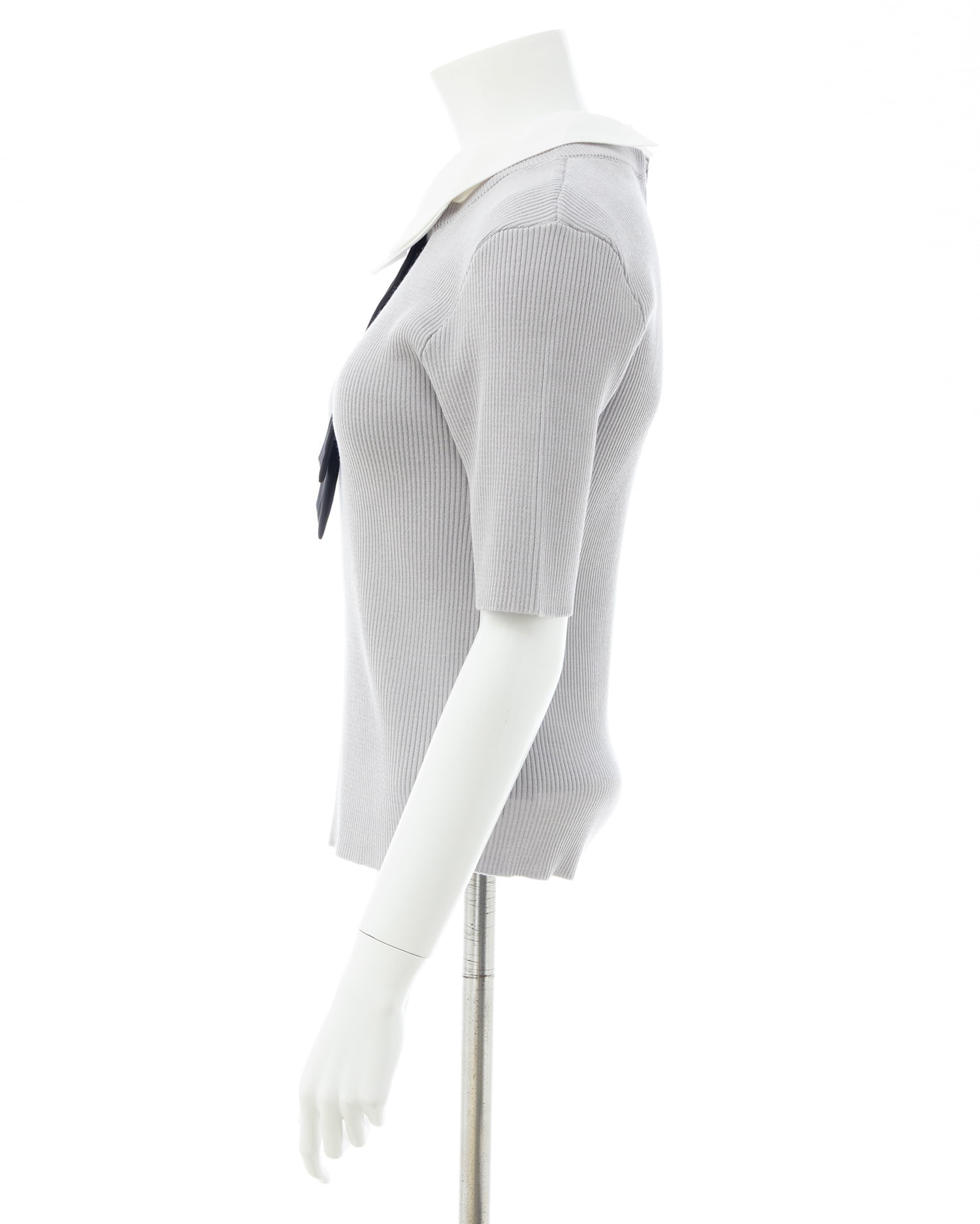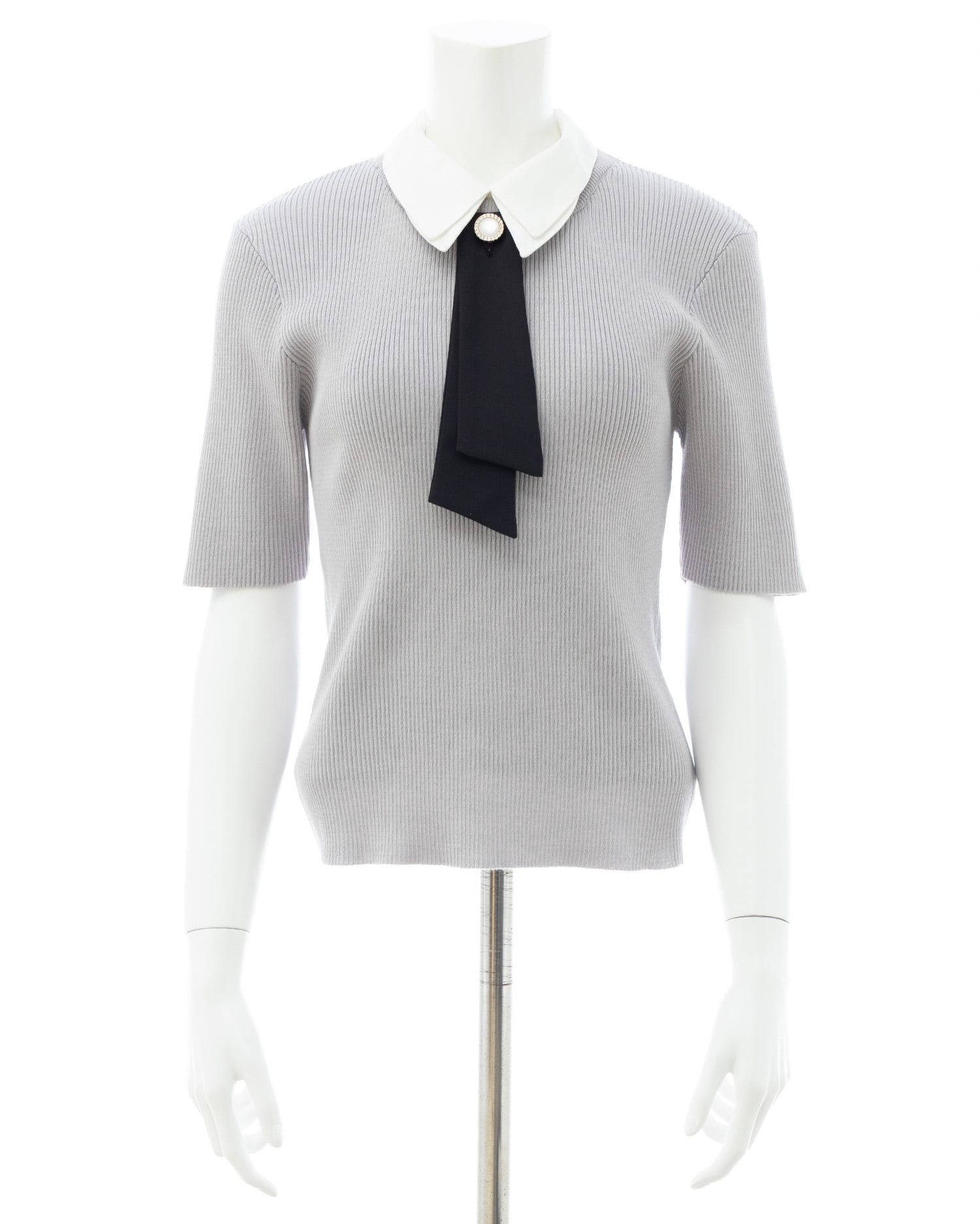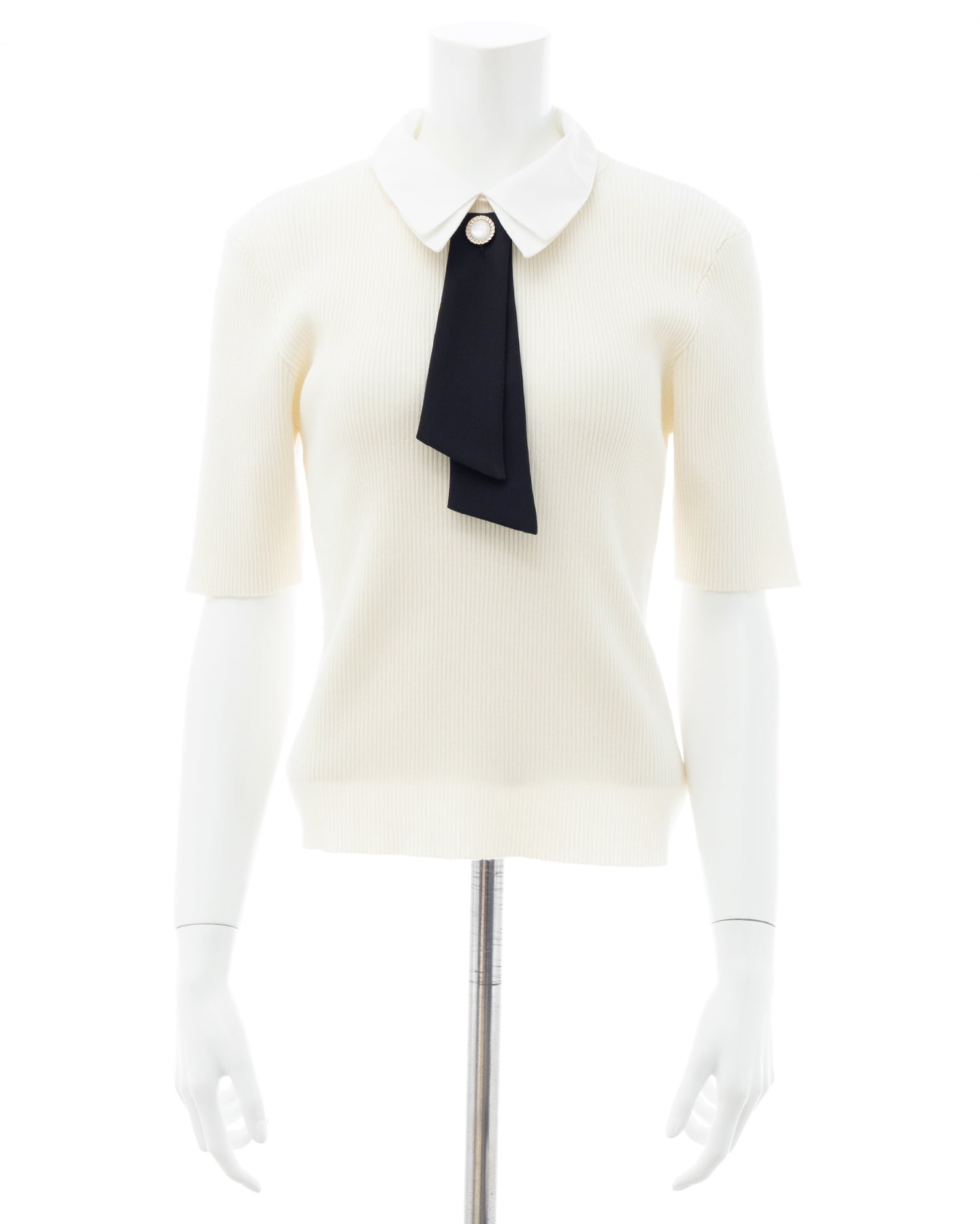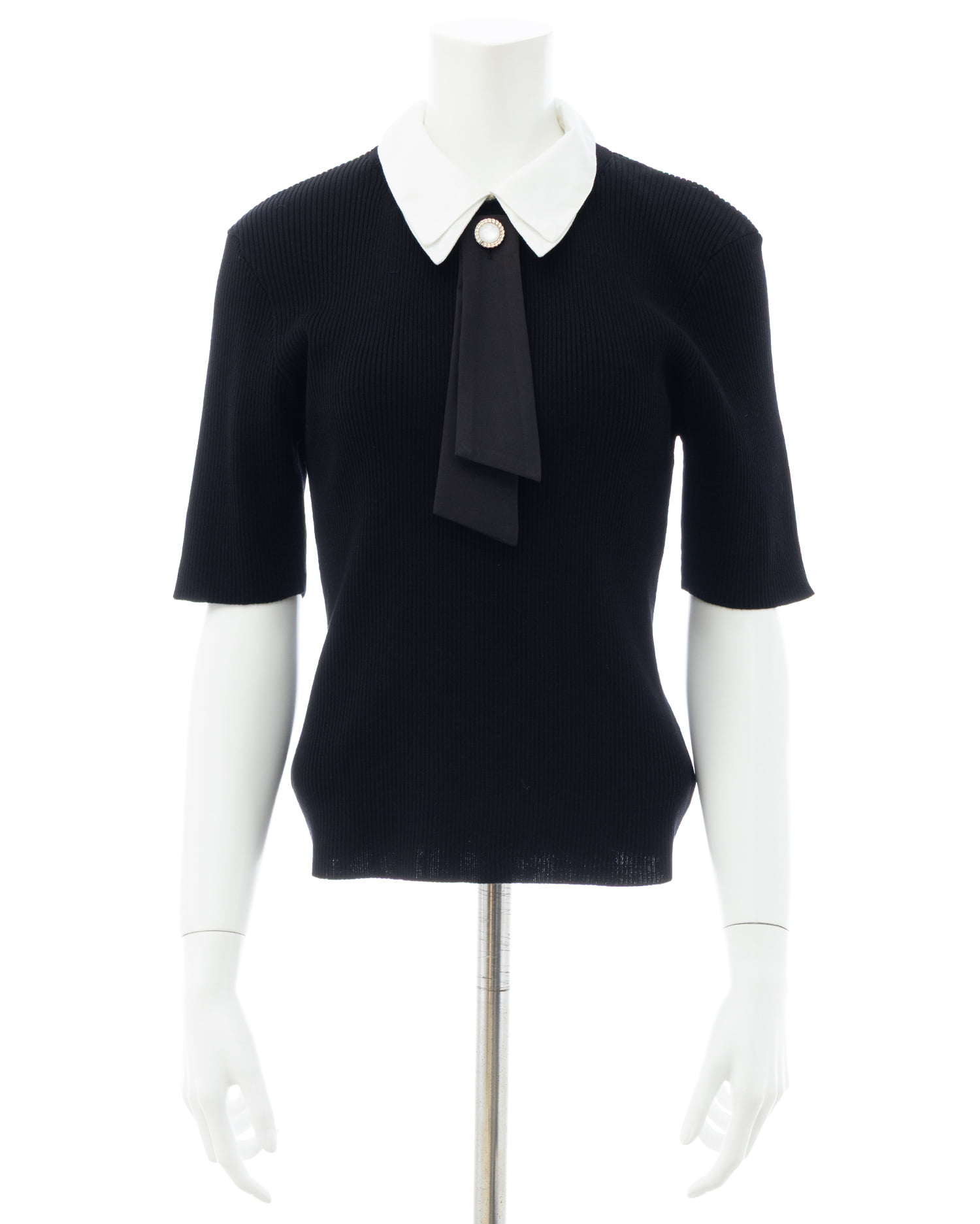 シンプルなリブニットに取り外し可能な襟とボウタイを組み合わせた