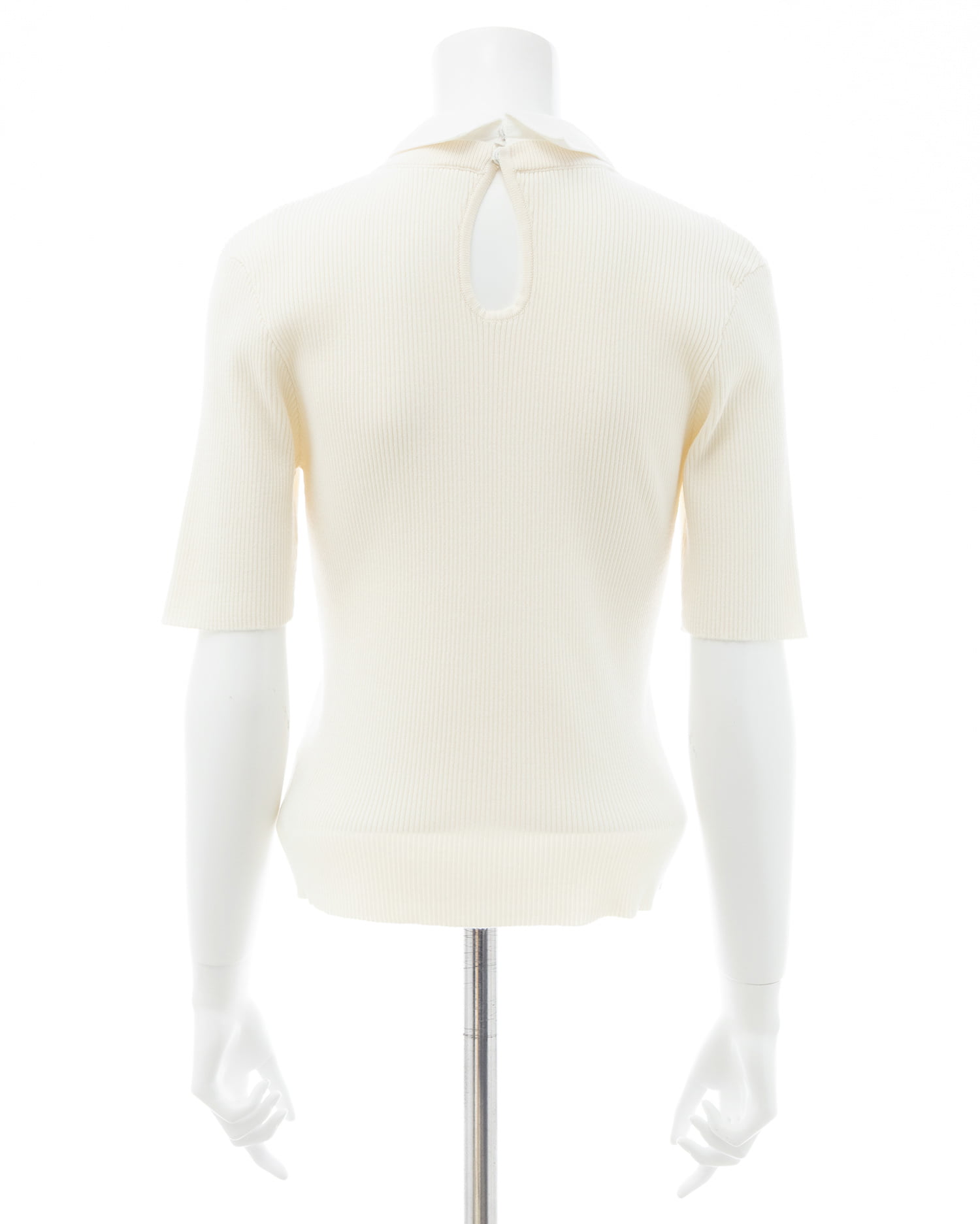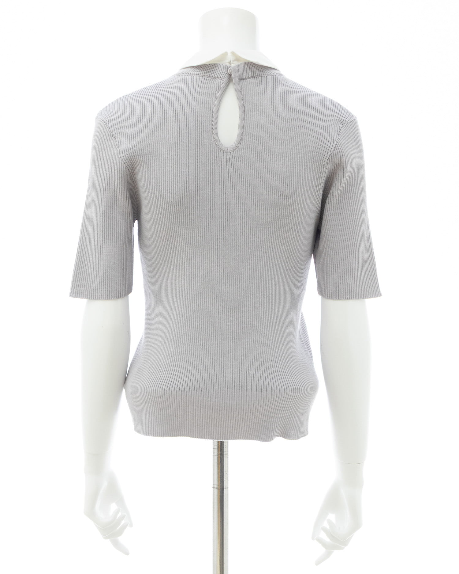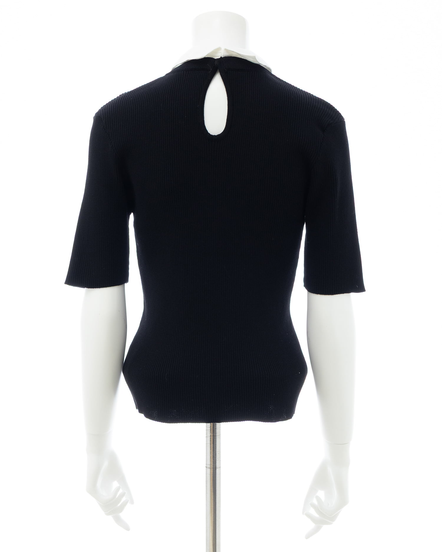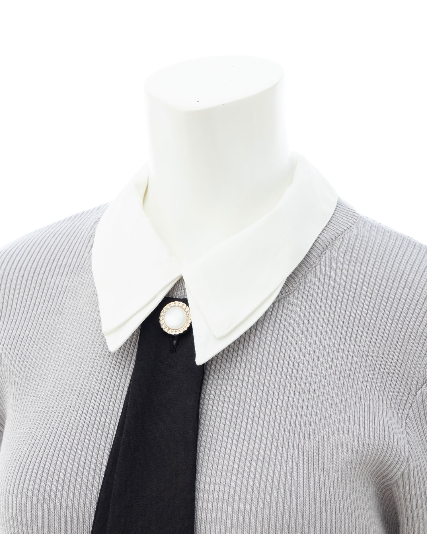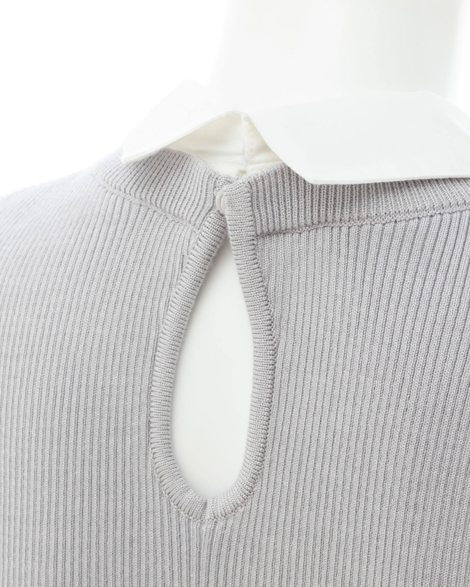 シンプルなリブニットに取り外し可能な襟とボウタイを組み合わせた