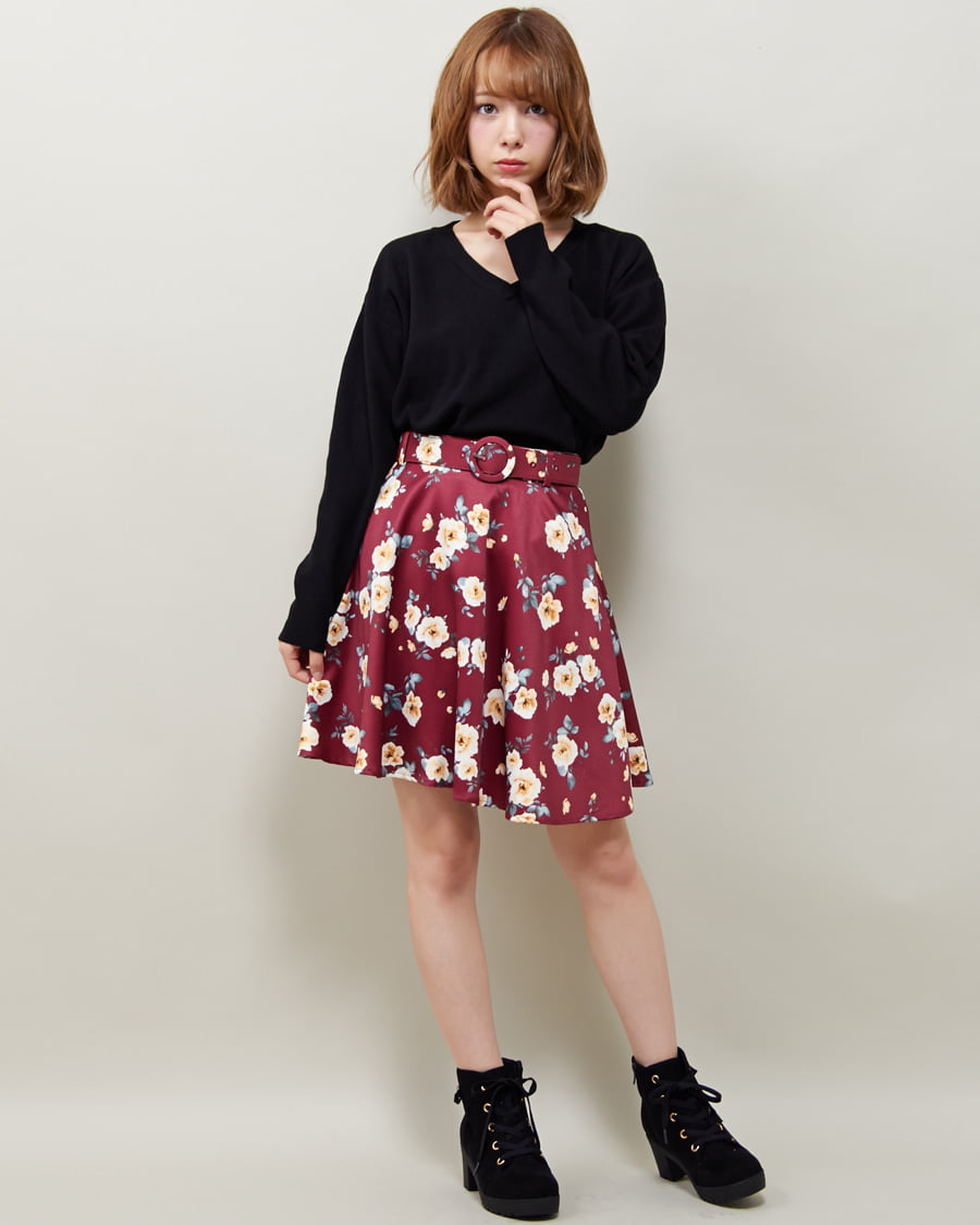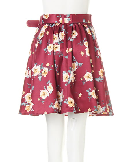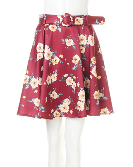 【1174-342219 共ベルト付花柄フレア/スカート/B】