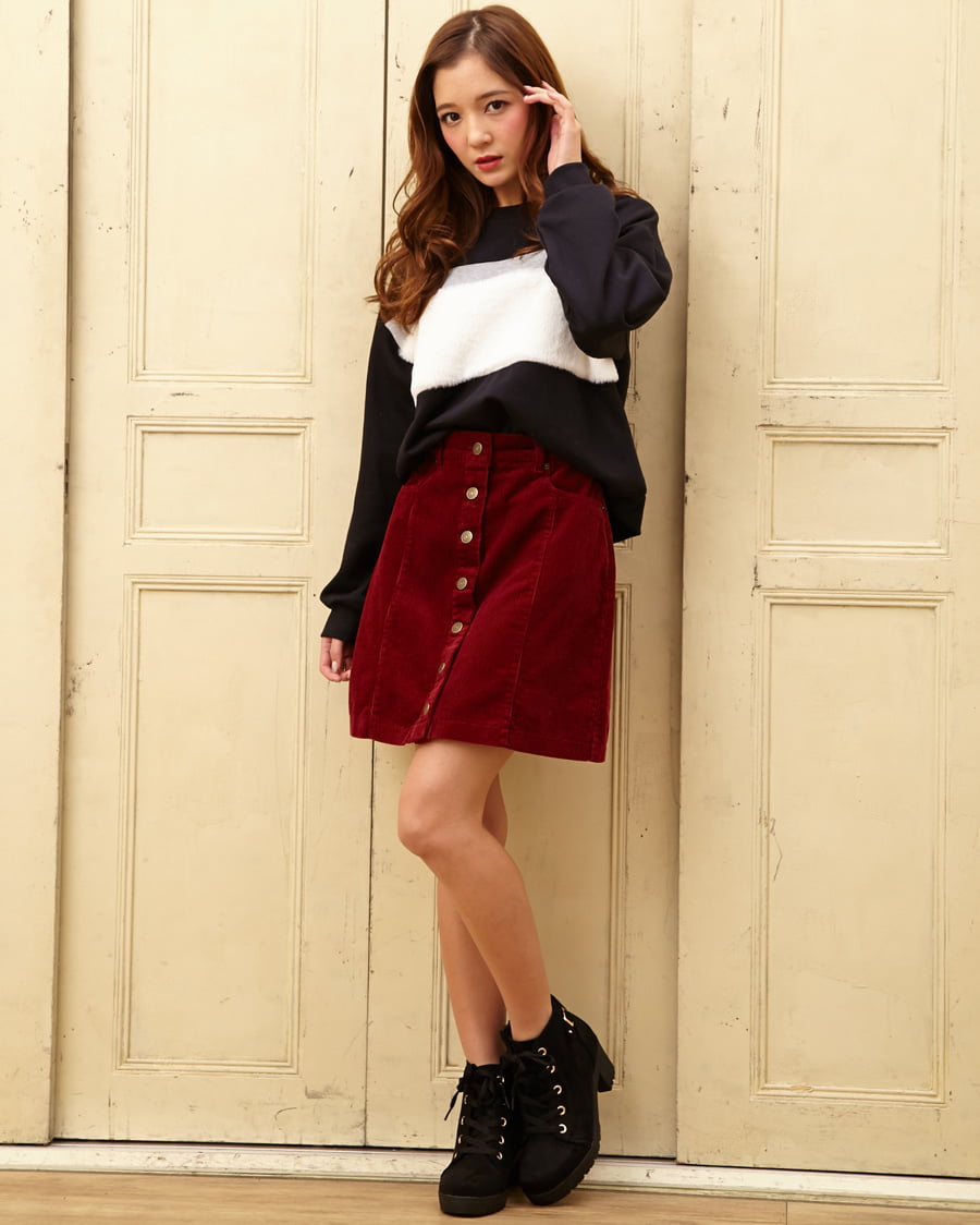 ファー切り替えバイカラー裏毛トップスとコーデュロイ前ボタン台形スカートのSET☆