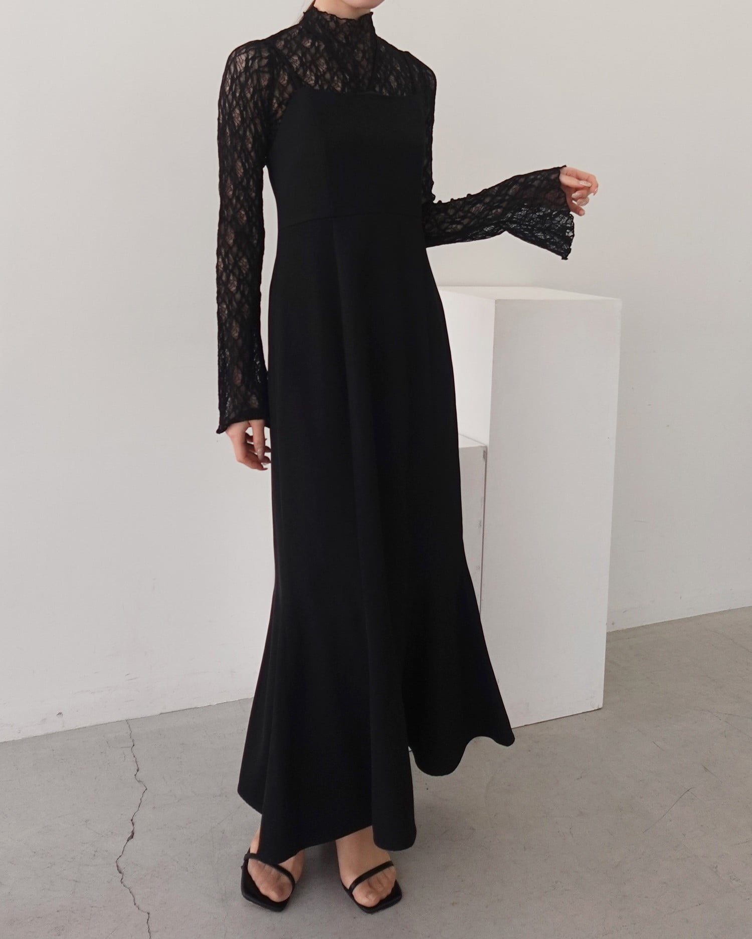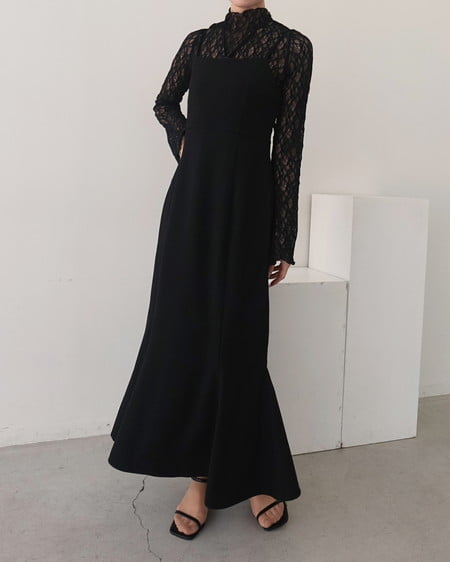 顔まわりを華やかに見せるハイネックデザインもポイント。