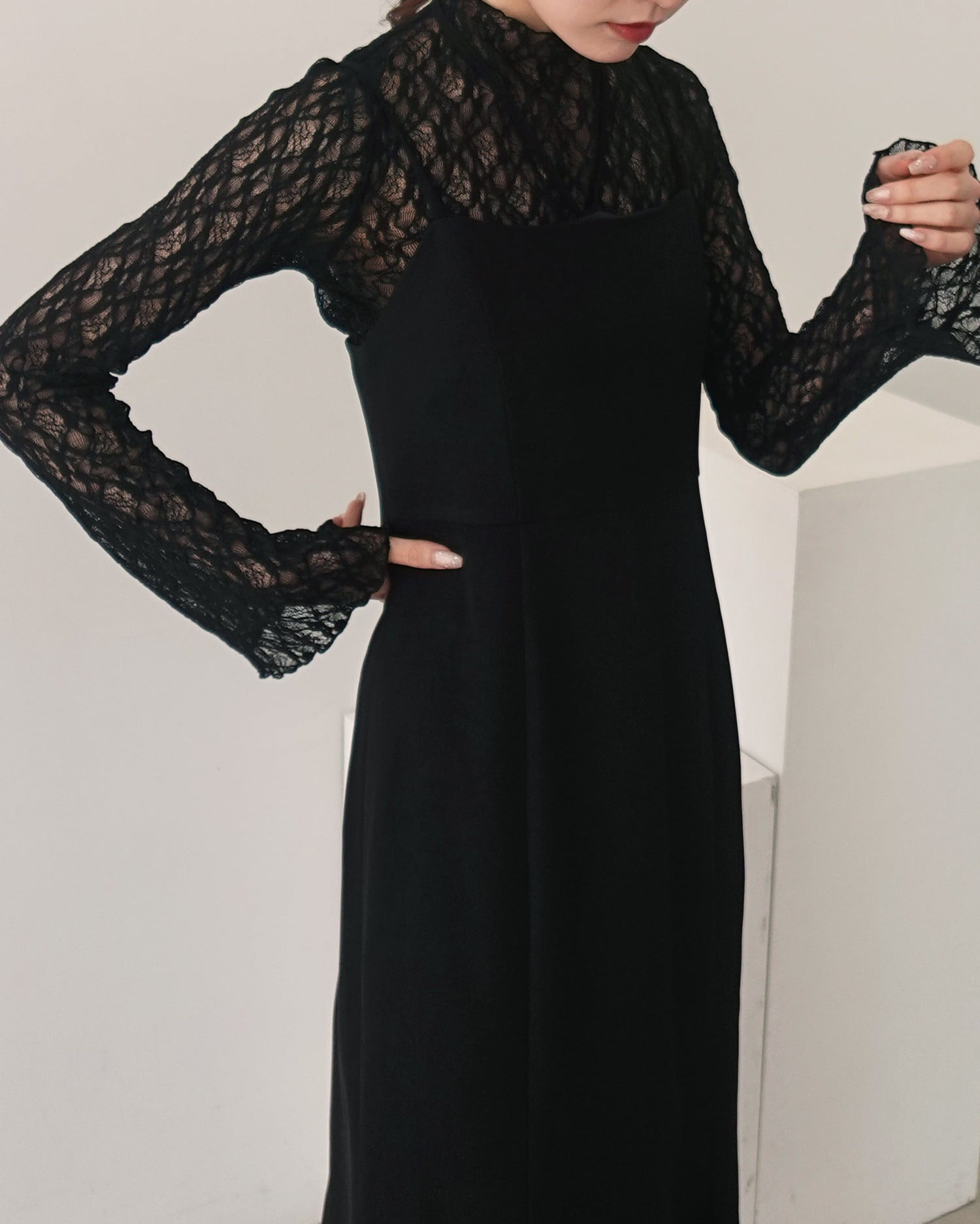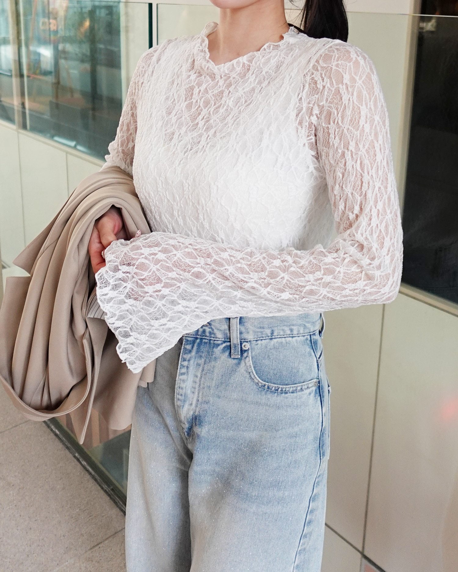 ほんのり透ける素肌とのコントラストを楽しめる総レーストップス。