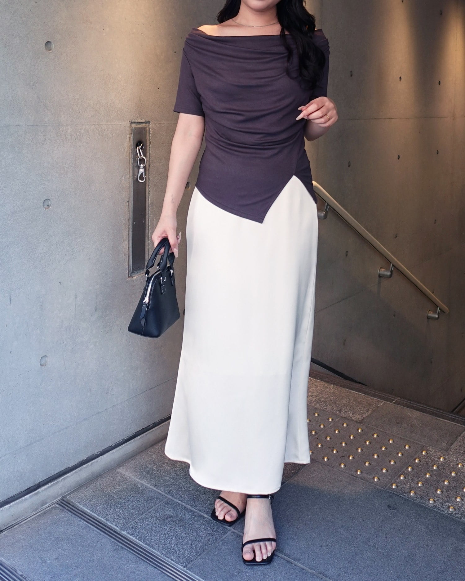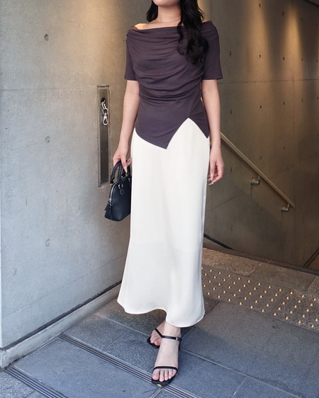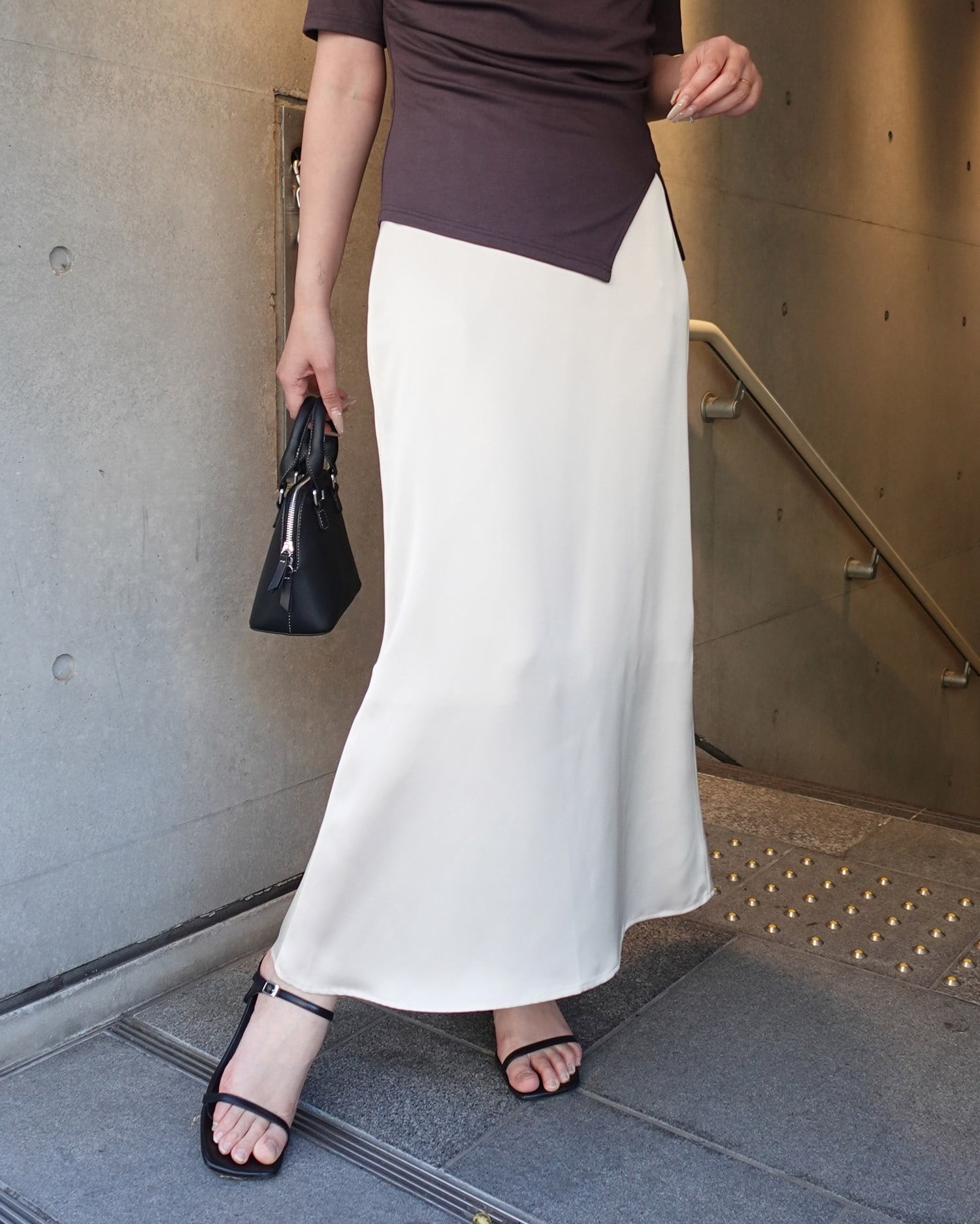 光沢のあるサテン生地で仕立てたマーメイドシルエットのロングスカート。