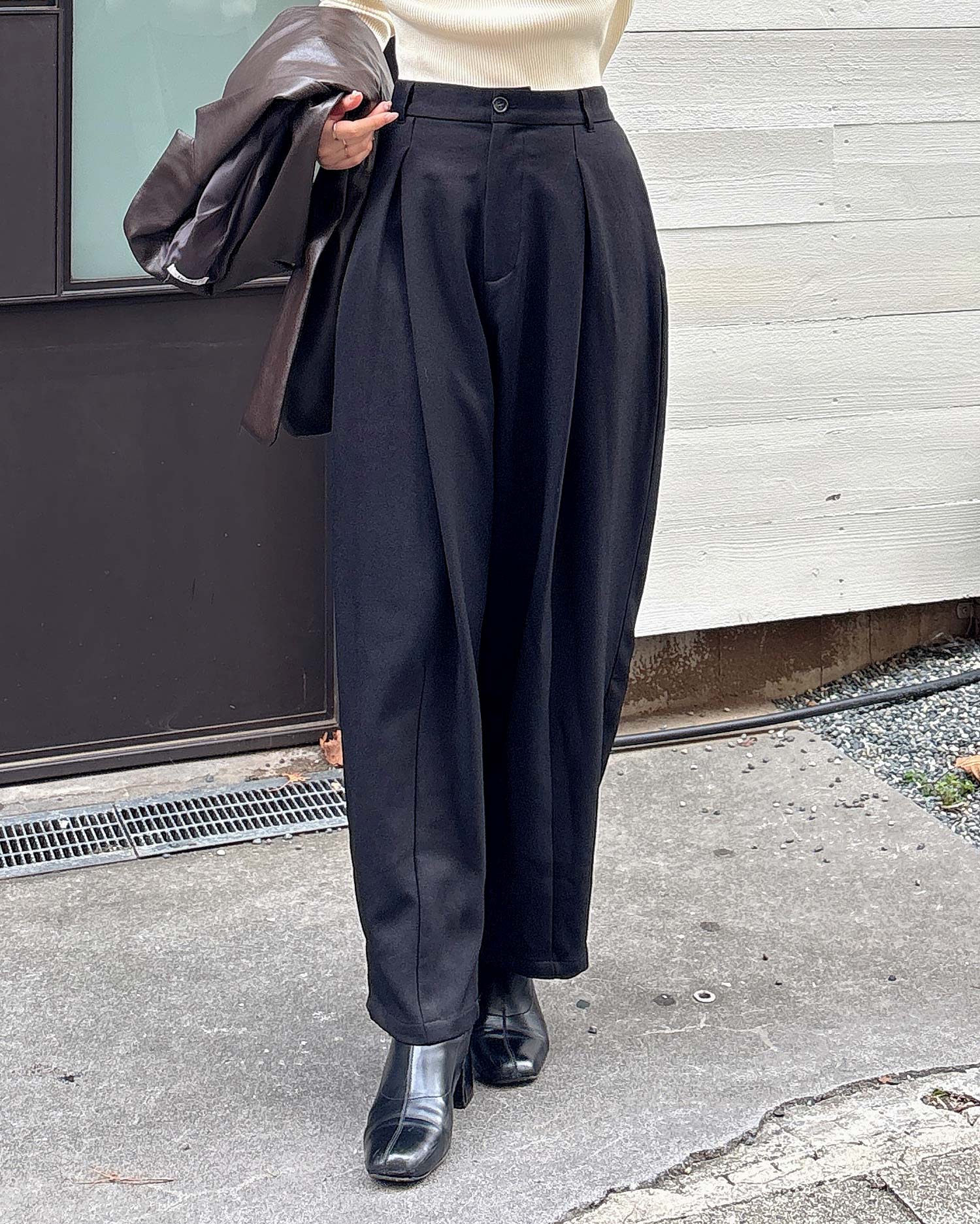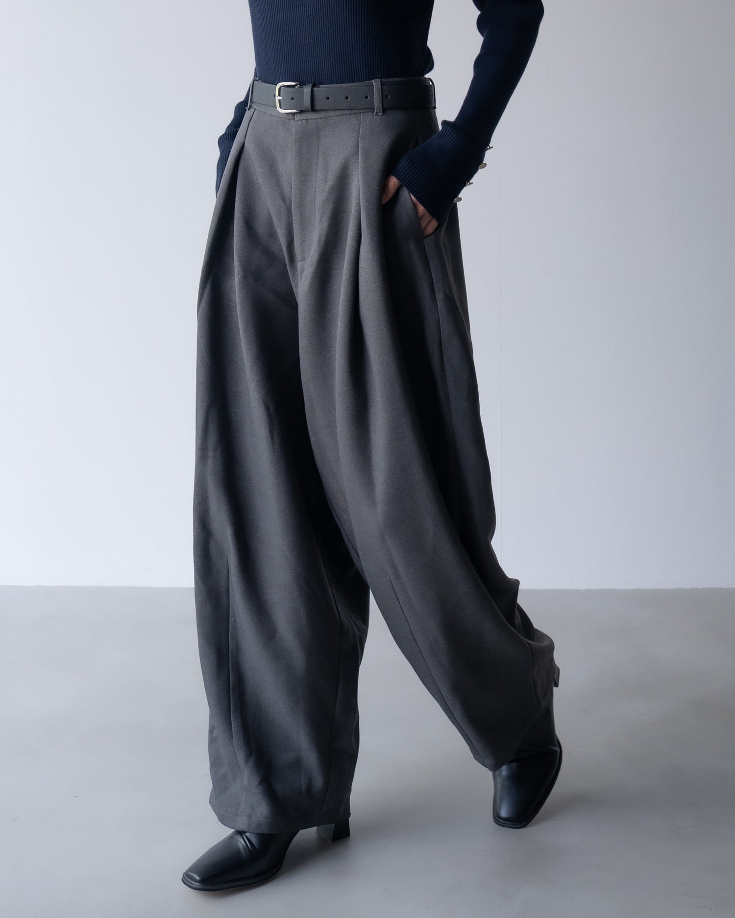 ボリュームのあるコクーンシルエットのキレイめパンツ。