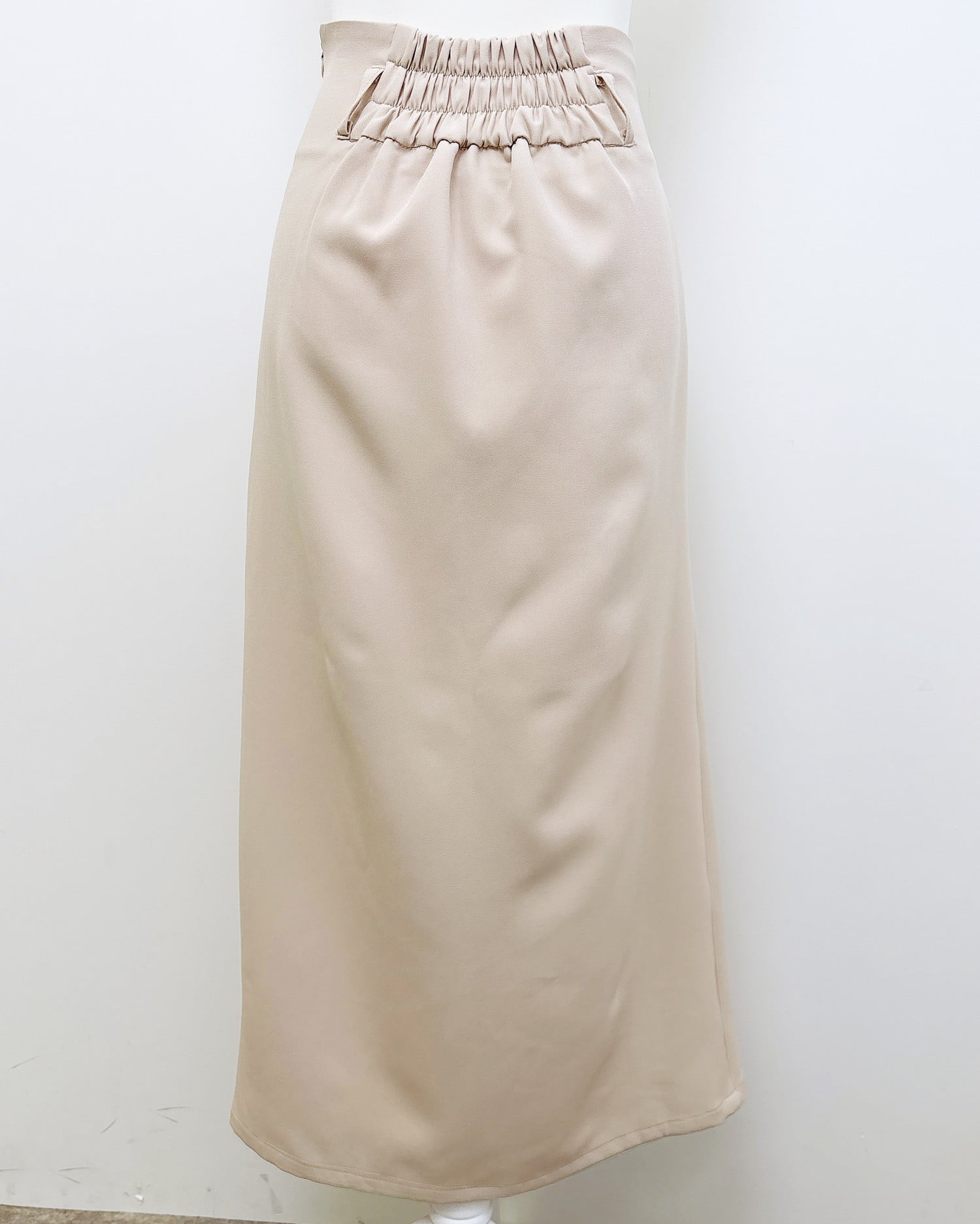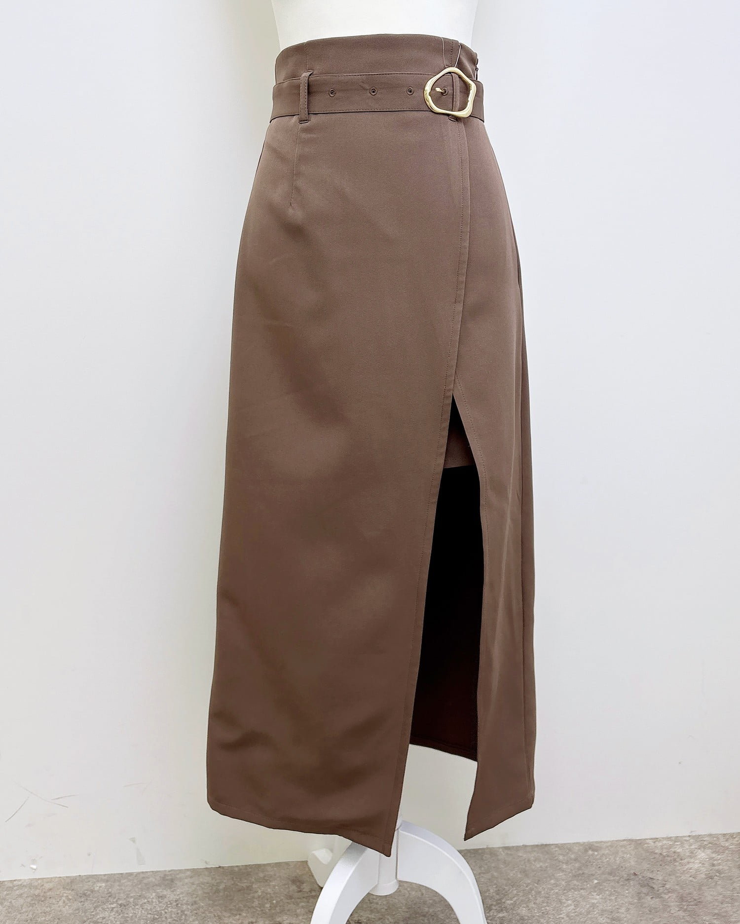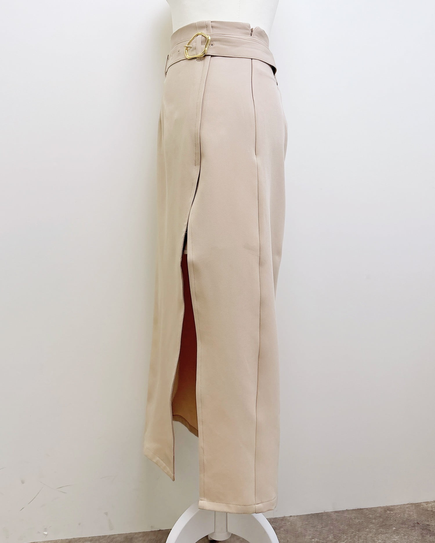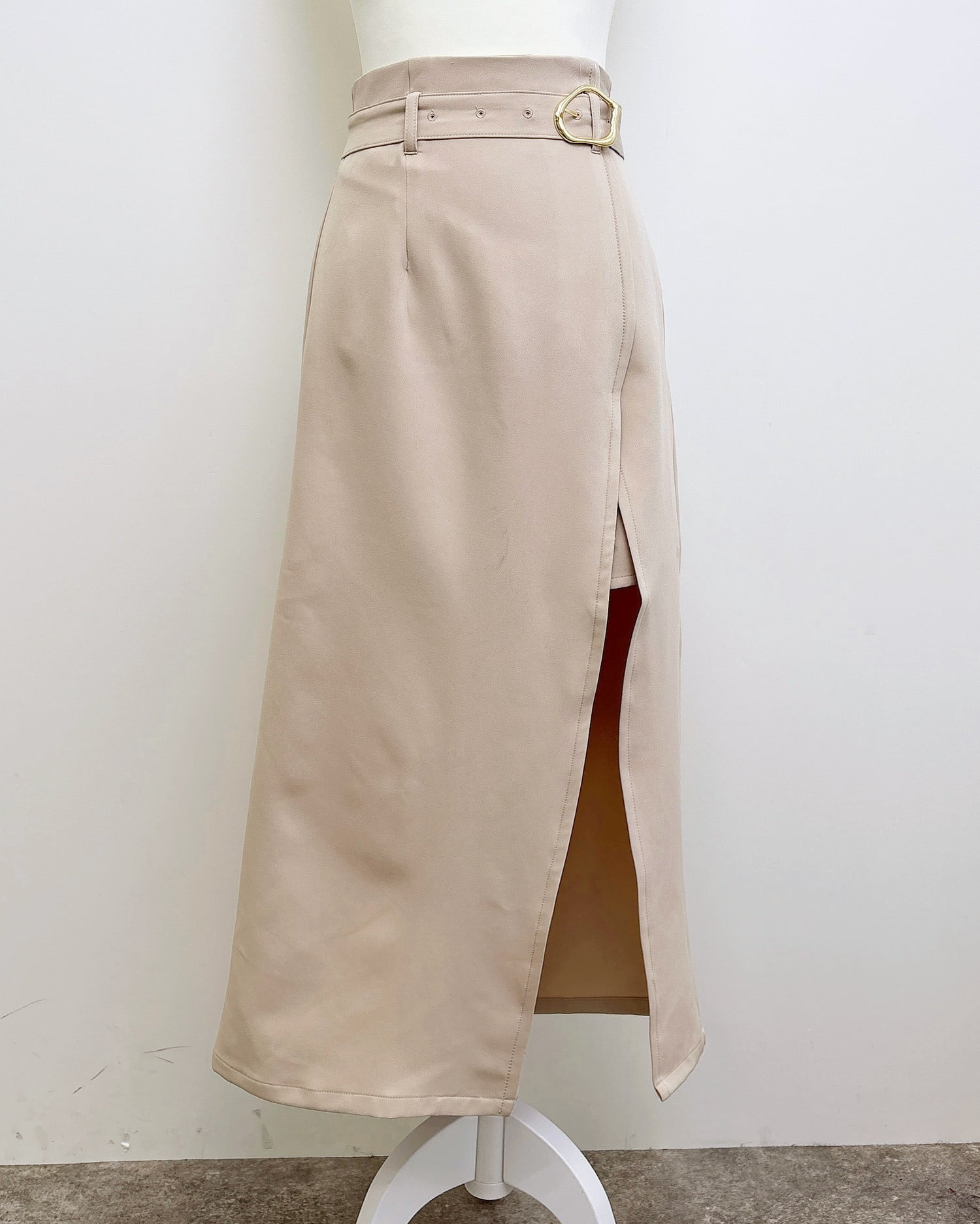 【大ぶりのメタルバックルが目を惹く、上品さと存在感を兼ね備えたIラインスカート】