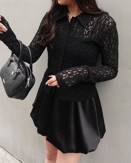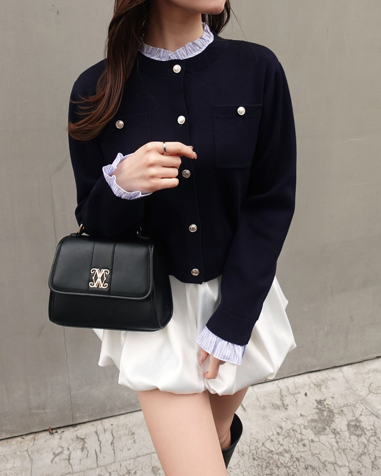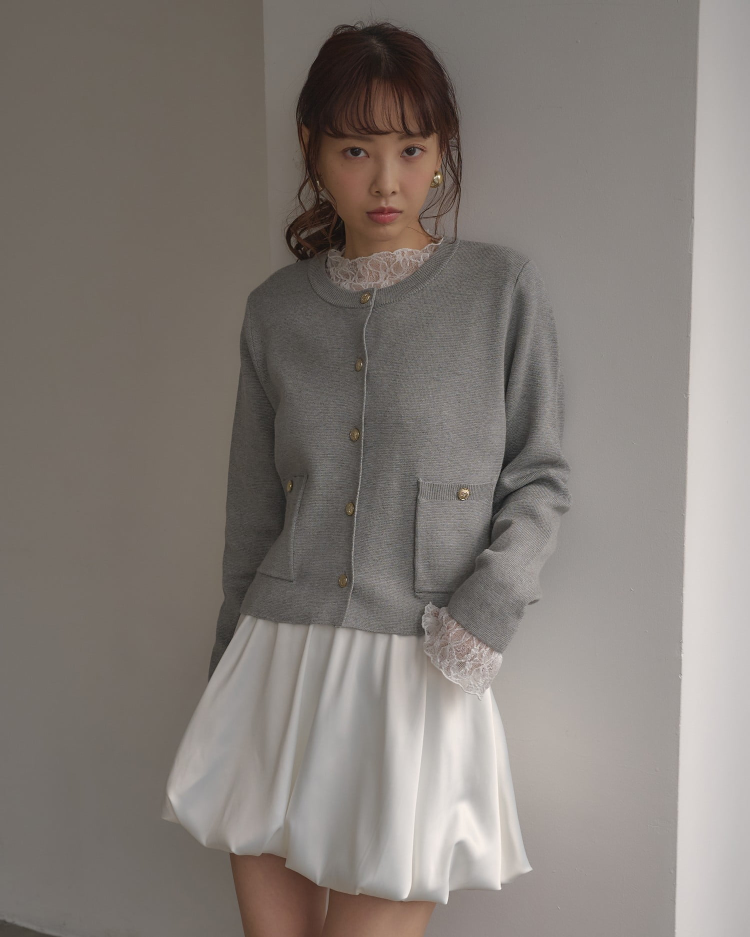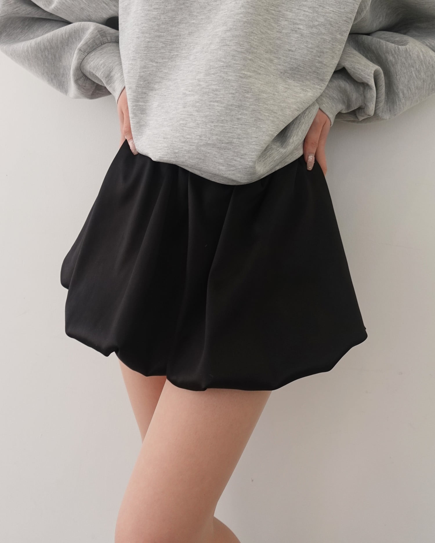 バルーンシルエットとサテンの光沢で大人キュートに仕上げた